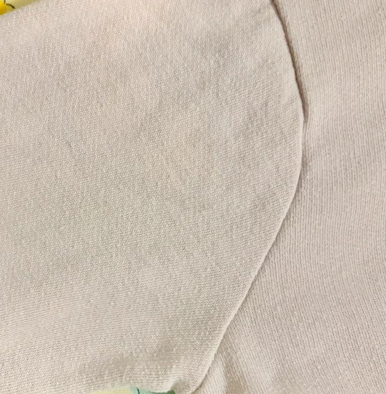 Mikina bola raz oblečená a vypraná, vďaka čomu získala , mierne „batikový“ efekt s jemne svetlejšími odtieňmi na niektorých miestach. Tento detail je ledva viditeľný.