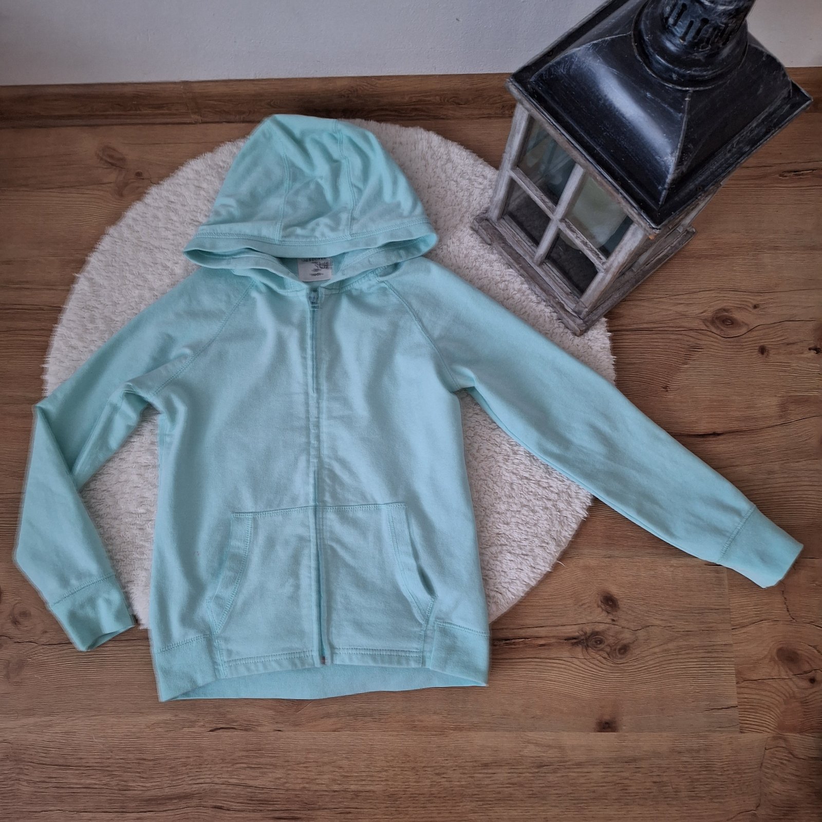 Ľahká tenká zelená mikinka na zips s kapucňou, veľkosť 11-12 rokov, značka F&F, vzadu malý fliacik
