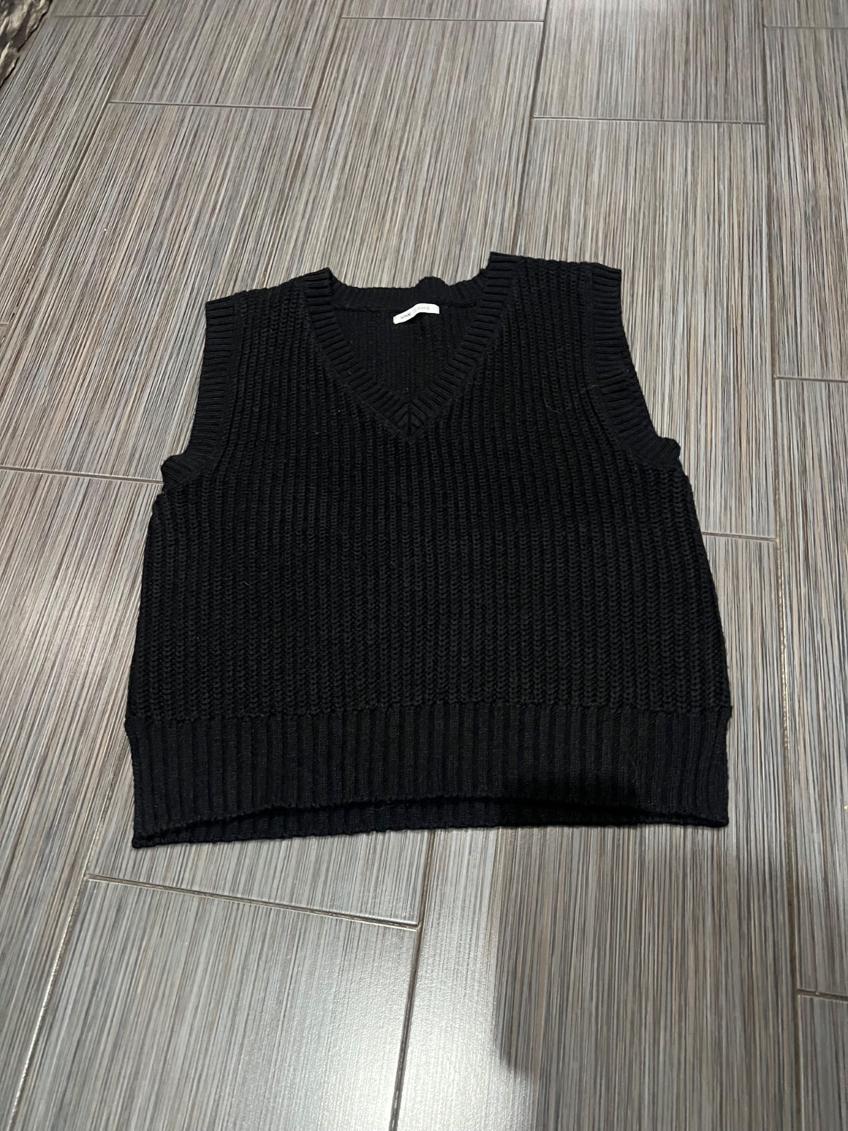 Cierna pletena vesta alebo svetrik bez rukavov, zapinanie na cvoky, v kapucke je cierna kozusina. Vesta je v peknom nosenom stave, par zmolkov po prani. Velkost S.