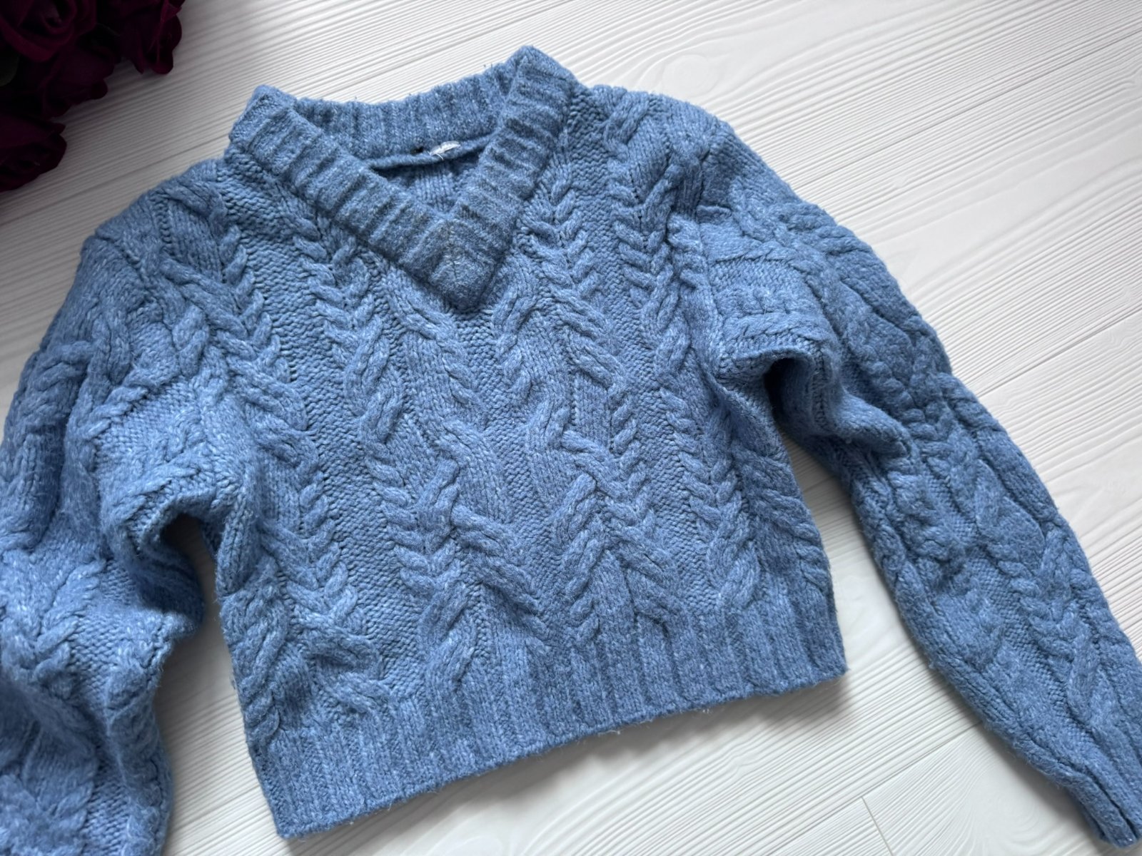 Pletený sveter s vrkočovým vzorom.