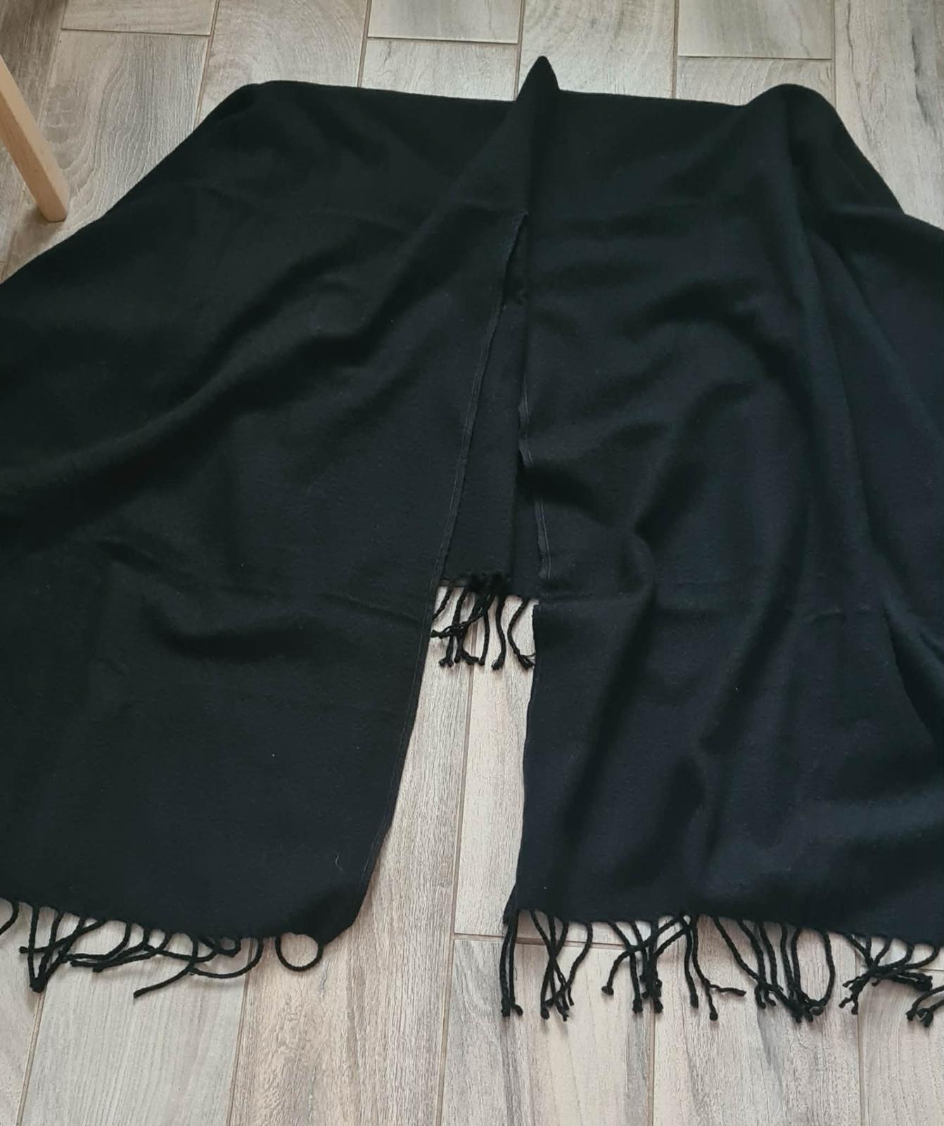 Čierne pončo so strapcami super ukáže s opaskom, je teplé - dekovina, druhá foto na ukážku strihu.