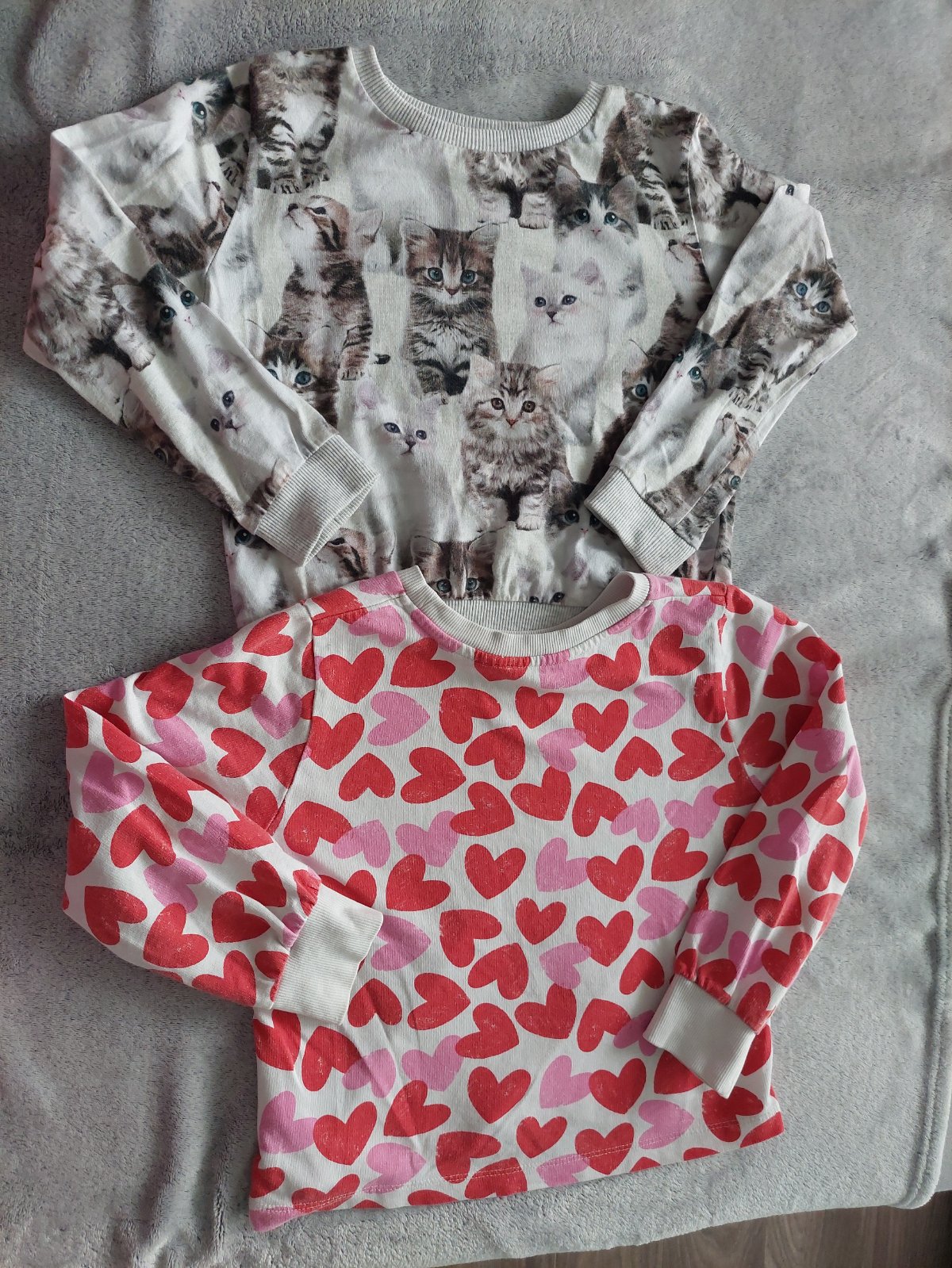 2 krásne mikinky, motív mačičiek a srdiečok, tenšie,ako hrubšie tričko,bez chýb, veľkosť 110/116 z H&M, cena za ks 5€