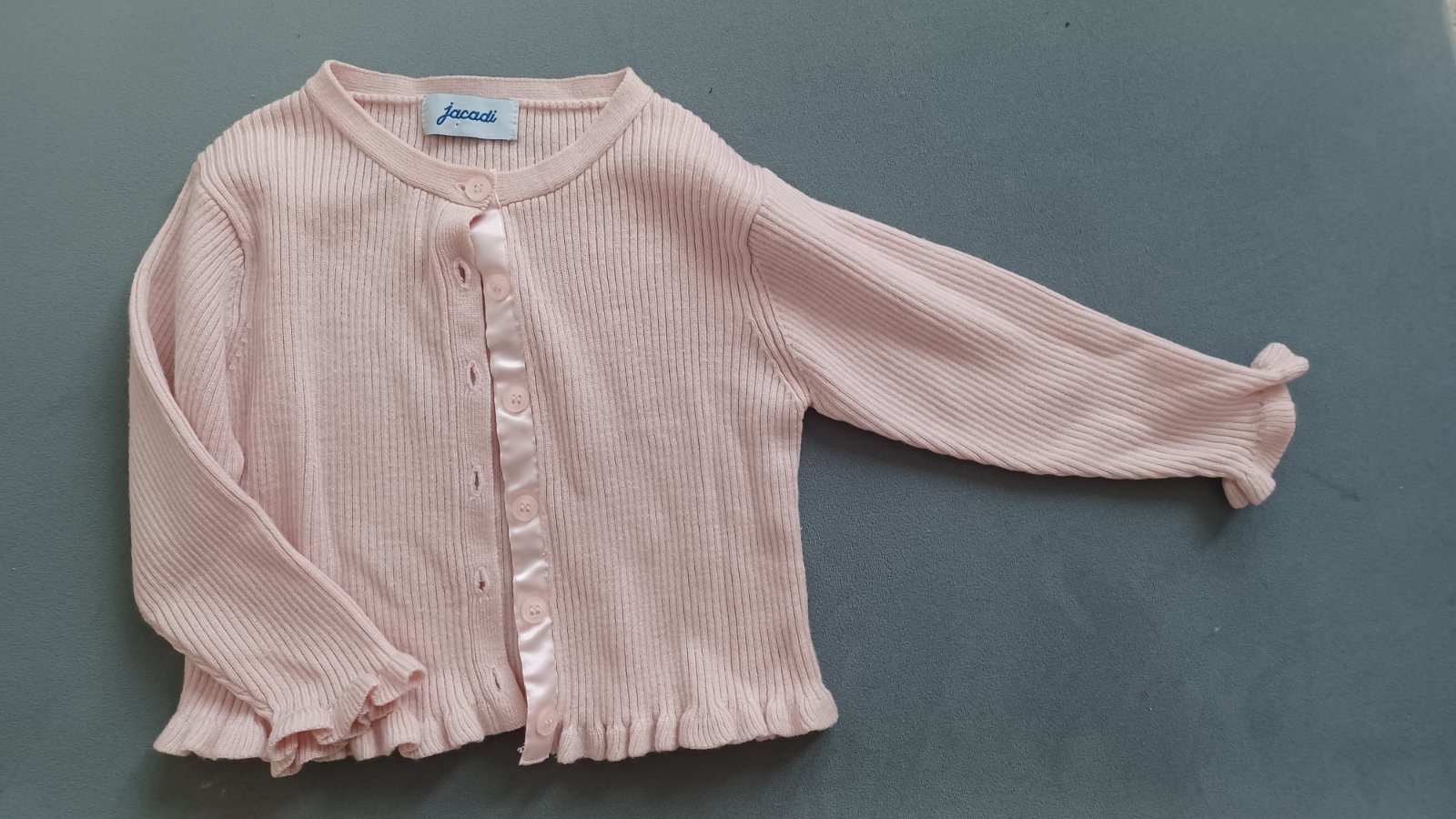Nadherny jemny svetrik francuzskej znacky Jacadi s vybornym zlozenim 50%vlna 50% acryl. Da sa dat v pracke. Bez chybicky, ako novy. Velkost ca.92, ale urcite aj vacsie, aj do 110. S jemnymi volabikmi na rukavoch a na spodu, aj ako bolerko na saty. Nosili sme malinko, dcerka nie je satova :-)