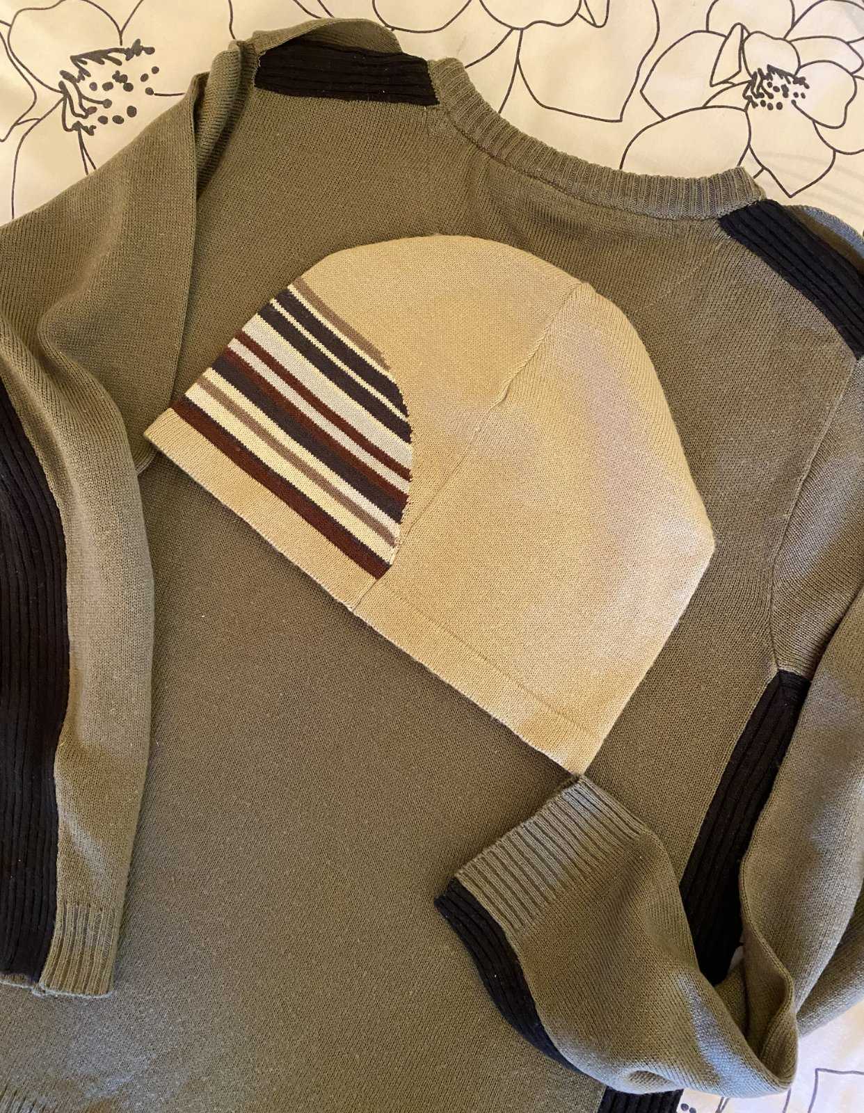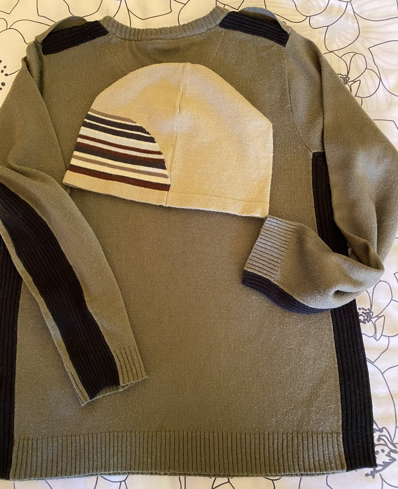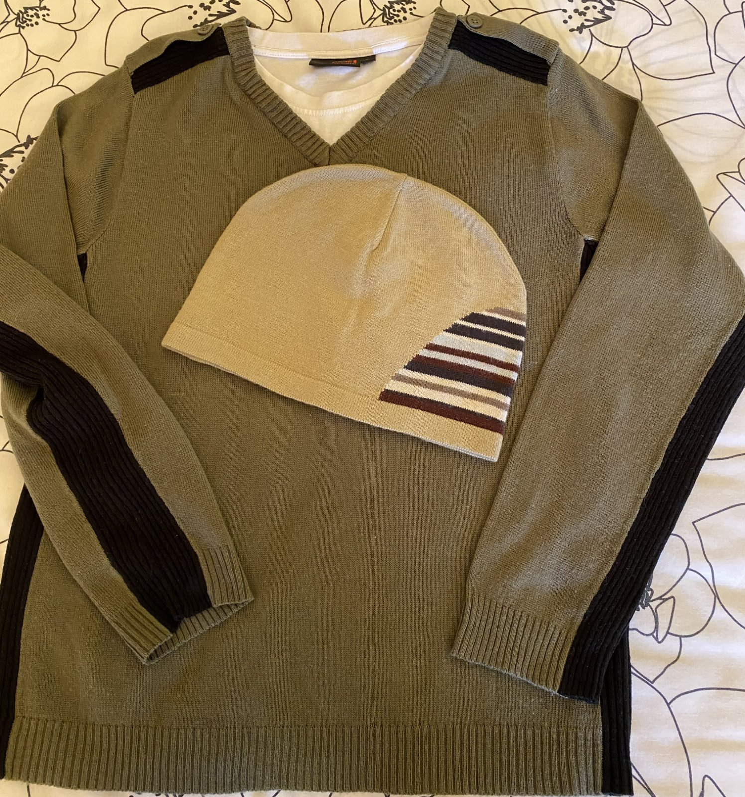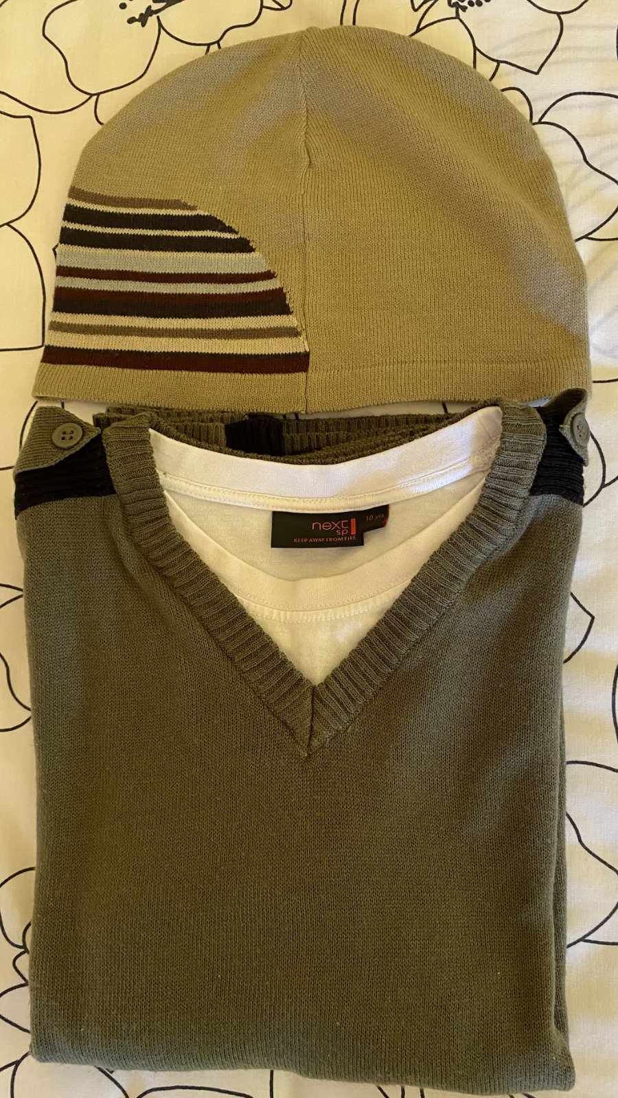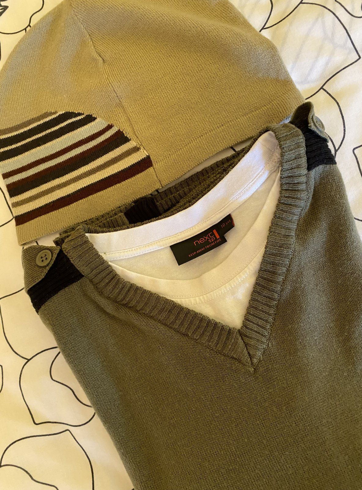 Tenší sveter - pulóver s dvojitým efektom zn. Next v. 146/152, materiál tenší acryl, kombinácia farieb zelená - khaki + čierna, vo výstrihu dvojaký efekt - biela, v peknom nosenom stave, bez poškodenia. Miery merané v kľude: šírka v podpazuší: 43cmx2, dĺžka meraná od krku: 57 cm, dĺžka rukáva od krku vrátane lemu okolo krku: 64 cm + tenšia čiapka zn. Next - UNI veľkosť, materiál 100% acryl - tenšia pletenina, pružná, málo nosená. Miery merané v kľude: šírka: 25cmx2, výška: 18cm..