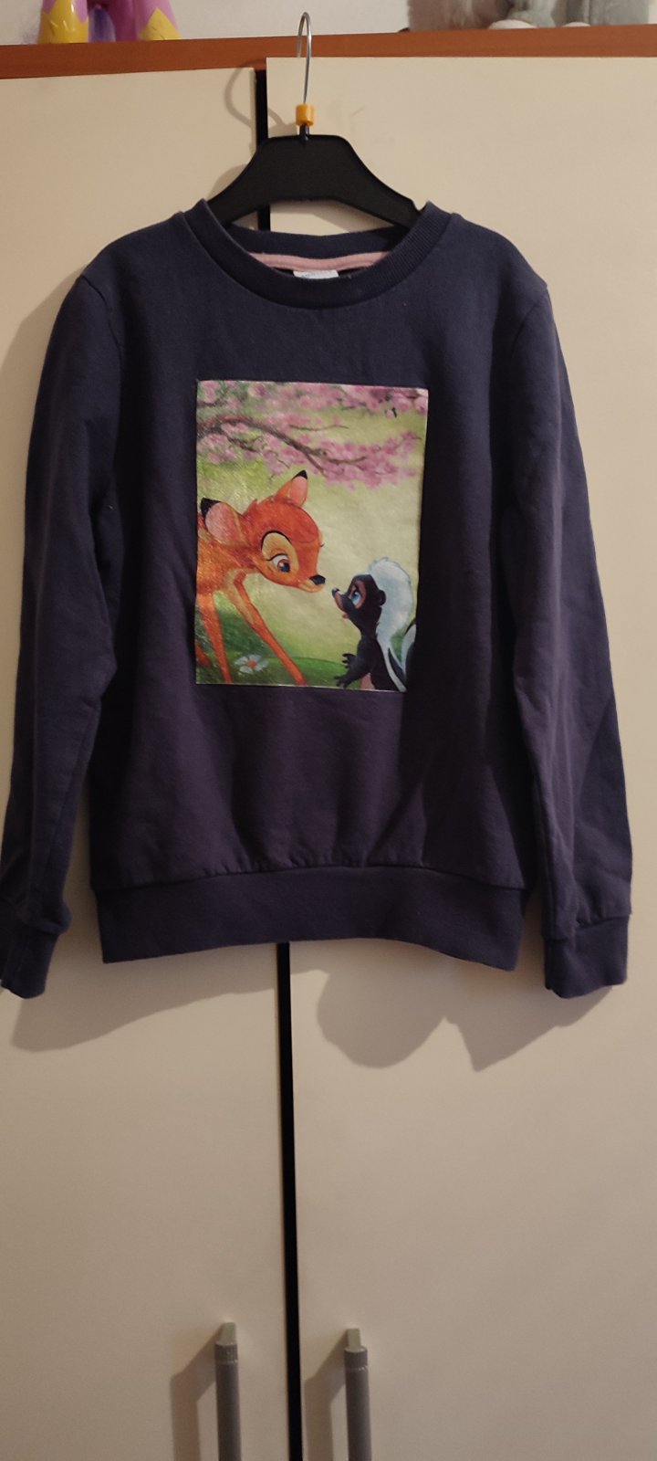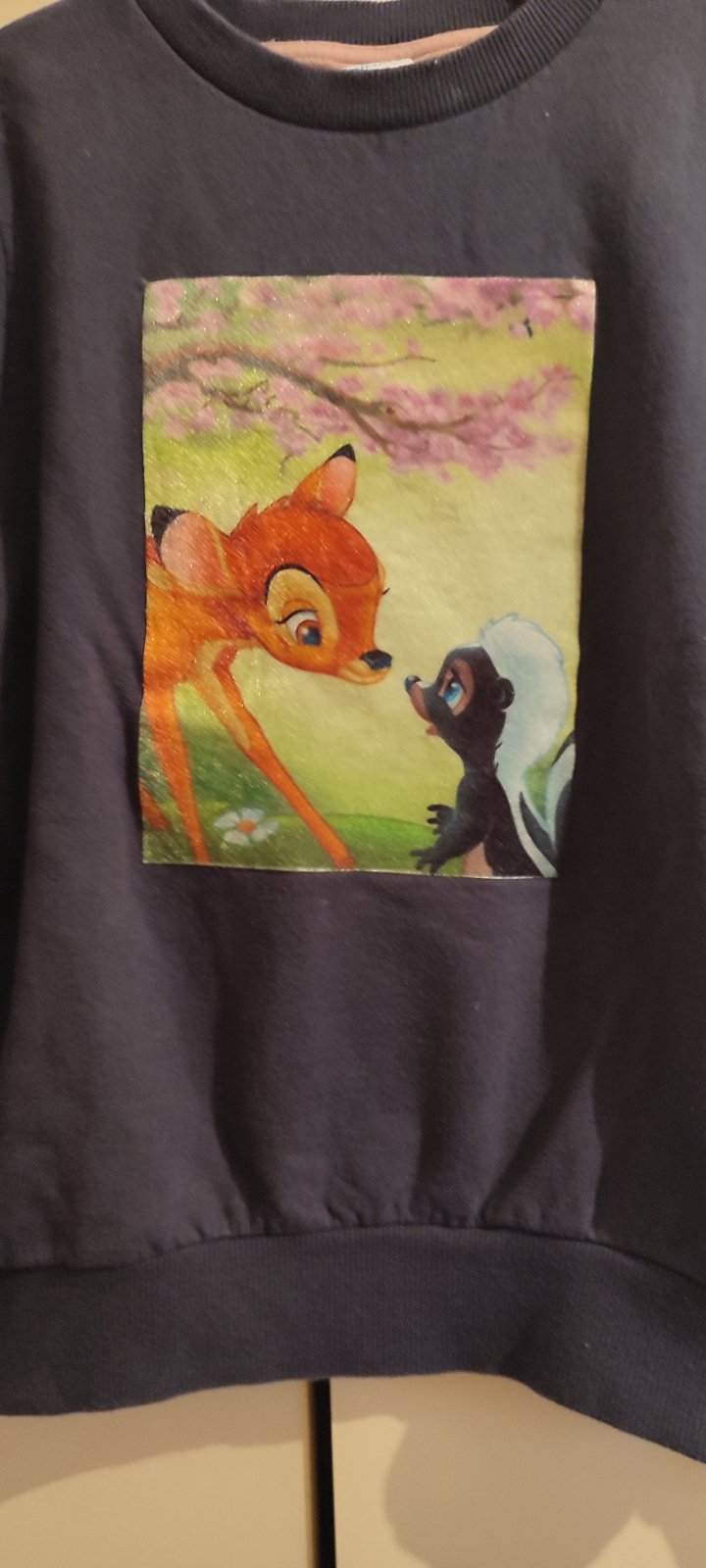 Mikina je bez poškodení, písaná 134ale je menšia, potlač obrázka je semiš,čo.dodava mikine zaujímavosť a stále pestrosť obrázka,bez poškodenia