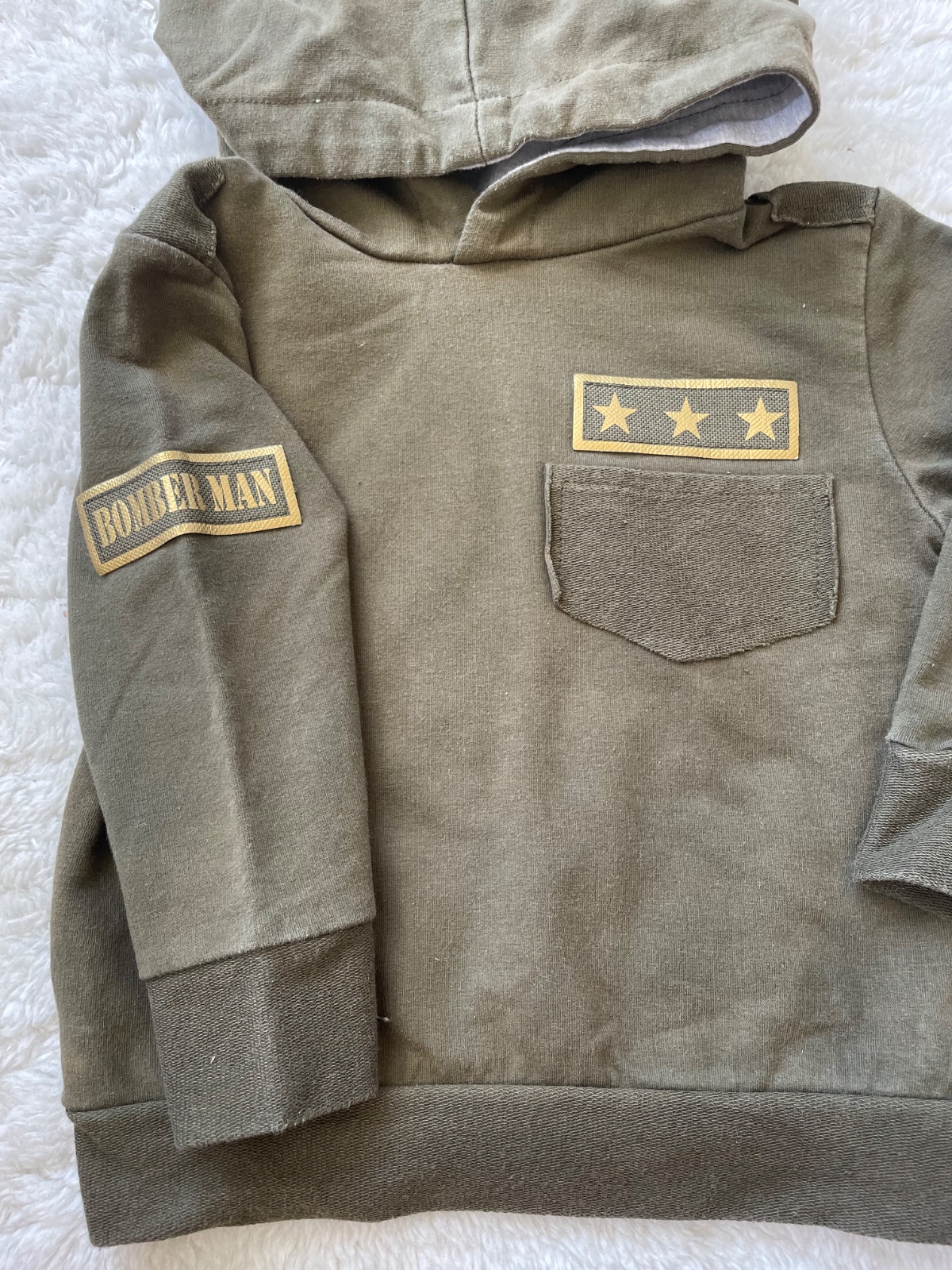 Kahki vojenska mikinka s kapucnou zn. Beee s frajerskymi nasivkami, kapucna v kombinacii so sedym vnutrom, bavlna/elastan, malo nosena, velkost 80