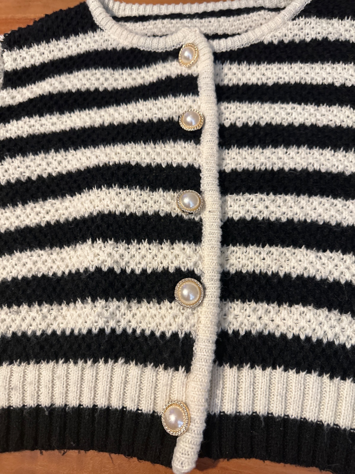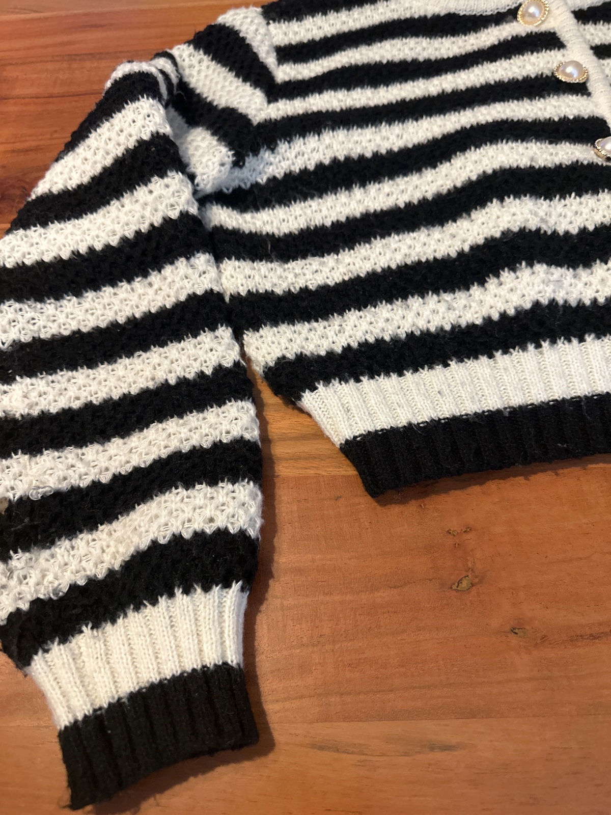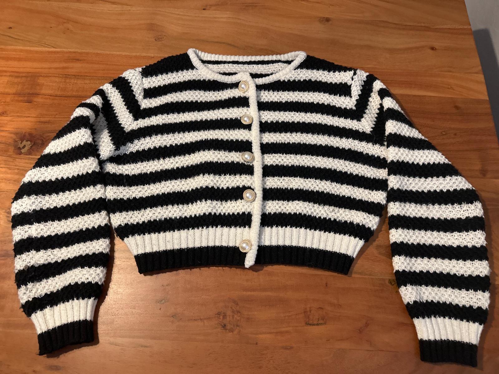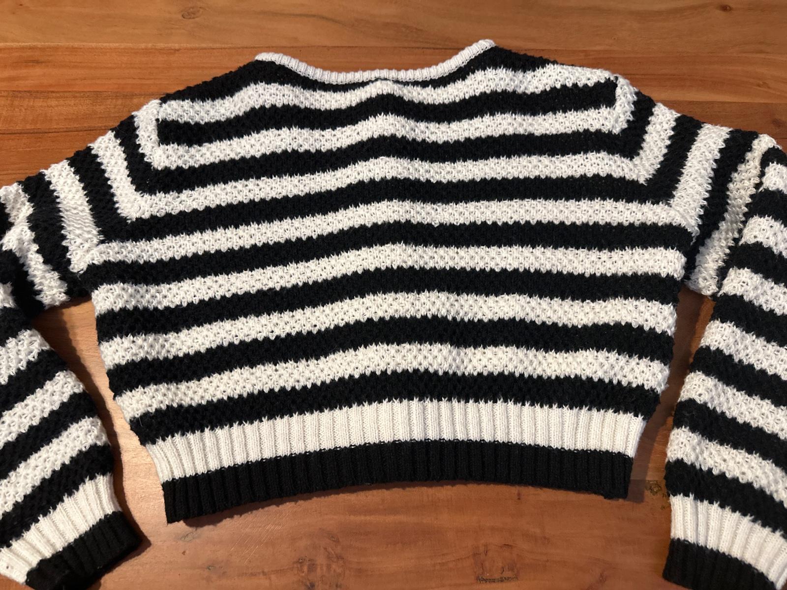 Krátky pletený sveter, čierno biele pásy. Zaujímavý model. Ukončené do patentov. Okolo krku okrúhly výstrih, elegantné gombíky. Príjemný na nosenie. Vhodný k sukni aj k nohaviciam. Dĺžka 42 cm, šírka hrudník 2 x 50 cm, rukáv od pleca 58 cm. Bez poškodení.