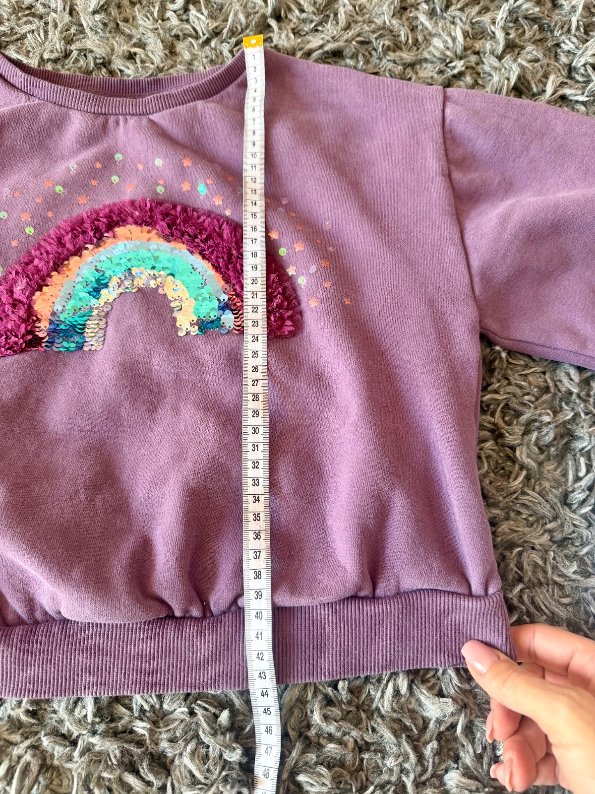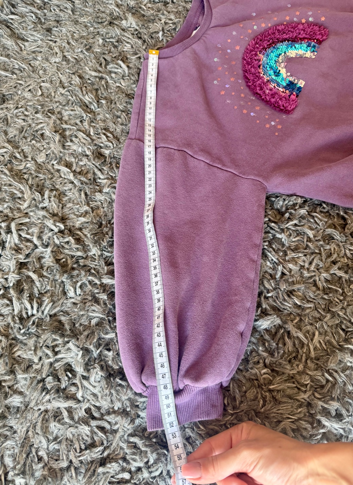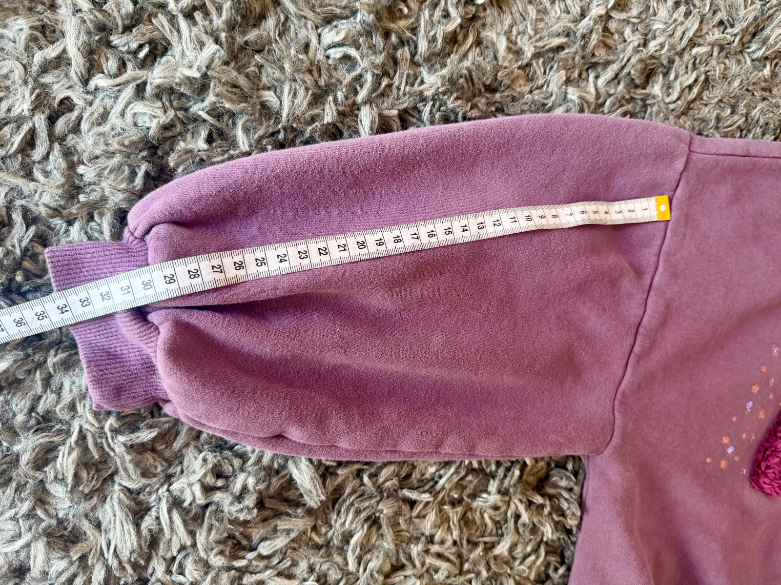 Veľkost pisana na mikinke je 140, za mňa skor 128/134, aby v nej dieta nevyzeralo ako vyrastenec. Krasny stav, bez poskodeni.