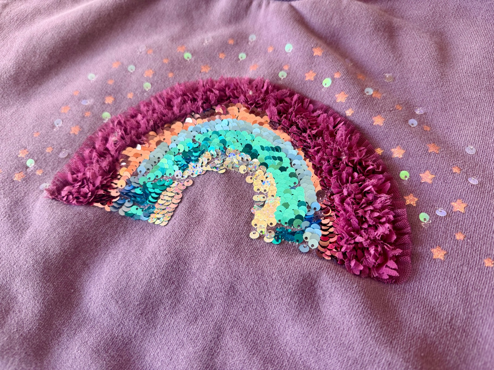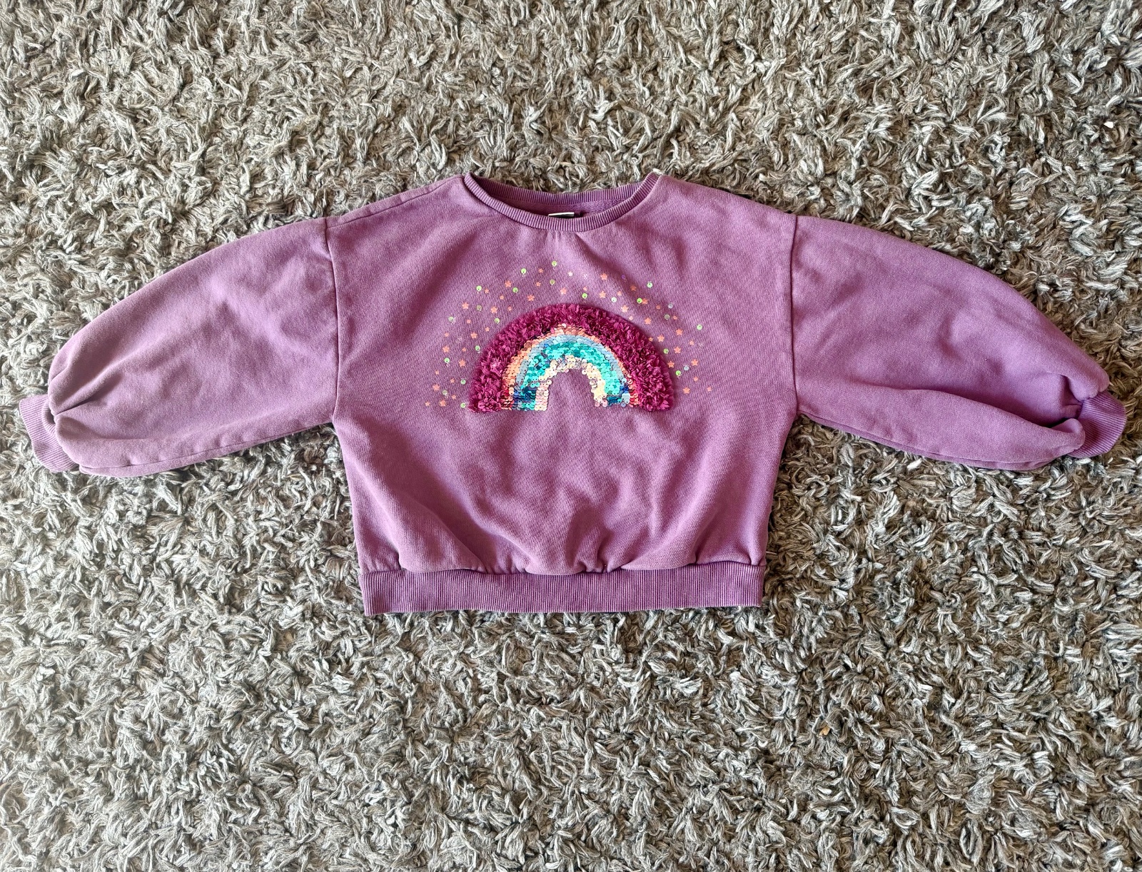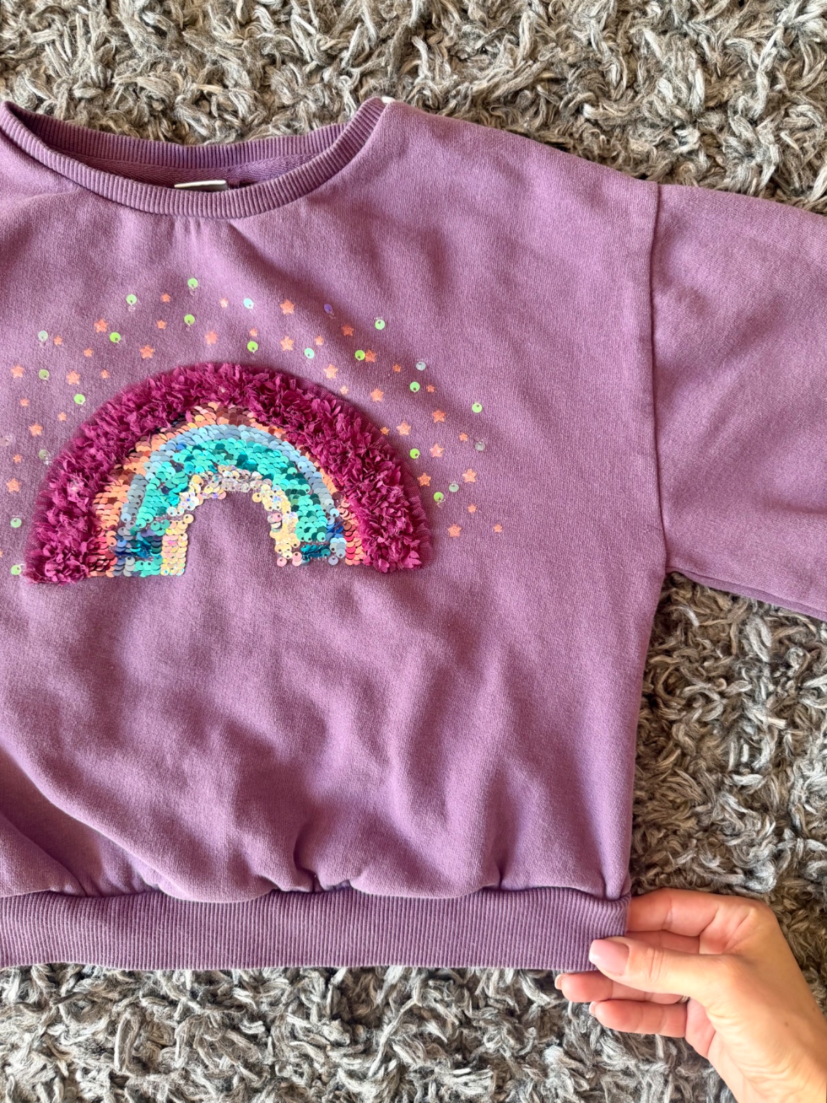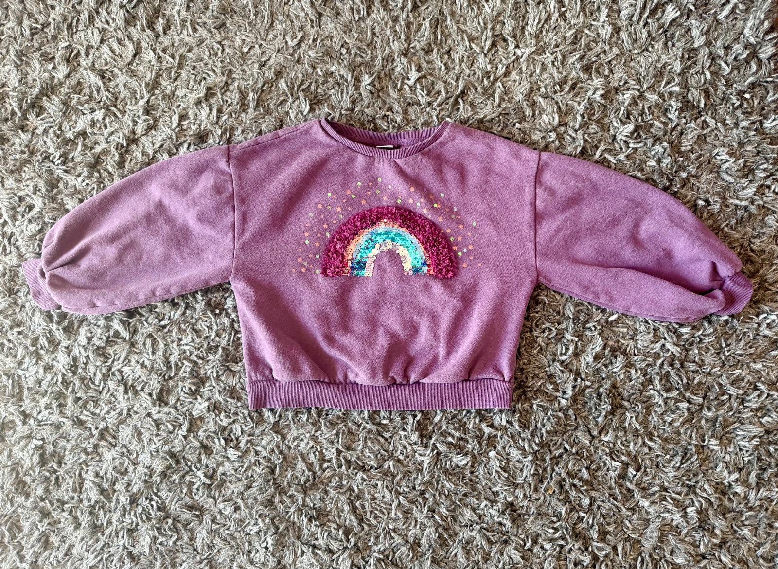 Veľkost pisana na mikinke je 140, za mňa skor 128/134, aby v nej dieta nevyzeralo ako vyrastenec. Krasny stav, bez poskodeni.