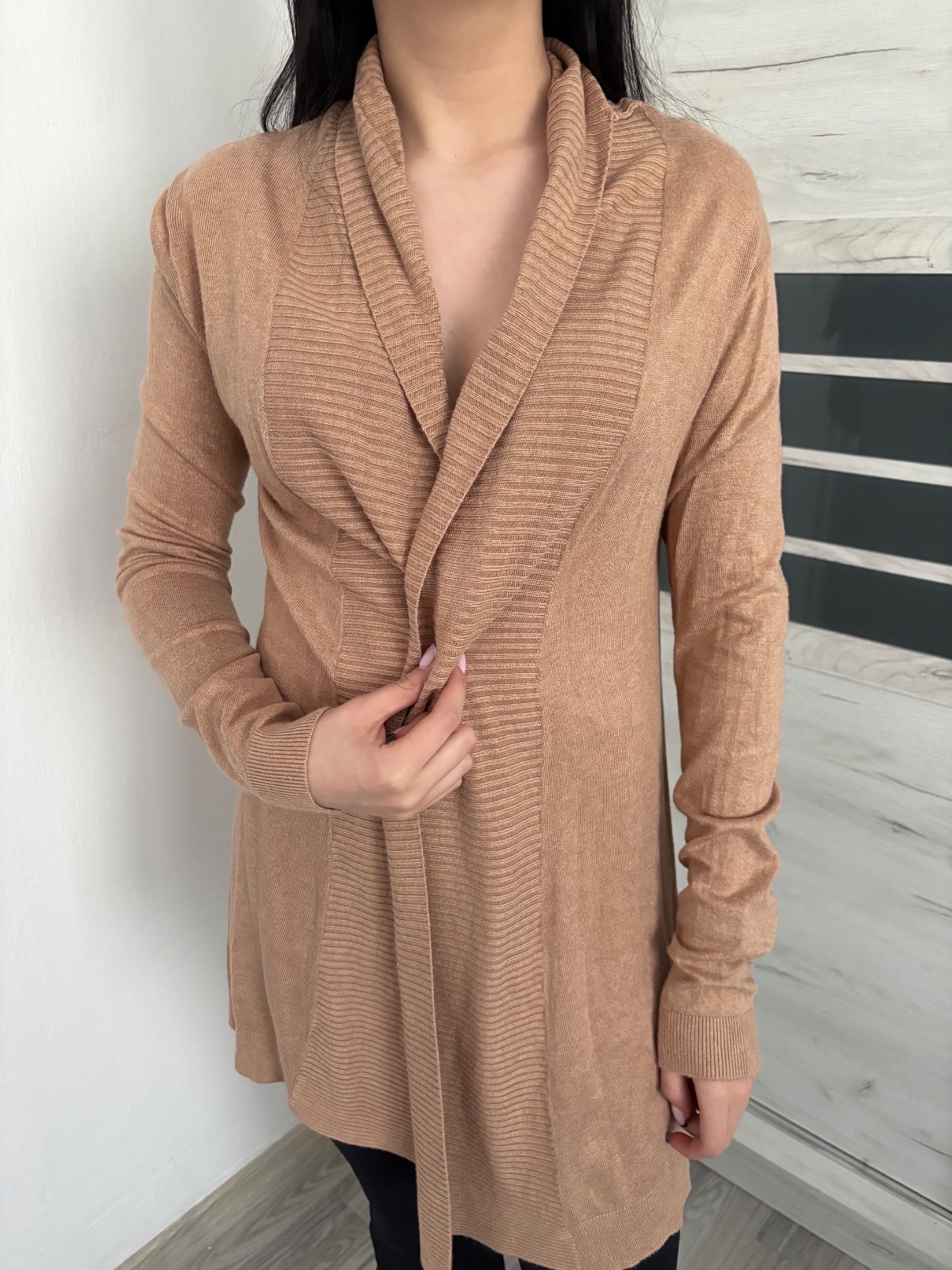 Béžový pletený kardigan, príjemný mäkký materiál, zapína sa na gombíky. Veľkosť uvedená S, ale sedí aj na M a L. Na veľkosť S je oversize strih. Miery hrudník cca: 2x57cm dĺžka: 76cm