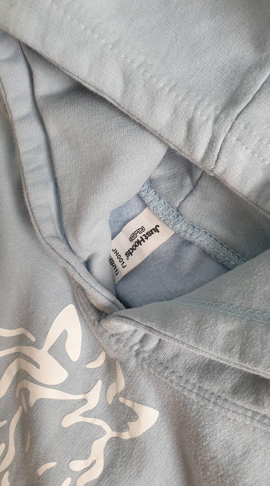 veľmi dobrý stav, bledomodrej farby s bielou potlačou, mierne žmolky a malinká dierka pri vačku no nič hrozné, 80%bavlna a 20%polyester, kapucňa podšitá, s bielou potlačou, poštovné 3,50€(doporučene)