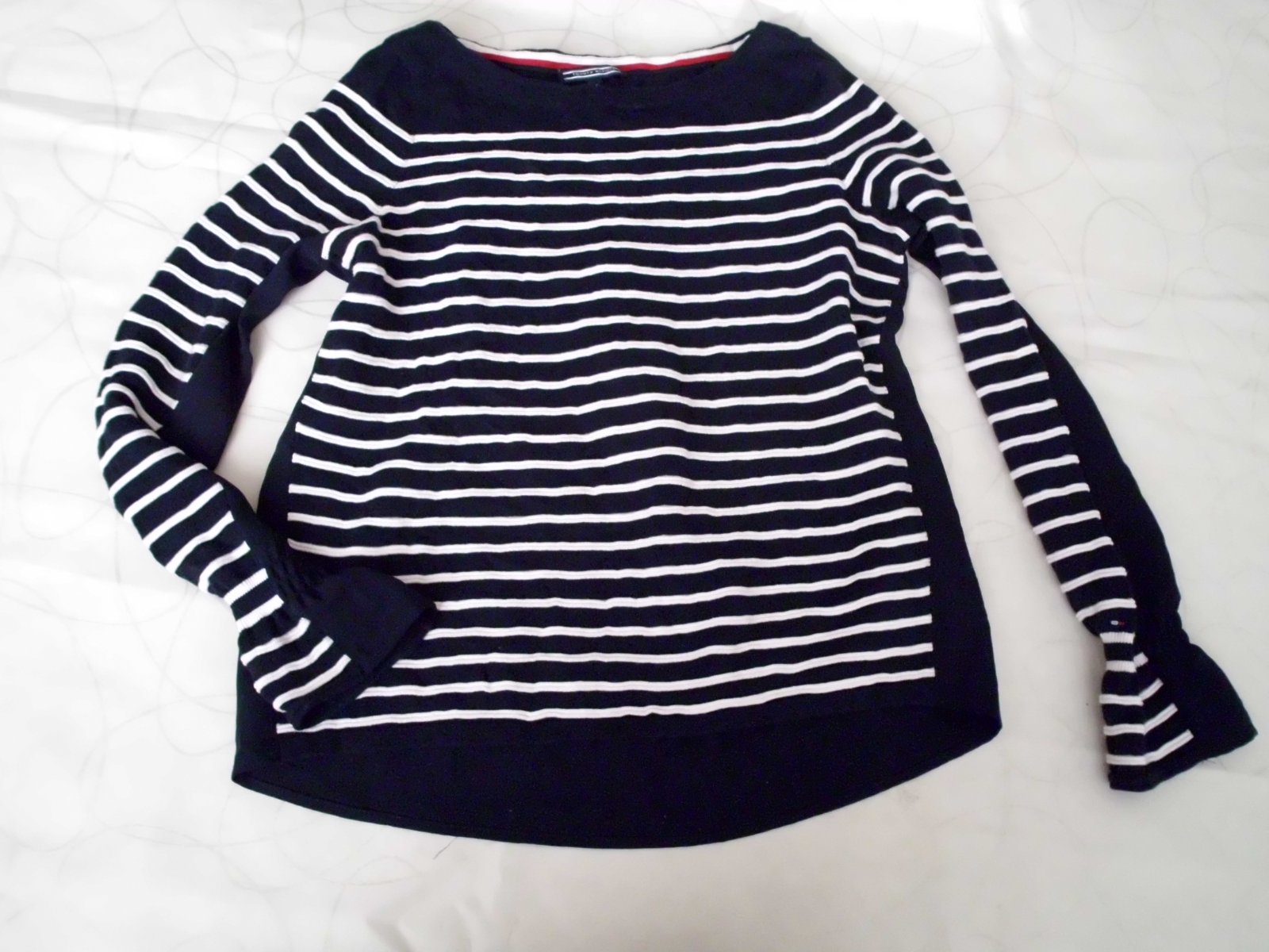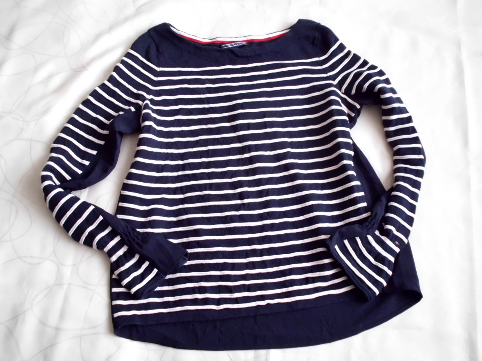Predám dámsky oversize svetrík Tommy Hilfiger vel. XS ale aj na M, šírka 51 cm, dĺžka 63 cm , rukáv 67cm, príjemný materiál zadný diel aj časť rukáva hladký nie pletený, farba tmavomodrá + biele pásy ,super stav