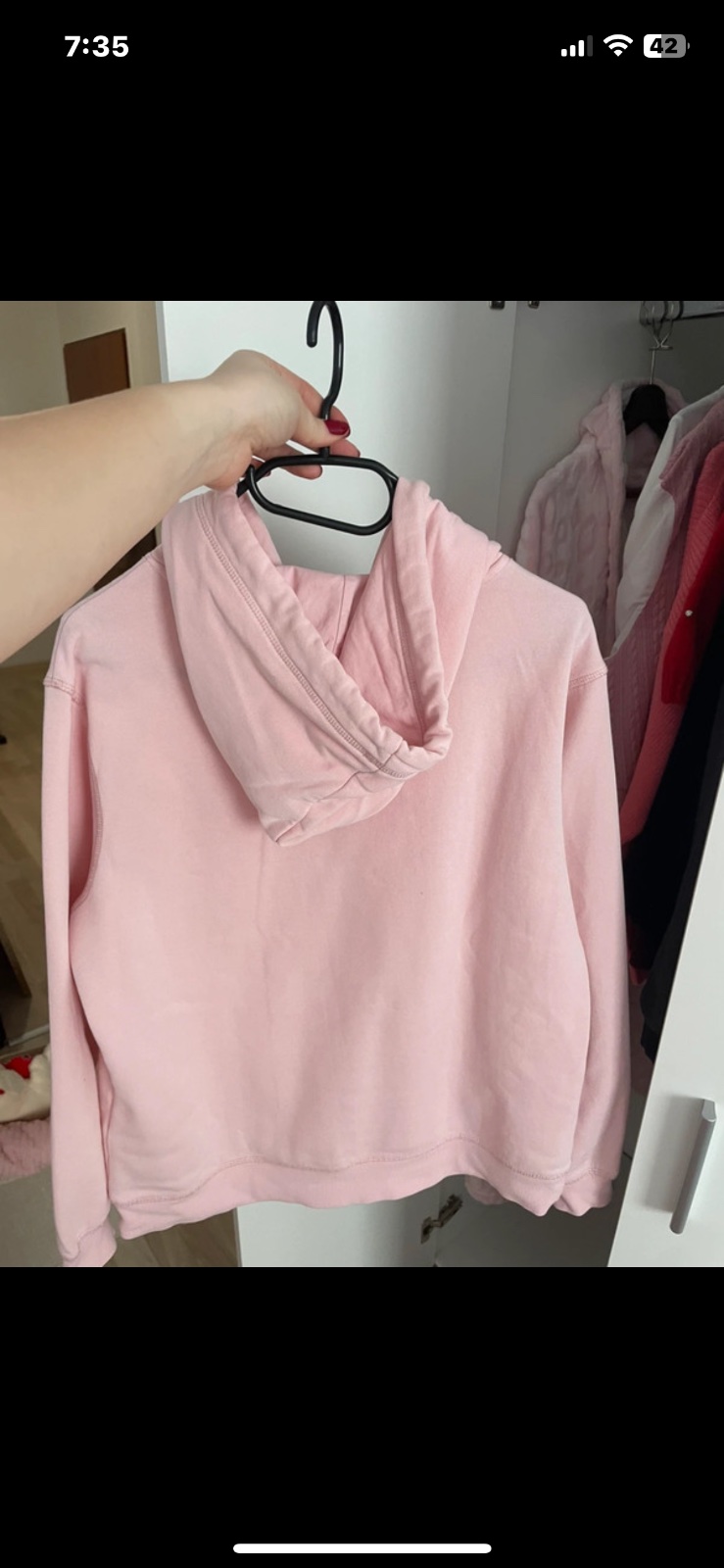 Mikina s nápisom a kapucňou. Farba jemná ružová. Dĺžka - 57 cm Prsia - 52 cm Rukáv - 59 cm Veľkosť S-L Cena + poštovné.