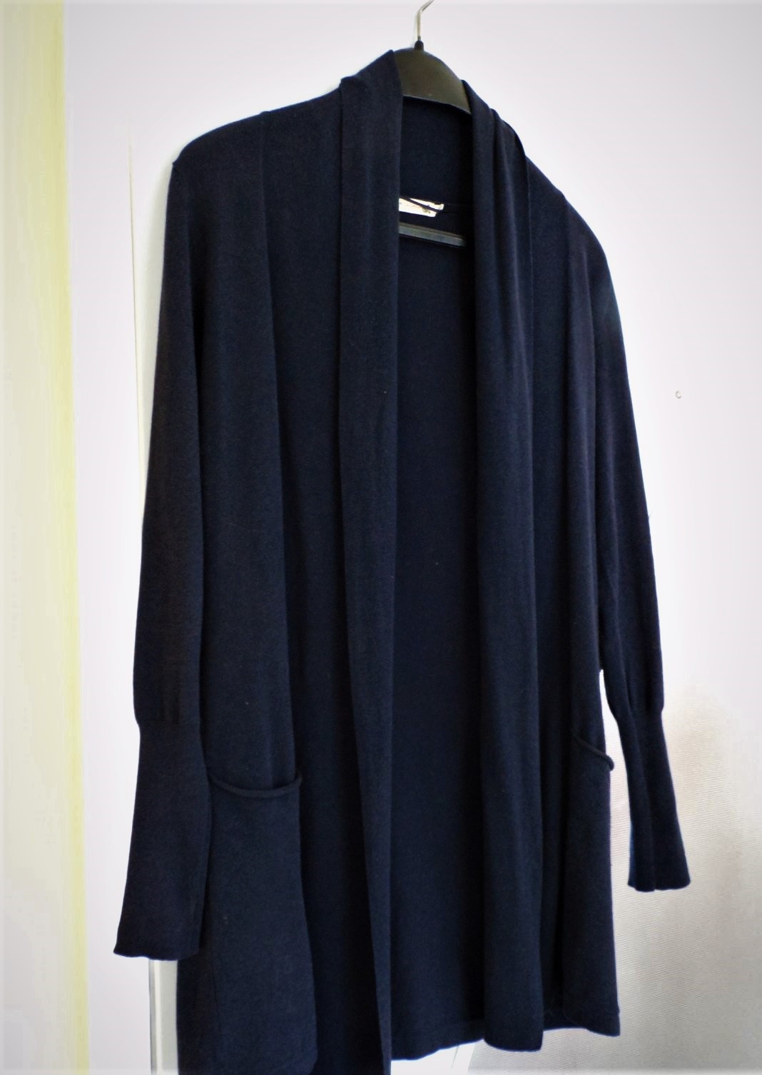 bavlnený dlhý sveter bez zapínania,so šálovým golierom,tmavo modrý,na rukávoch dlhé rumby, vrecka akoby ustrihnuté - neukončené, zloženie a značka vyfotené,vhodné skôr na L veľkosť