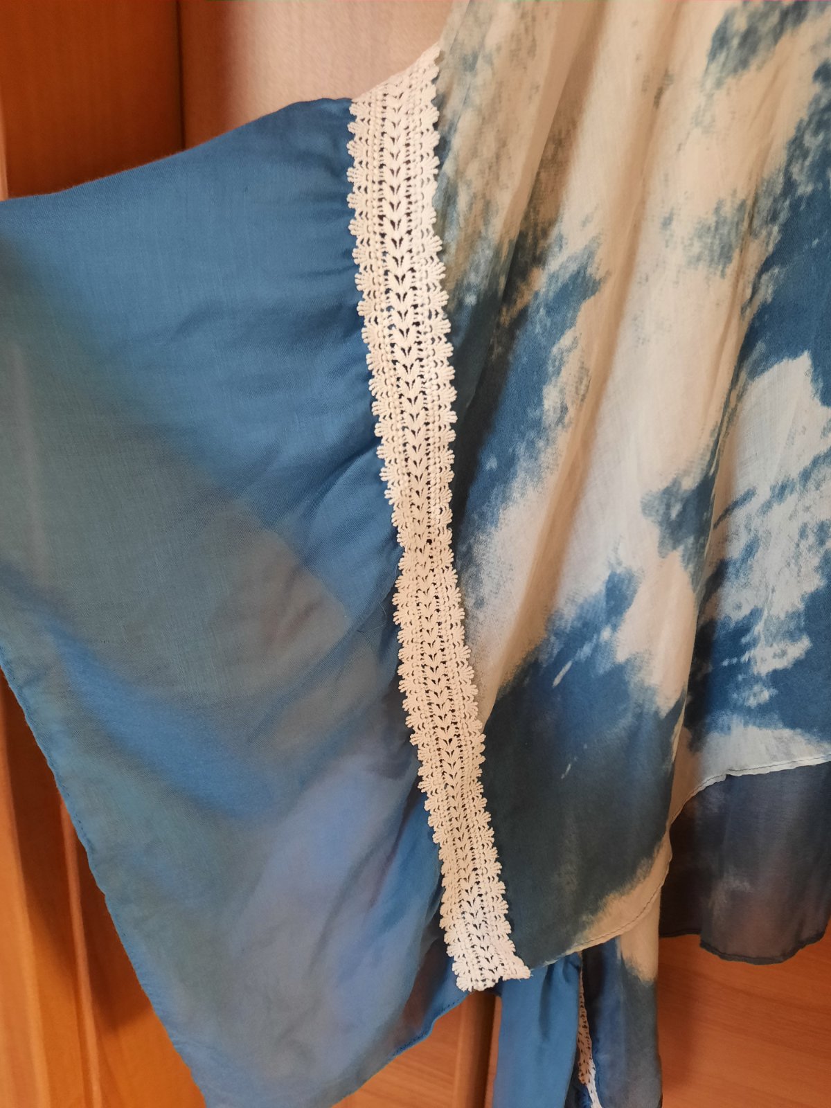 Krásne nové, bol to nevhodný darček. Nositeľné na tričko, tielko aj na plavky. Bez zapínania, s krásnou čipkou a riasením. Farba je taka stredne tmavamodrá do indiga.