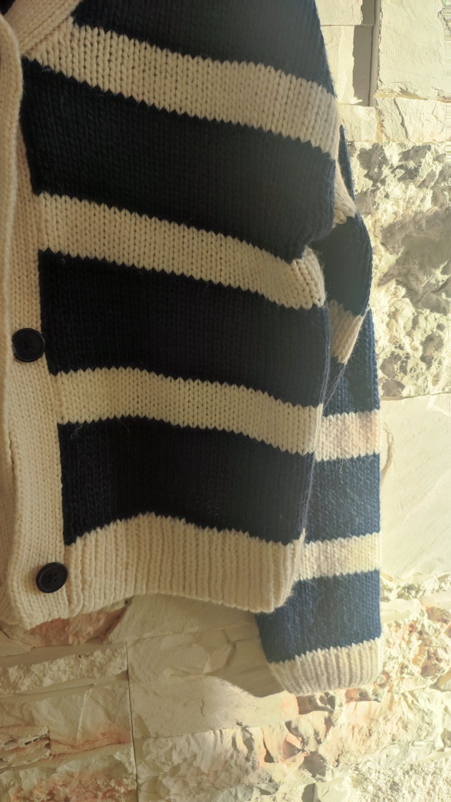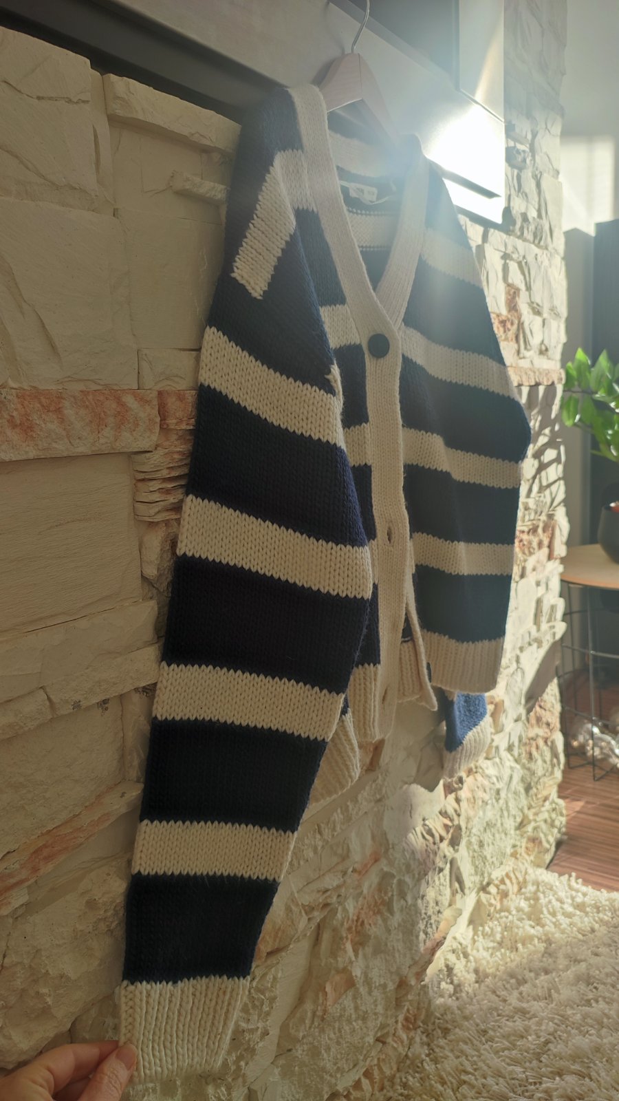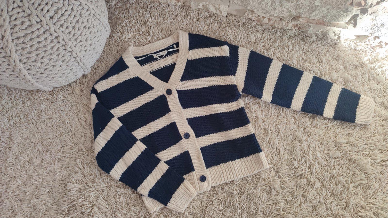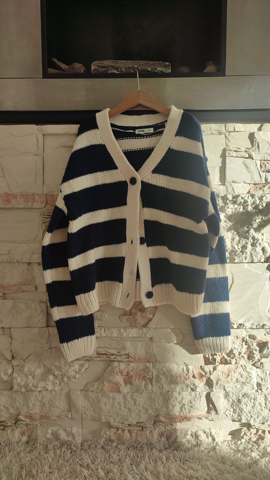 Ponukam smotanovo-modry kardigan. Rôzne druhy vlny, bez zapinania, má vrecka. Veľ.pisana 152, nositeľné už skôr.
