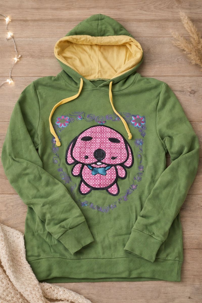 Originálna zelená mikina s kapucňou, ktorá zaujme na prvý pohľad. Má hravý motív ružového psíka s mašličkou a jemné kvetinové detaily. Kapucňa je podšitá žltou látkou, ktorá mikine dodáva svieži a veselý vzhľad.