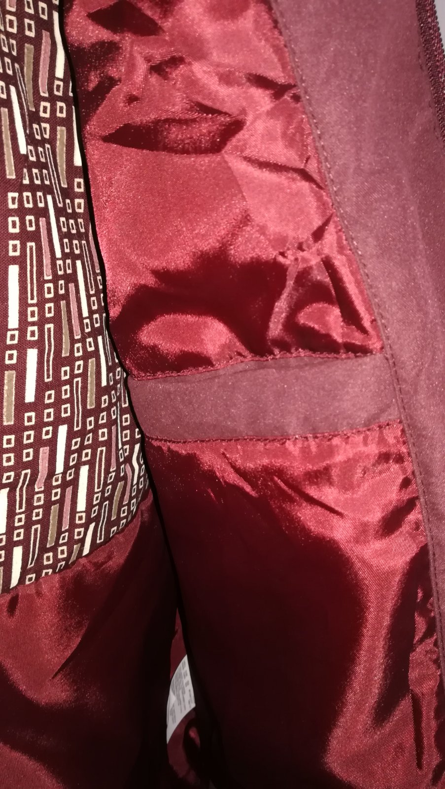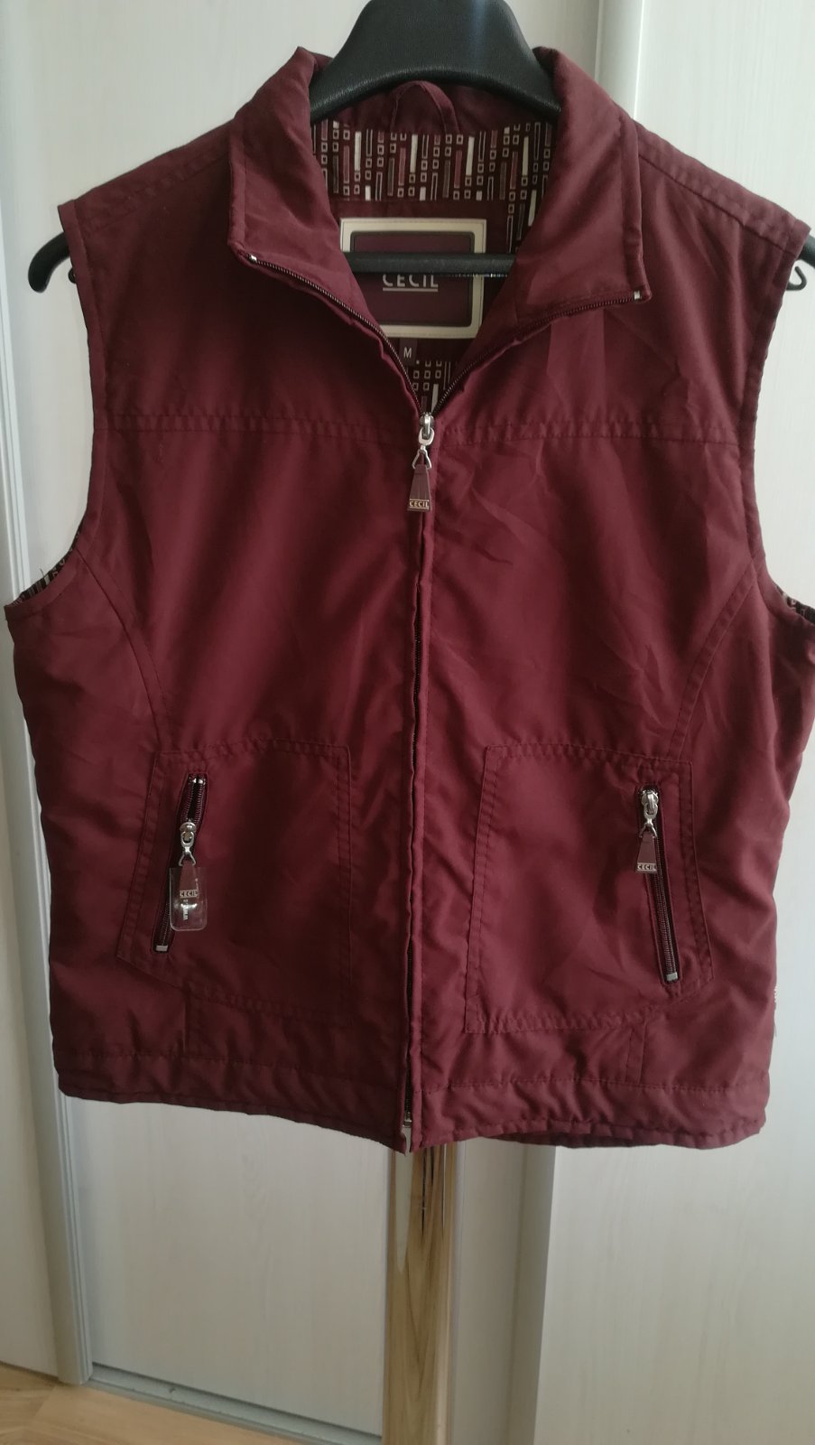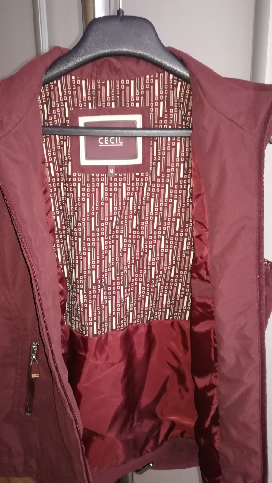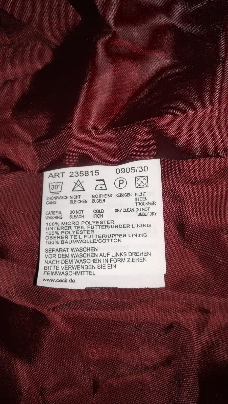 2 x vonkajšie vrecká + 1 vnútorne, ideálna na prechodné obdobia alebo chladnejšie večery. Farba je úplne tmavá bordó. Predávam za zlomok nákupnej ceny (NC 71, - €).