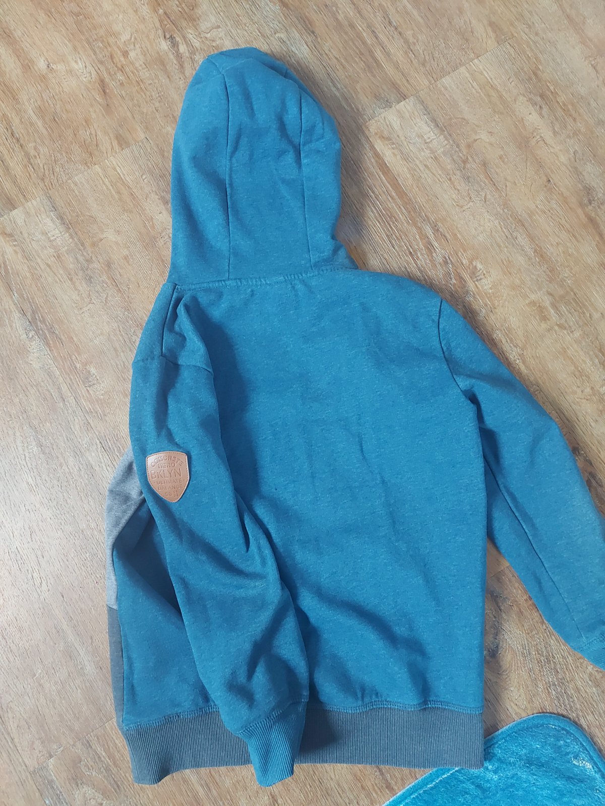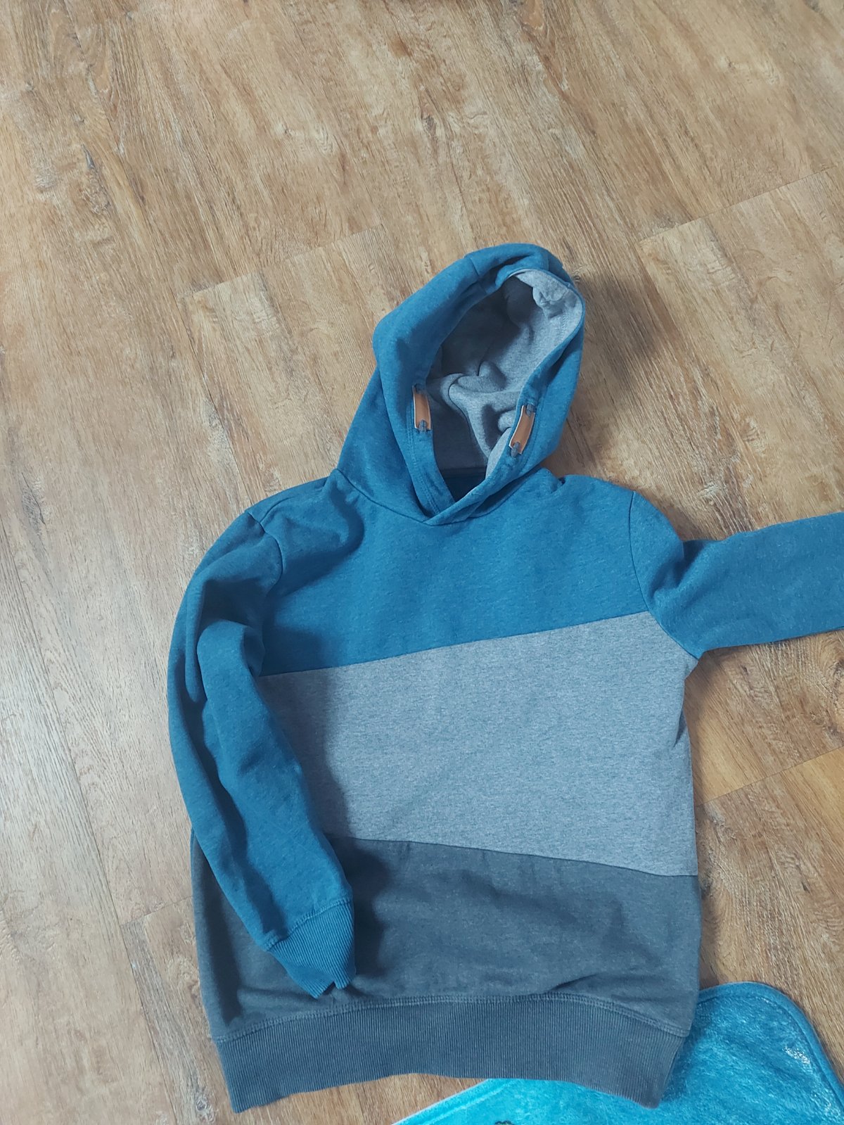 Nosený stav.Na rukáve je maličký fliačik, možno pôjde vyprať neskúšala som.Farba je tyrkysová nie modrá ako na foto.