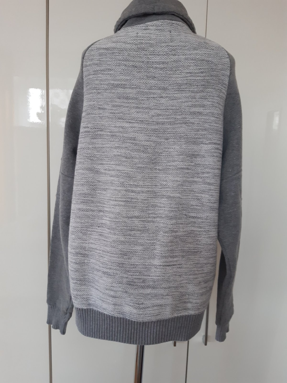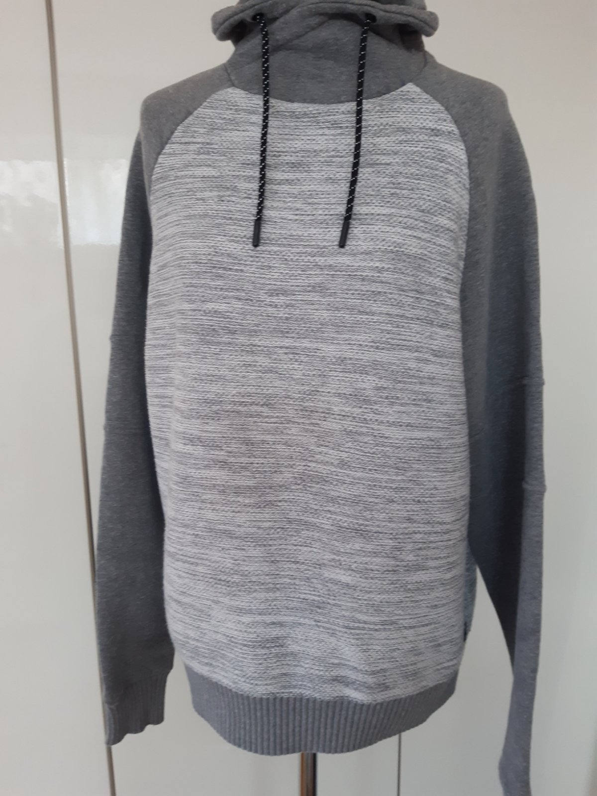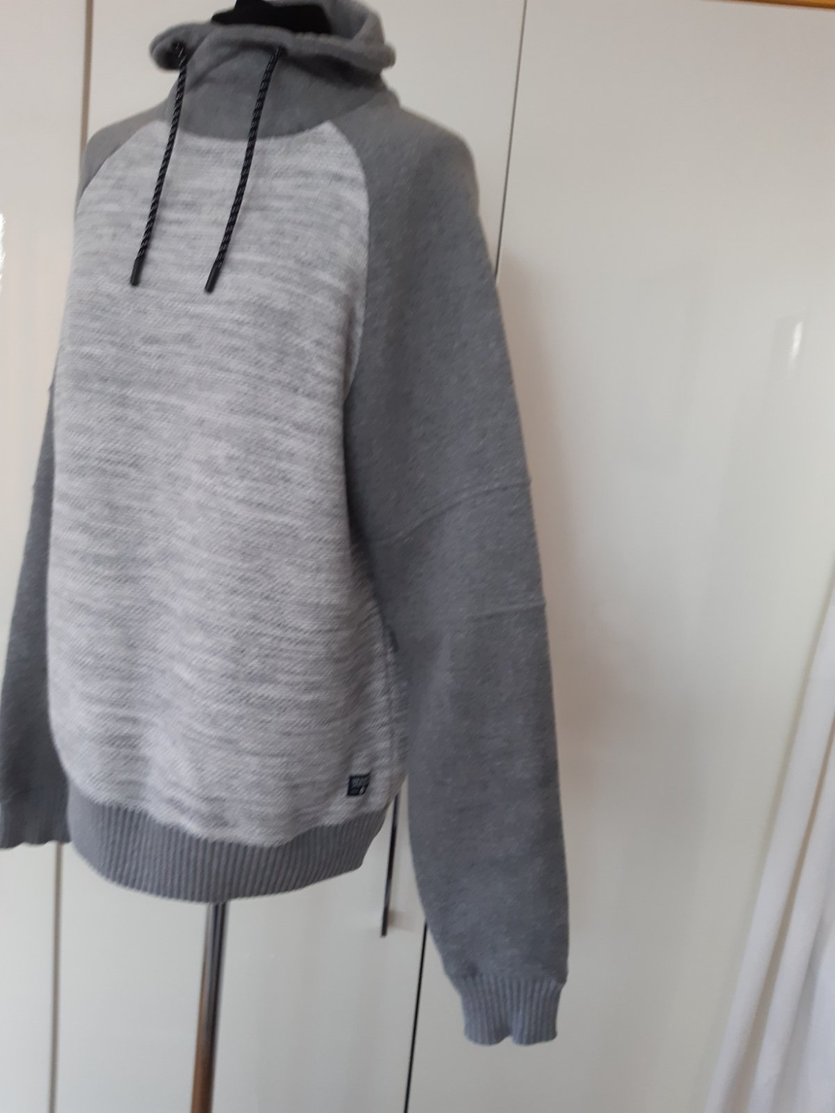 Súper mikina, skôr teplejšia, vhodná na prechodné obdobie. Kombinácia dvoch materiálov, pleteniny a úpletu na rukávoch a kapucni. Dl.74 cm, dl. rukáva od krku-je to reglán- 88 cm, šírka 59X2 cm. Materiál príjemný, mäkký, tipujem- bavlna a polyester, Mikina je vo výbornom stave, nebadať použitie, bez poškodenia.