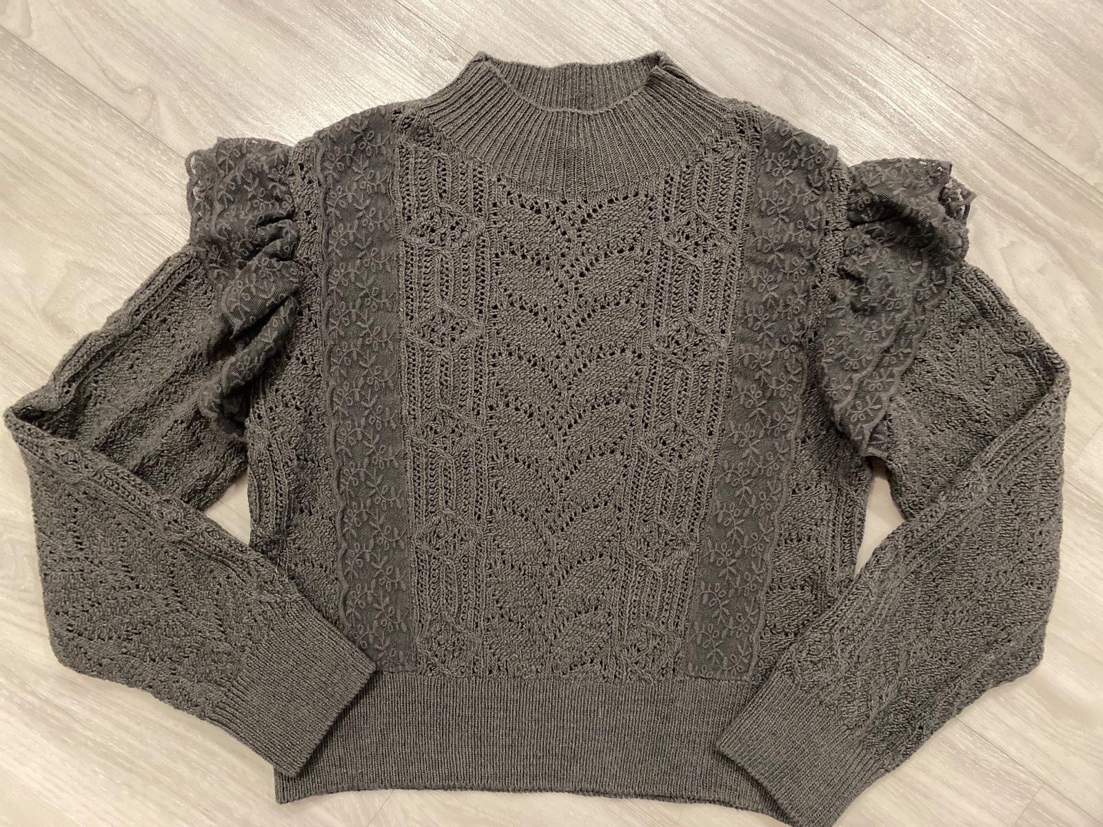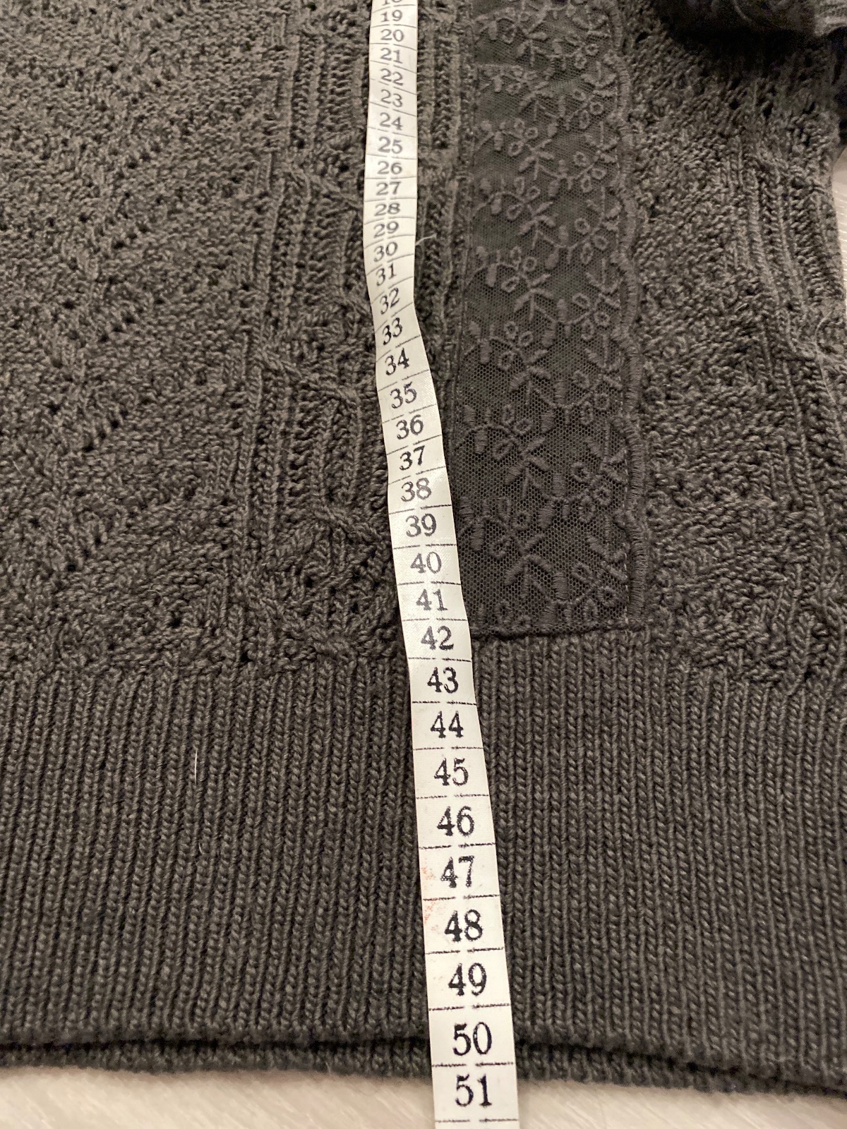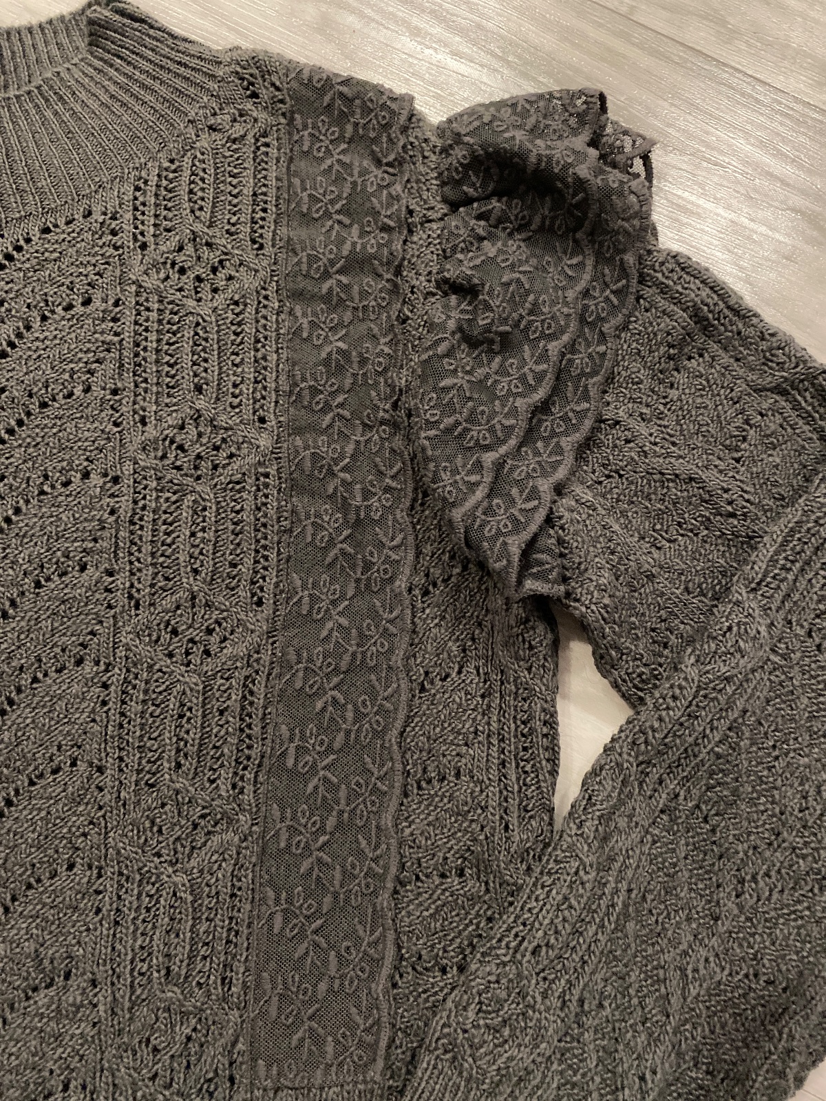 Pletený romantický sveter Zara s čipkou a volánmi. Farba je tmavošedá. Veľkosť S. Vo výbornom stave. Rozmery aj materiál na fotkách. Odporúčam.