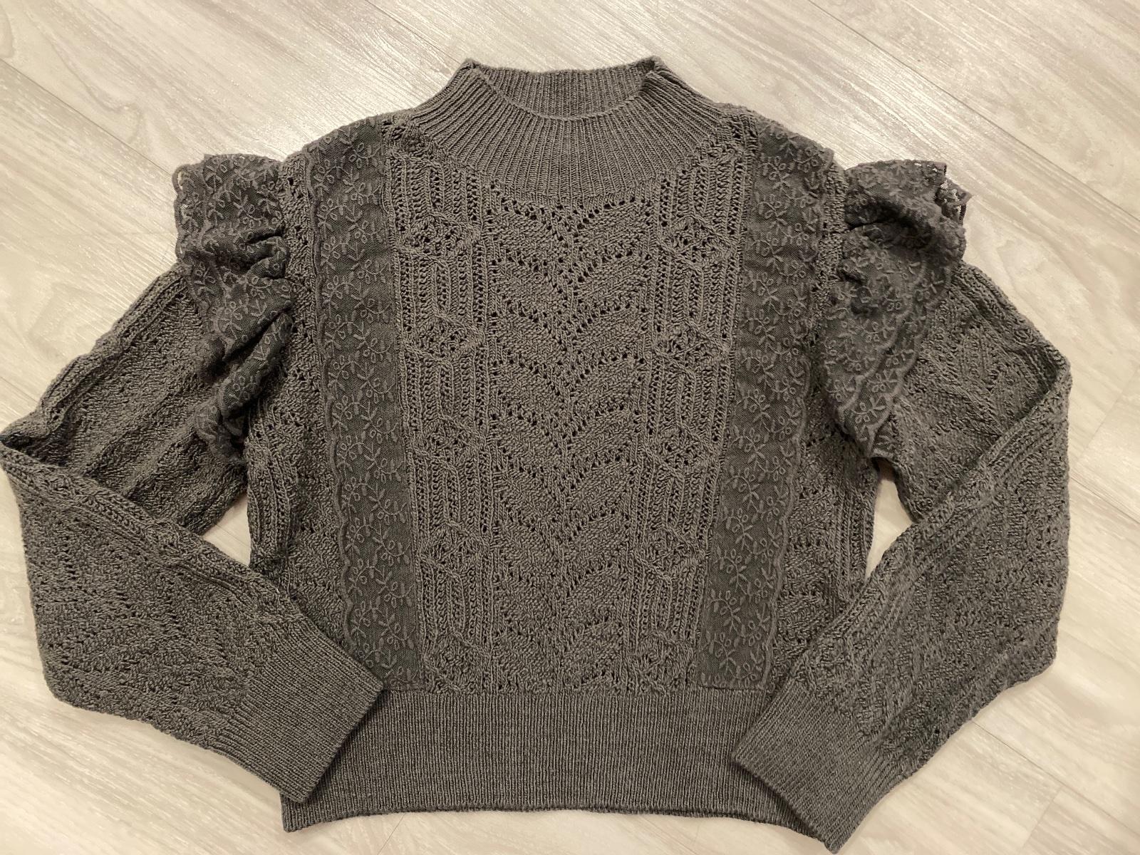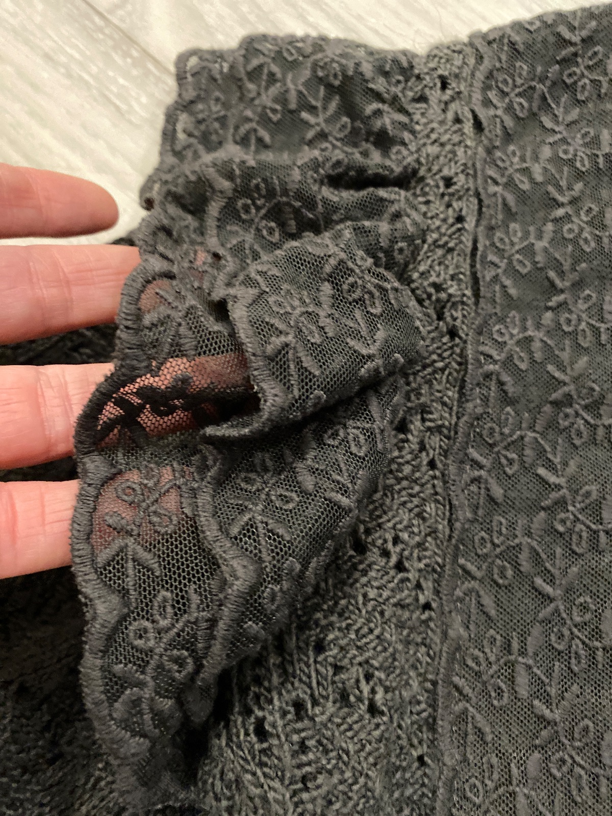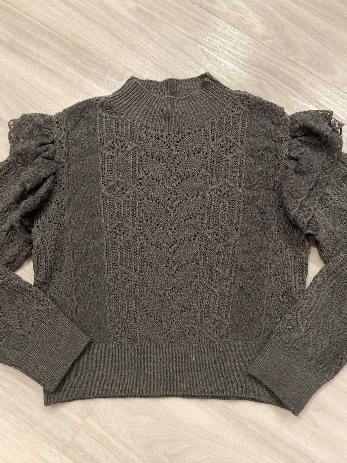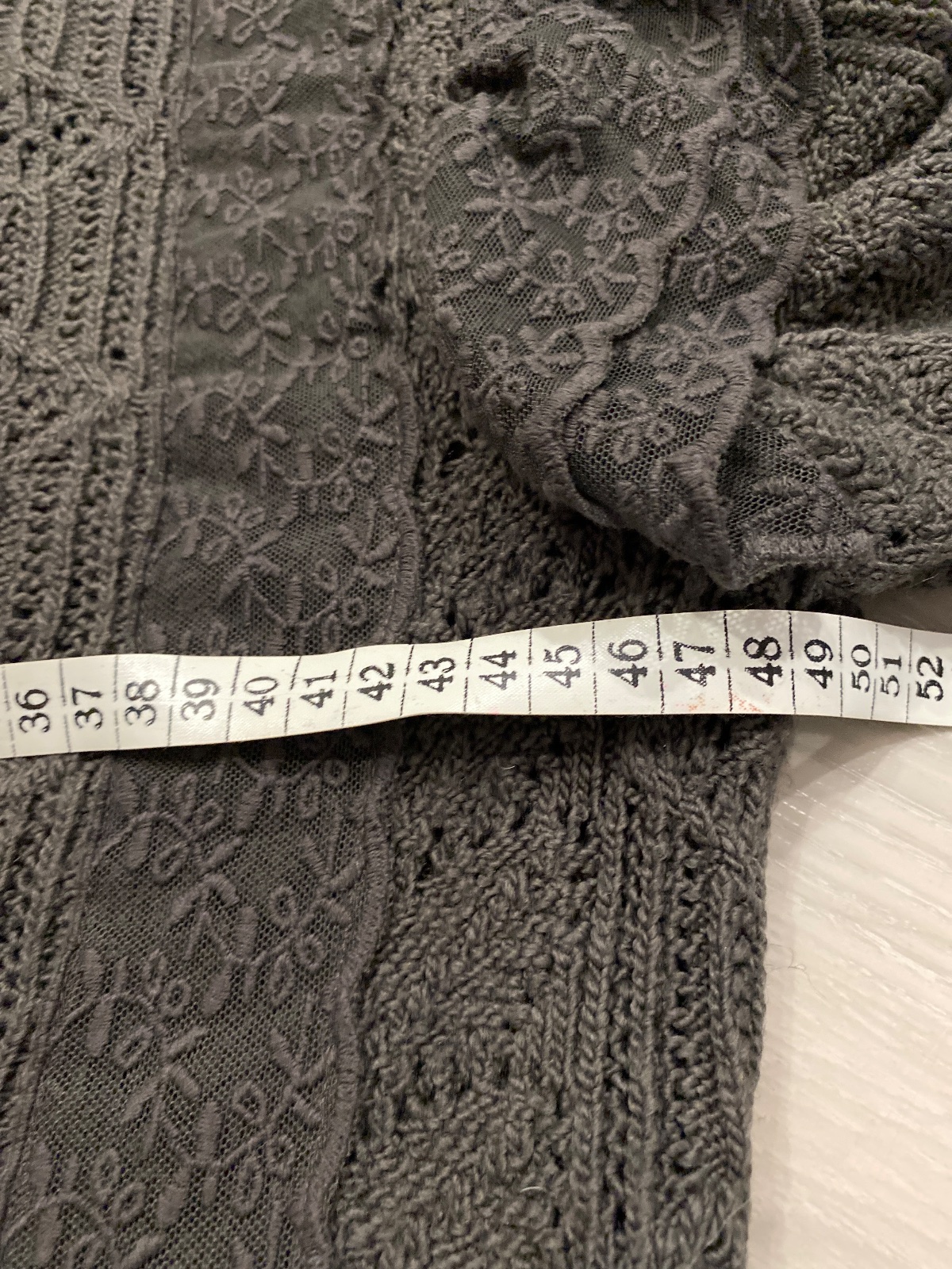 Pletený romantický sveter Zara s čipkou a volánmi. Farba je tmavošedá. Veľkosť S. Vo výbornom stave. Rozmery aj materiál na fotkách. Odporúčam.