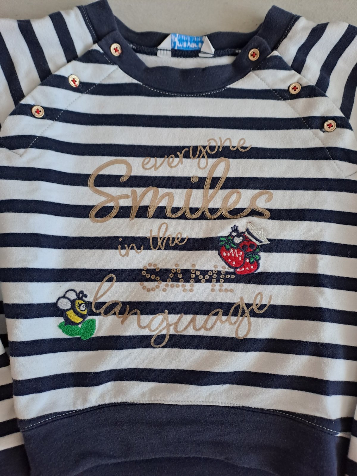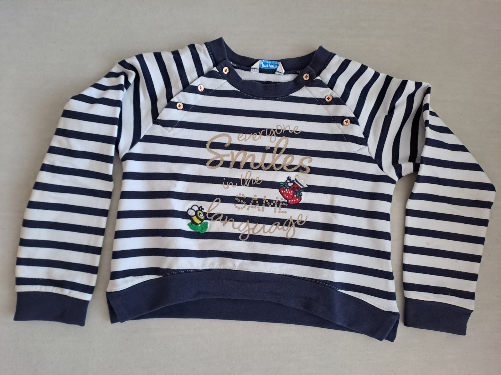 Dievčenská mikinka známej španielskej značky s peknými aplikáciami. Vo veľmi dobrom zachovalom stave bez poškodení. Materiál: 52% bavlna, 48% polyester.