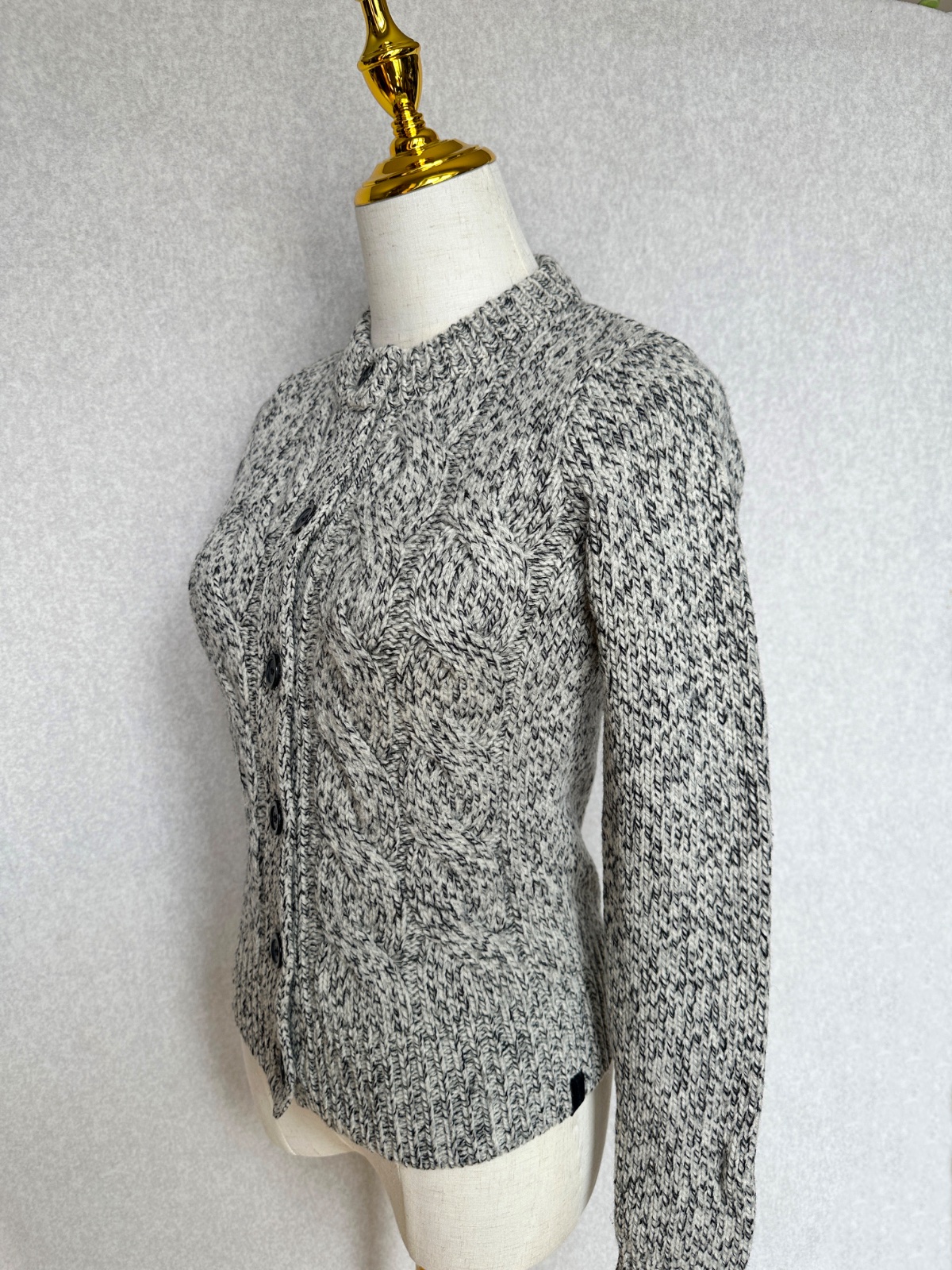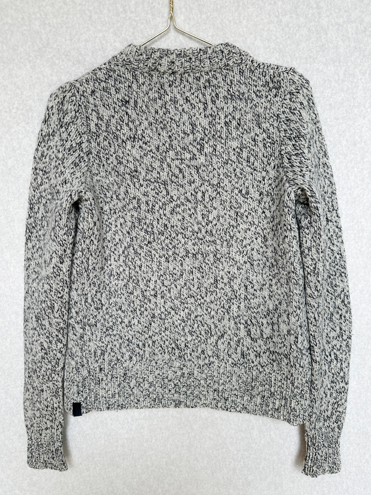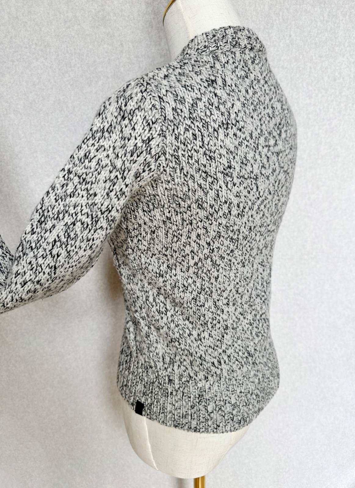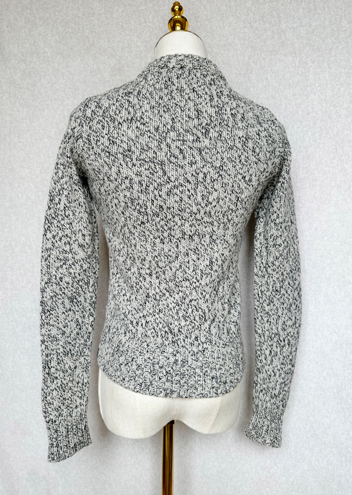 Kvalitný nahrubo pletený sveter v čiernobielom prevedení (celkovo pôsobí ako svetlošedý). Minimálne použitie, v super stave, bez poškodení. Klasický nadčasový kúsok do šatníka na prechodné obdobie, aj na zimu pod kabát. 100% merino vlna - nehryzie, nepichá, príjemný hebký materiál. Pranie v rukách.