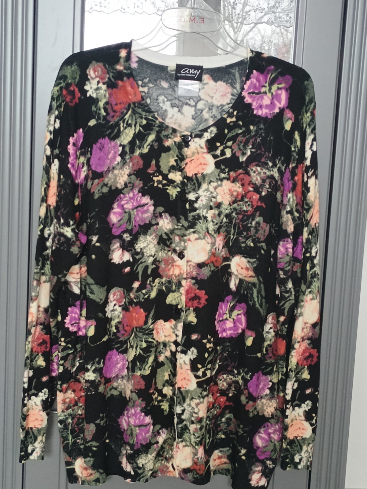 Predam len vyskusany damsky kardigan s maslami, pisana velkost 2xl, sedi na velkost 48. Pod pazuchami meria 2x62 cm, dlzka je 68,5 cm.