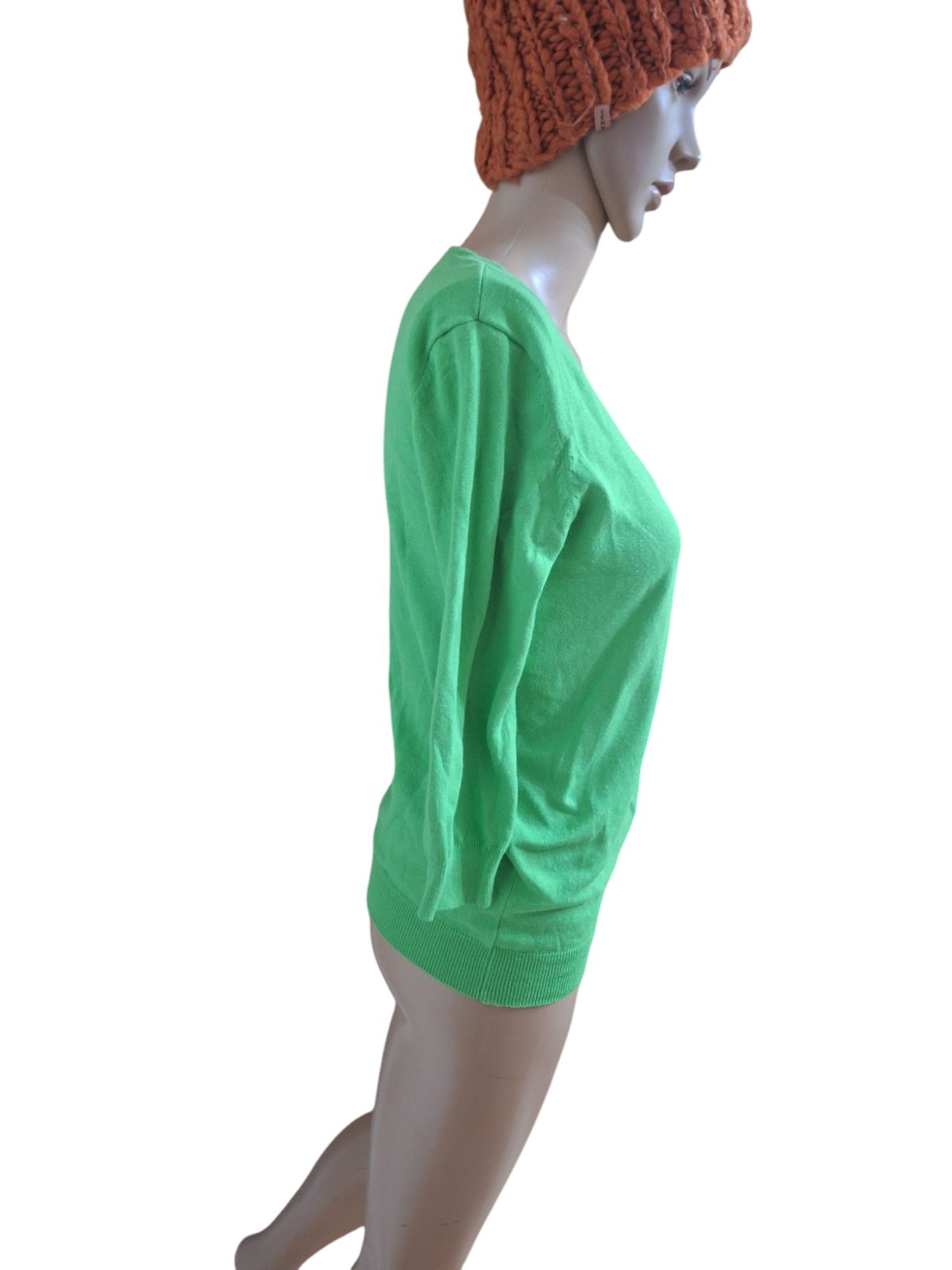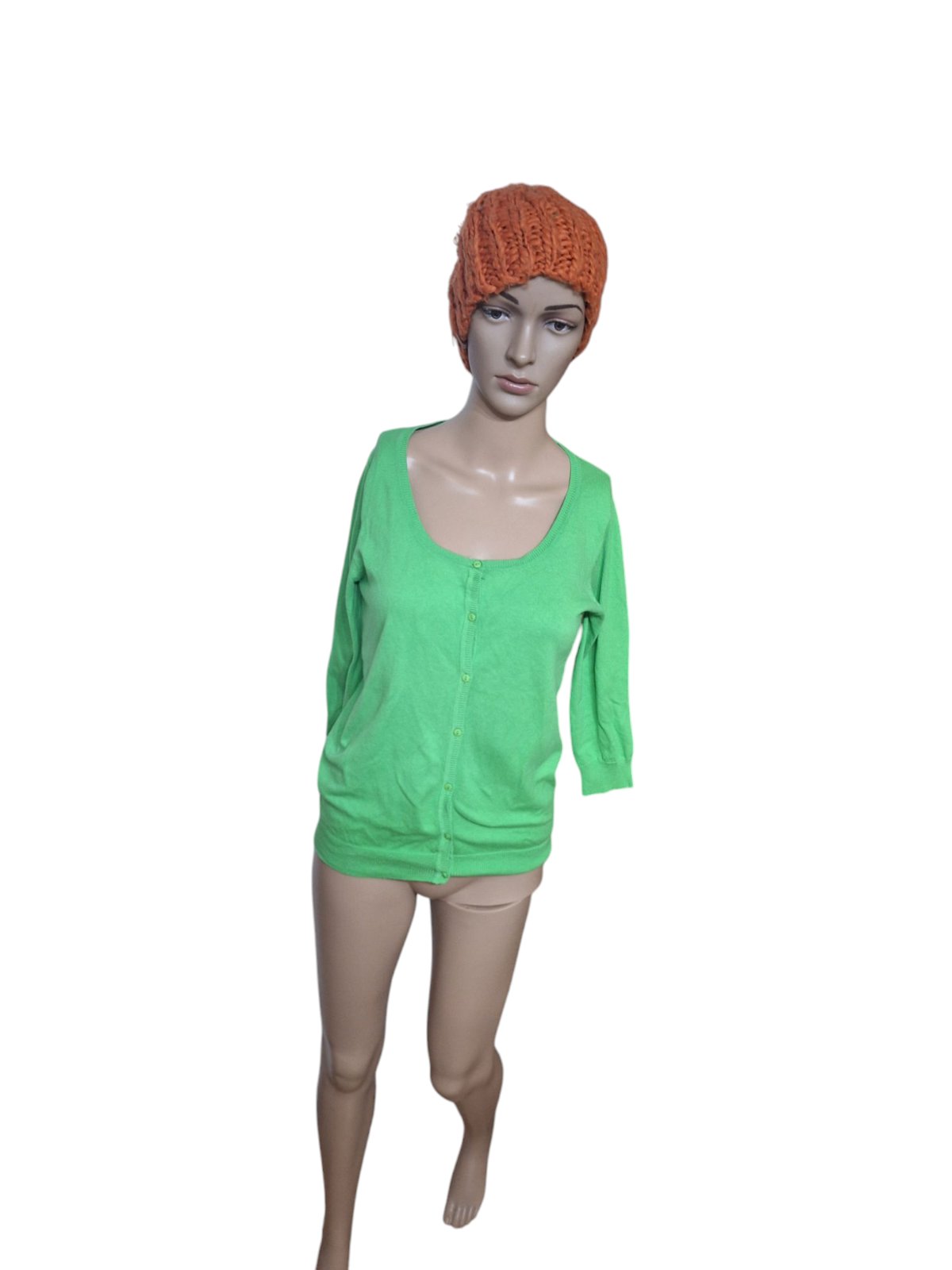 Dámsky značkový svetrík na zapínanie. Je elastický a má 3/4 rukávy. Dĺžka je 60cm, obvod hrudníka je 90cm a obvod pása je 86cm. kód 1121