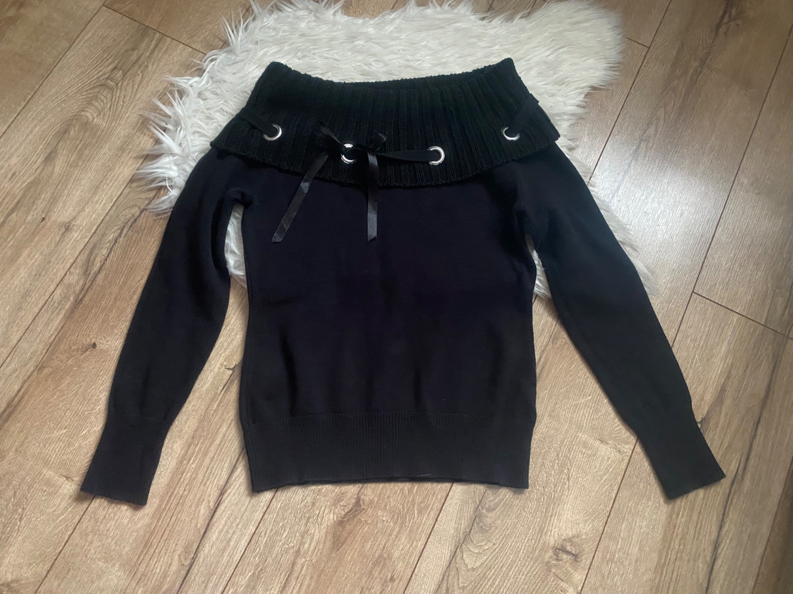 Zaujímavý sveter s čipkovanou aplikáciou na ramenách a chrbáte, veľmi dobrý stav.