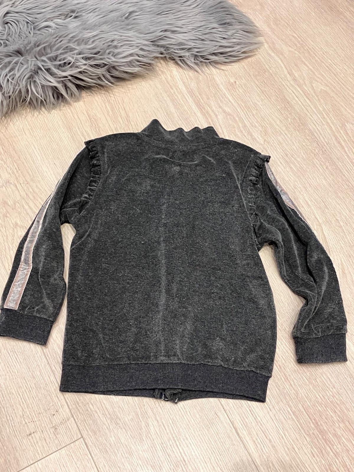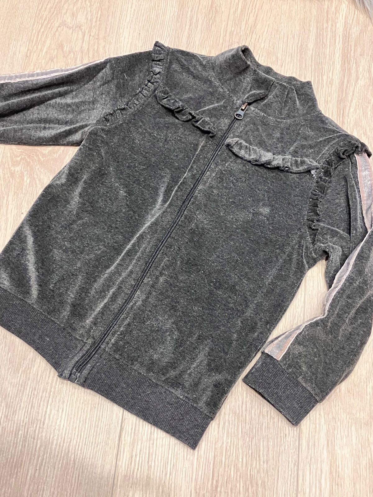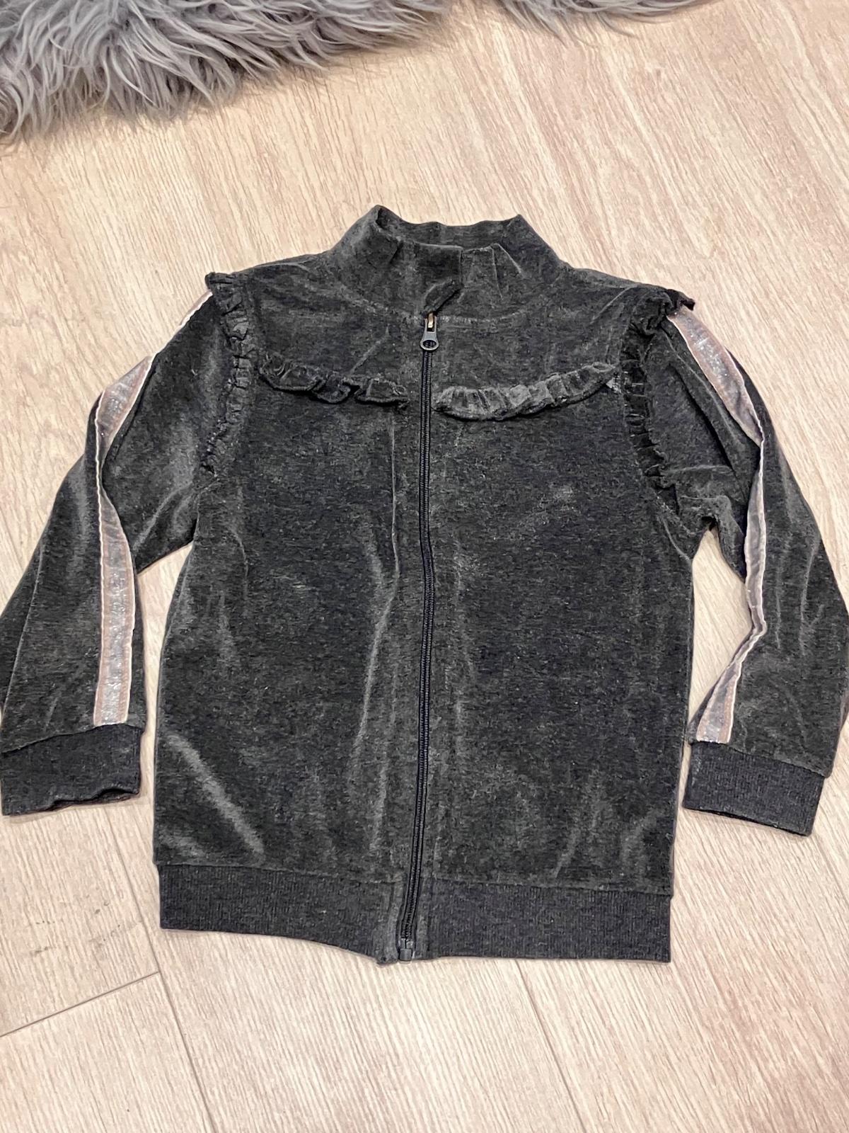 Dievčenská zamatová mikina s volánmi, tenká, zapínanie na zips, na rukáve s lesklým pásom, materiál 60%bavlna,35%polyester 5%elastan.