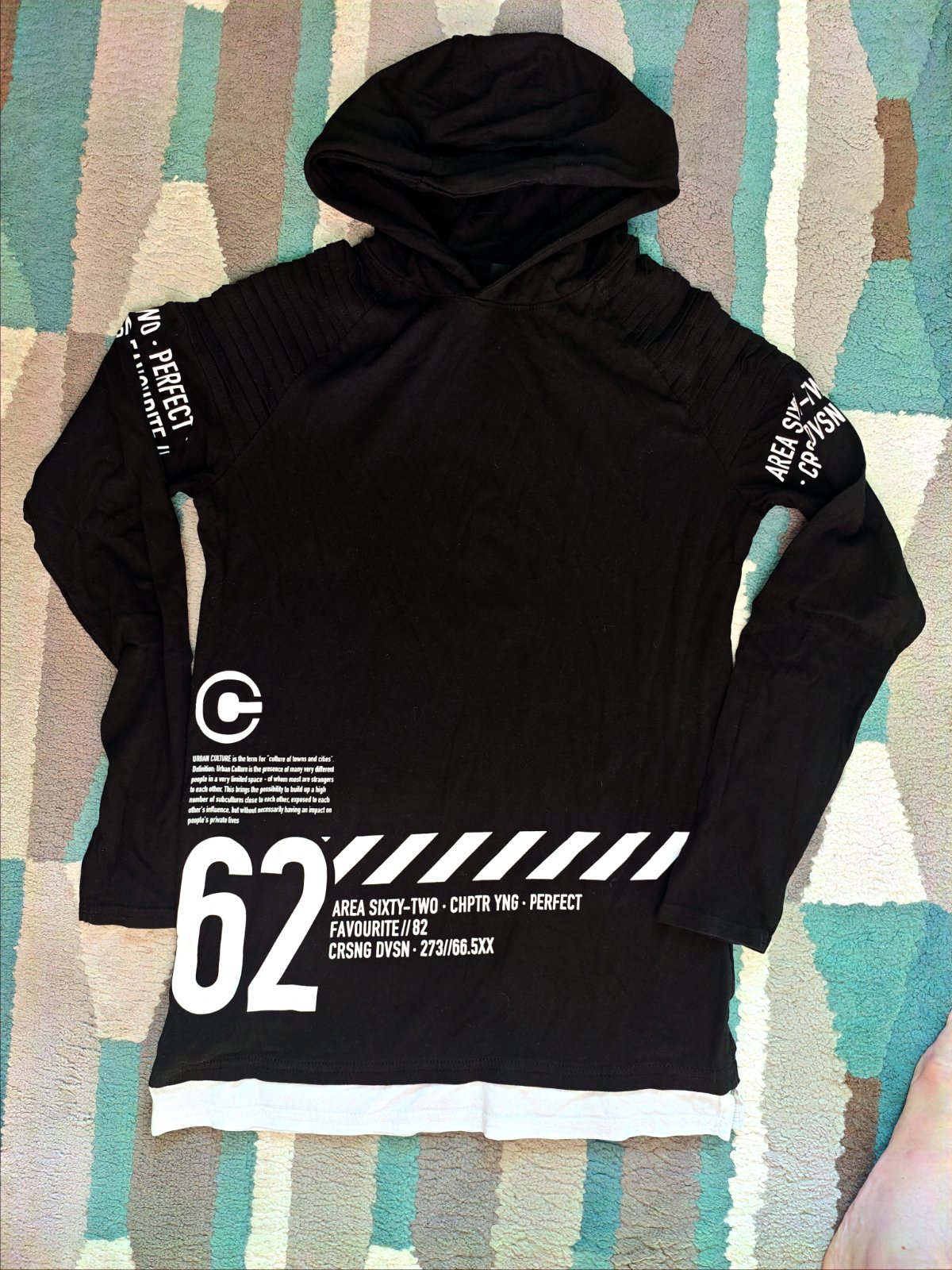 Chlapčenská tenšia mikina s kapucňou s bielou potlačou, taký príjemný bavlnený materiál vhodný ako tričko s dlhým rukávom. Veľkosť 158/ 164. dĺžka mikiny je 67 cm šírka v podpazuší 42 centimetrov.