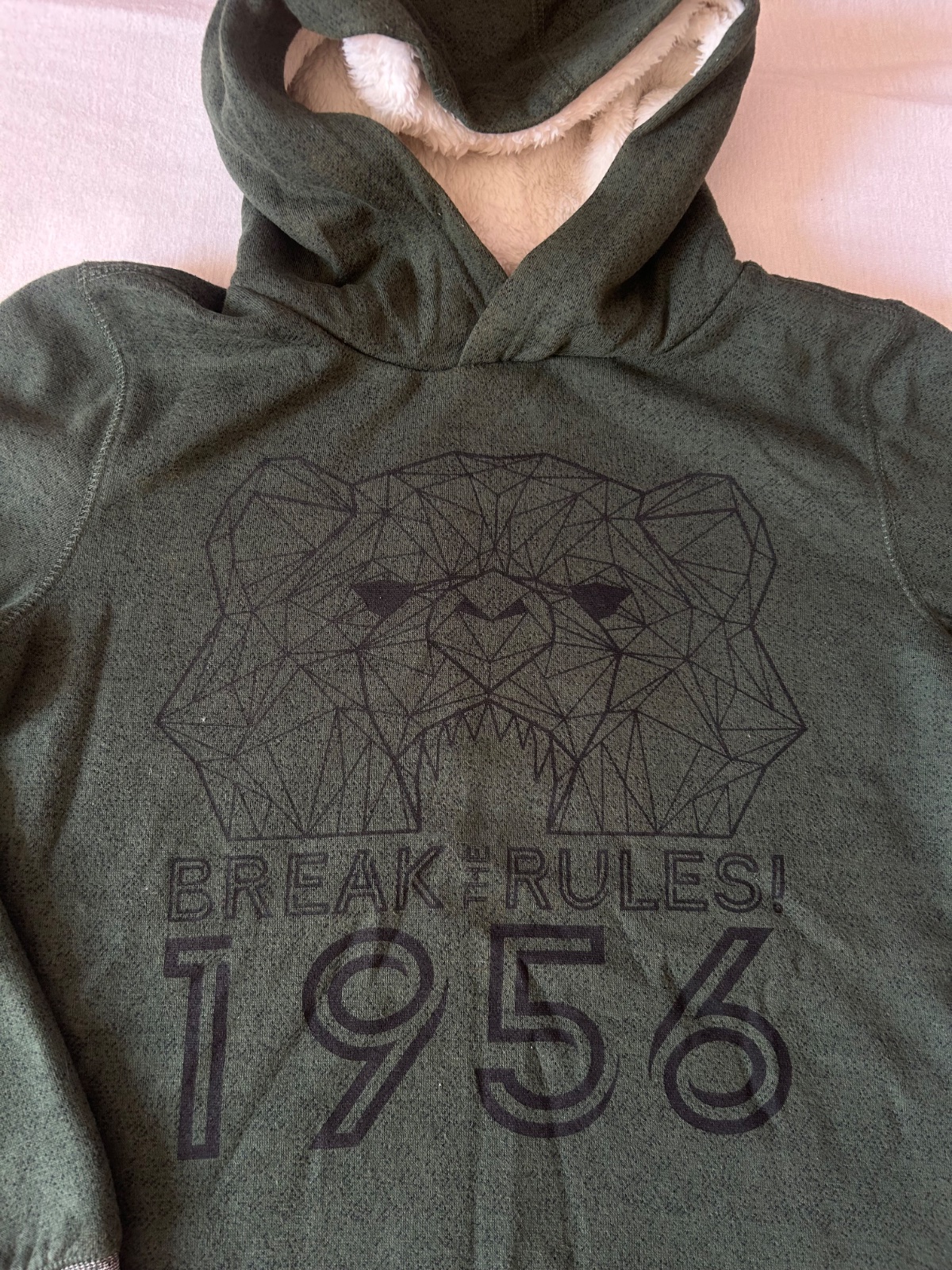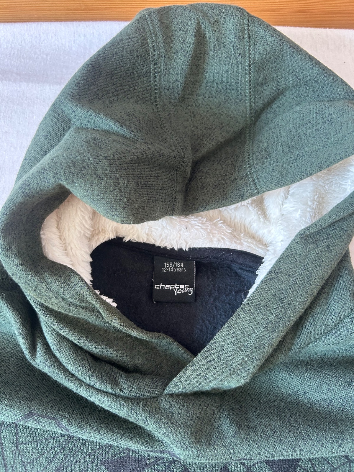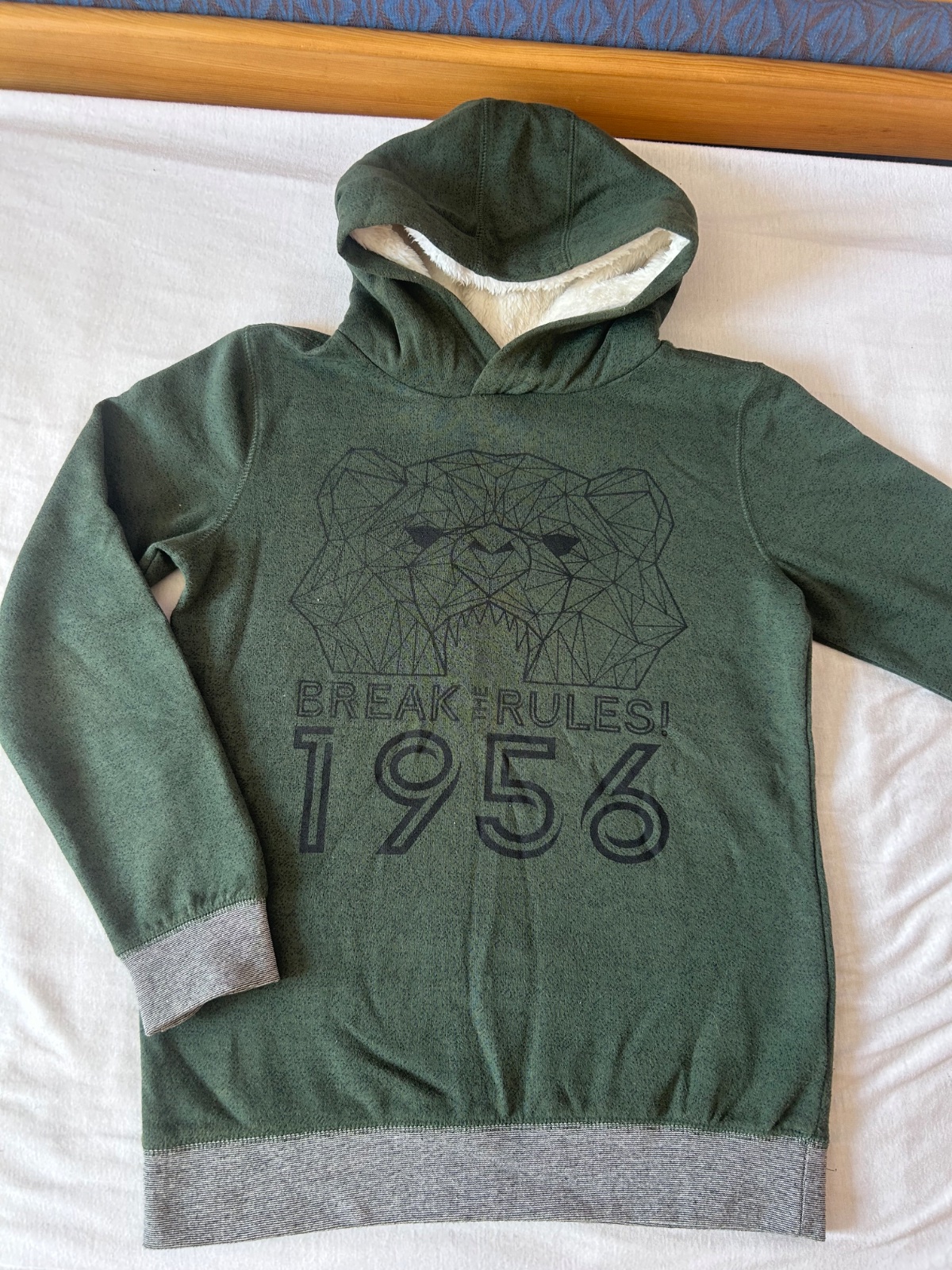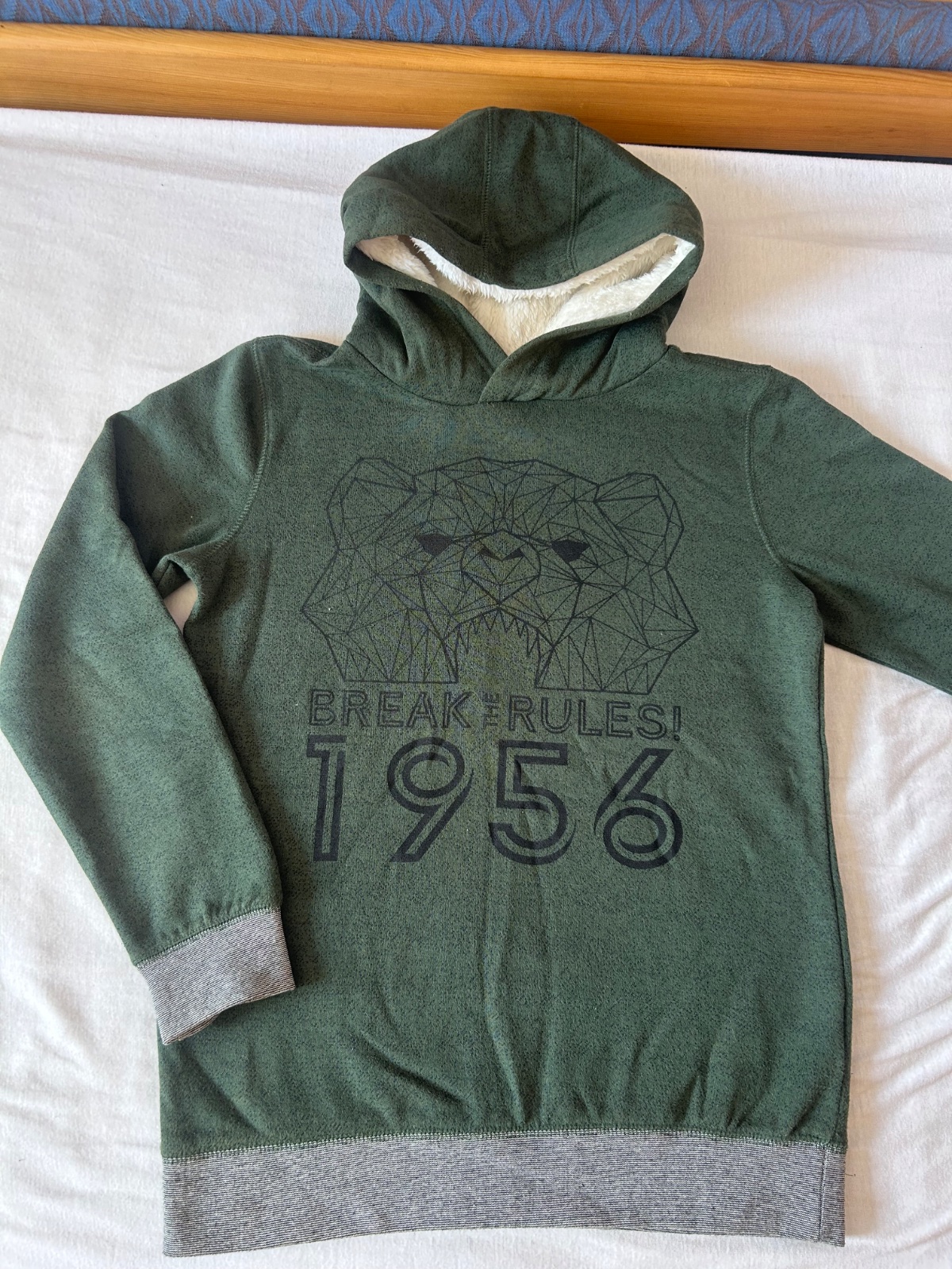 Mikina, oteplena. Nosena, jemne zmolky, inak OK, velkost pisana 158/164. Kupovane v Takko. Miery na fotkach.