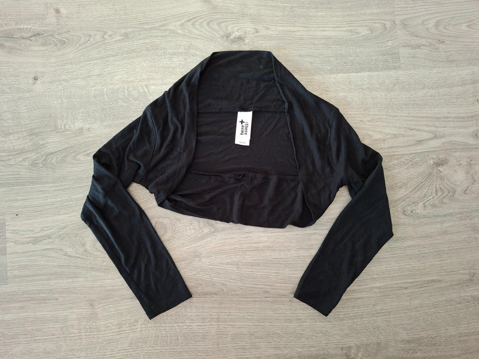 Čierne pletené bolerko so strieborným metalickým vláknom, zapínanie na jeden gombík, krátky rukáv. Hodí sa pre veľkosť 134-146 cm. Rozmery: šírka cca 39 cm, dĺžka 32 cm, dĺžka rukáva od krku 20 cm....
