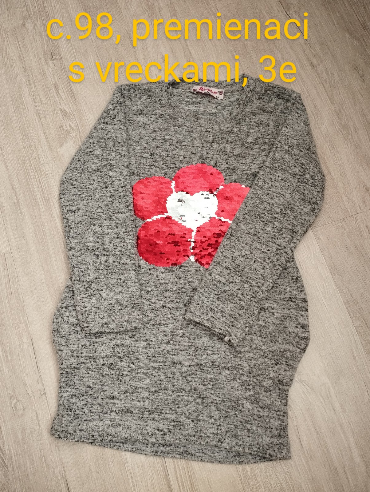 Predám tenší dlhší svetrík s vreckami a s premienacim obrázkom. Veľmi príjemný materiál.