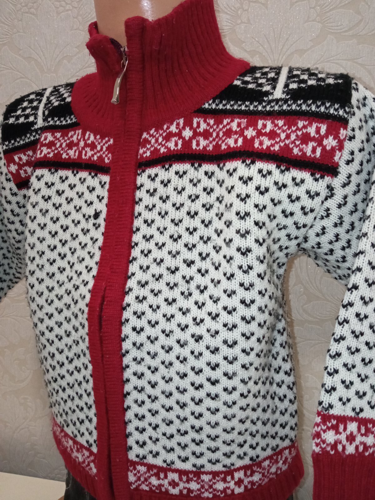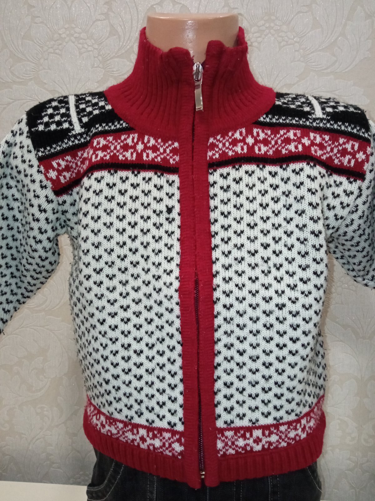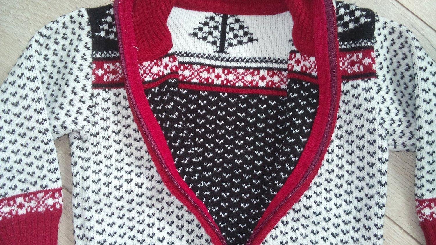 Chlapčenský sveter na zips, pletený, patent pri krku ,na rukáve a na páse, farba bordo-čierno-biela.