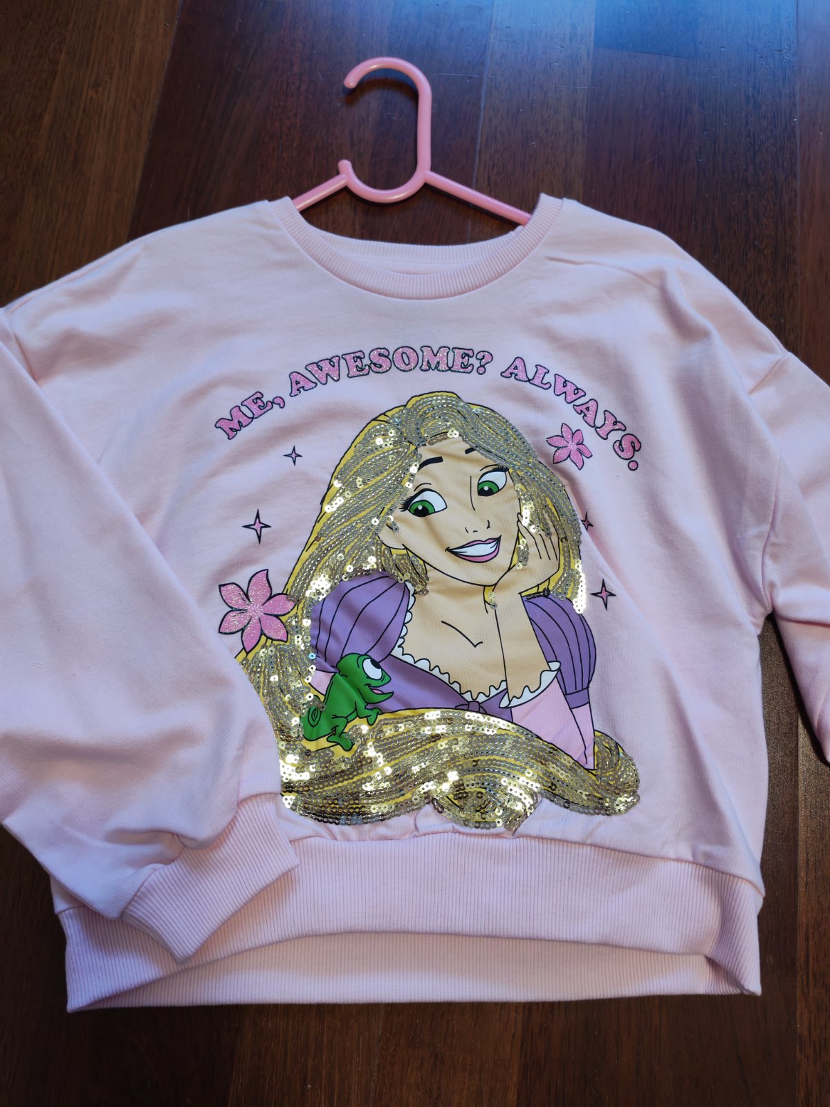 Mikina Rapunzel, značka Disney, kupovaná v Sinsay, nenosená, úplne nová. Veľmi dobrý mäkký materiál a pekne urobený prvok na vlasoch.