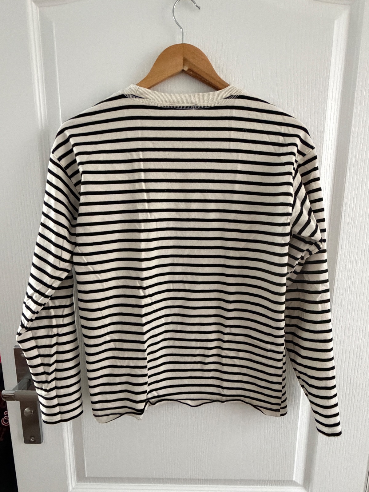 Tričko s dlhým rukávom z hrubej krémovej bavlny s čiernymi vodorovnými pruhmi. Klasika v šatníku. Kúpené v Zare, veľkosť na visačke je M a všetky miery sú na fotografiách. Hodí sa ku všetkému. K čiernym legínam a čižmám, mom rifliam a teniskám a k dlhej čiernej saténovej sukni alebo šortkám. Hodí sa ku všetkému a ku každému.