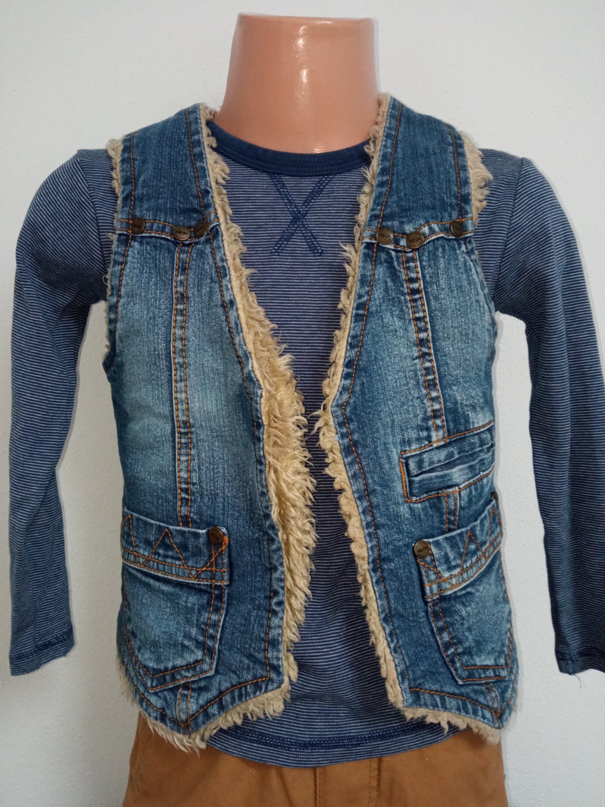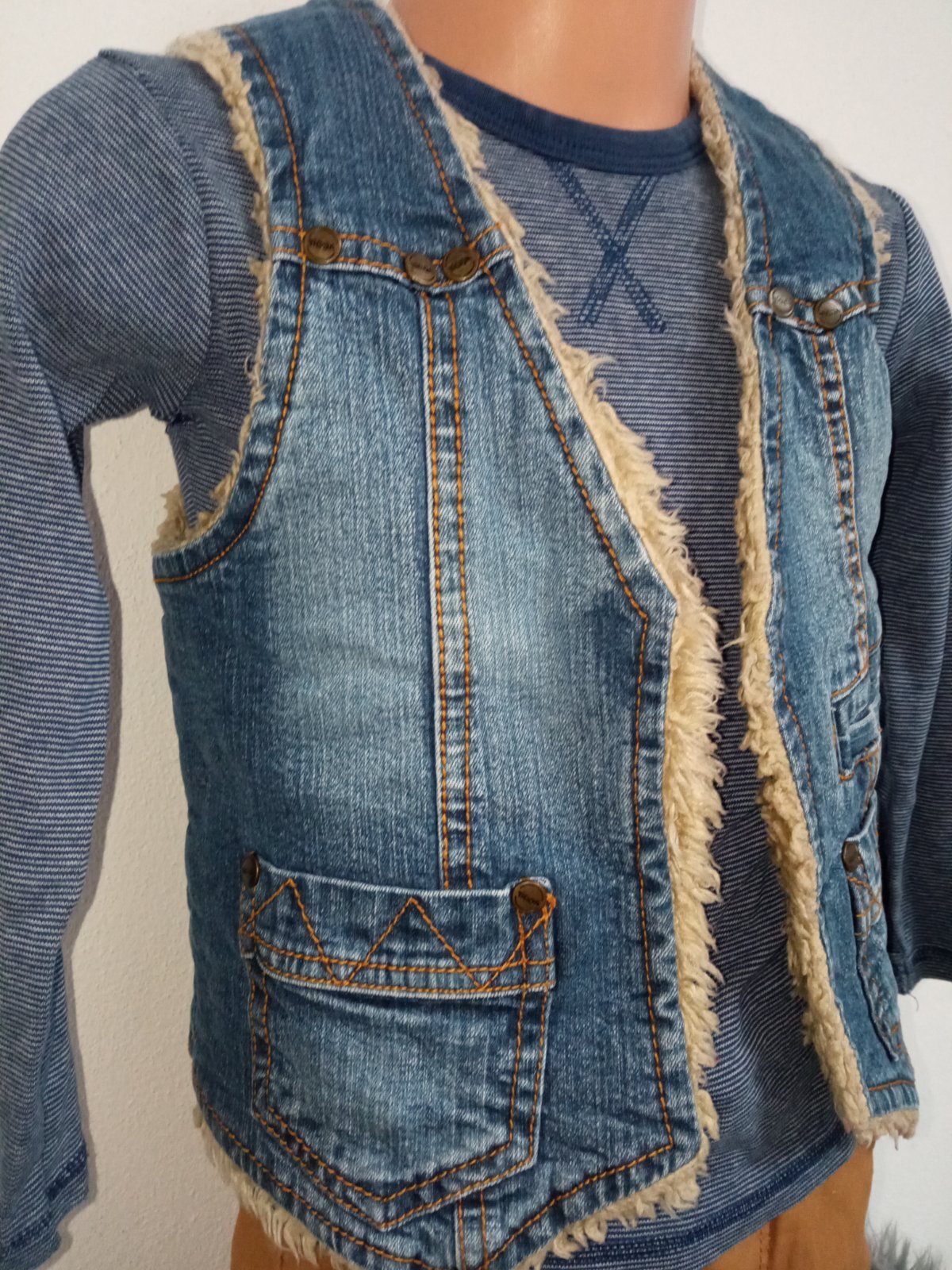 Chlapčenská džínsová vesta zateplená s kožušinou, jemne elastická, tri predné vrecká, veľkosť cca 110.