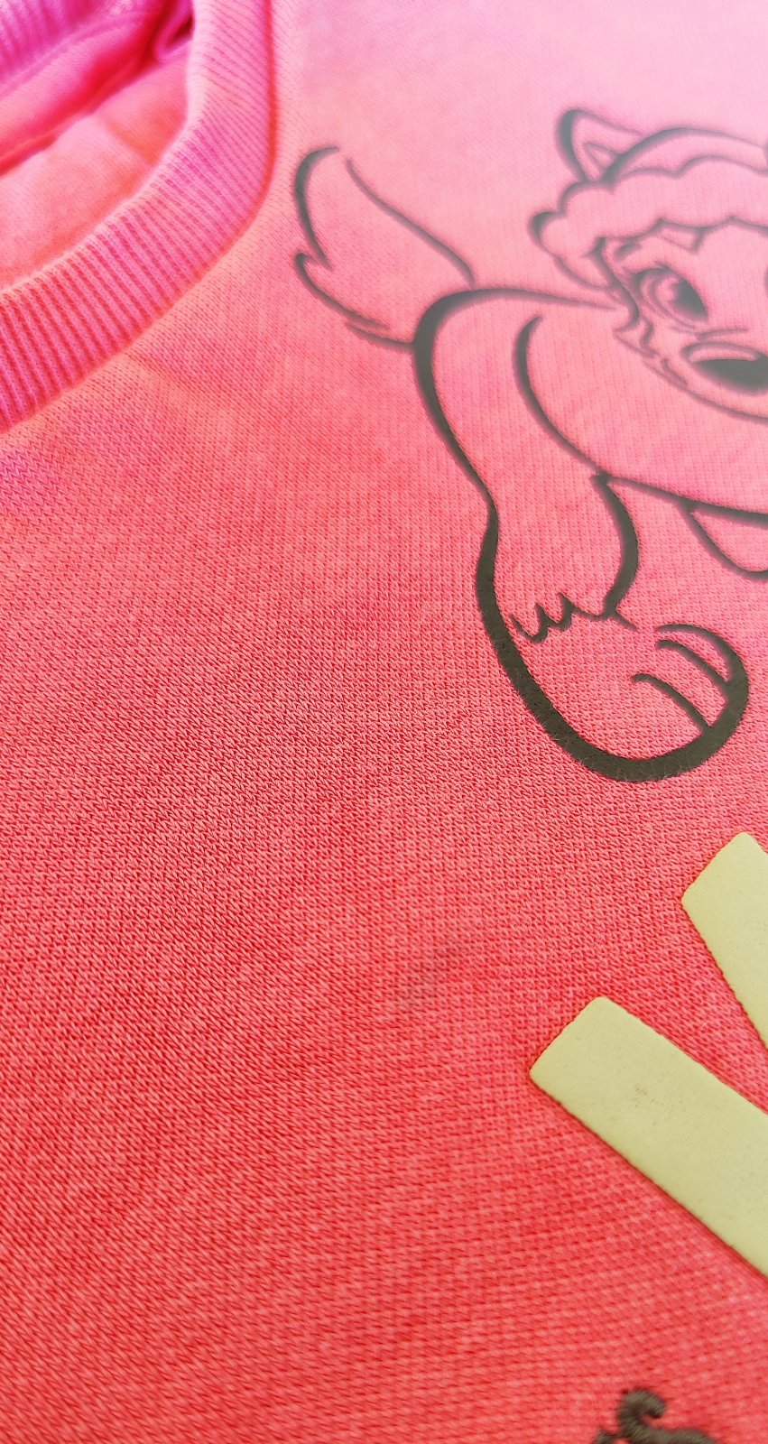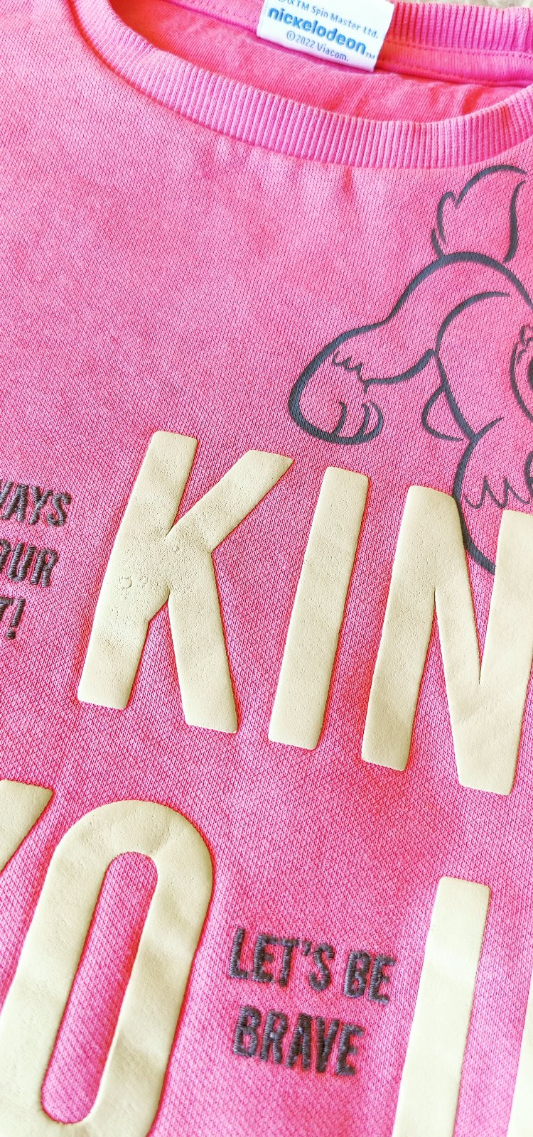 Mikina s motivom labkova patrola. Je skor na donosenie, sem-tam zapraty fliacik, alebo pretlacena potlac (vid foto). Nie je to nejake strasne a clovek, co nevie, ze ma hladat fliacik si ho nevsimne.