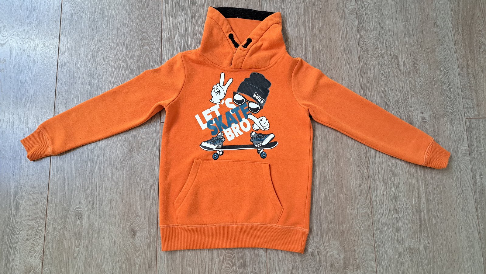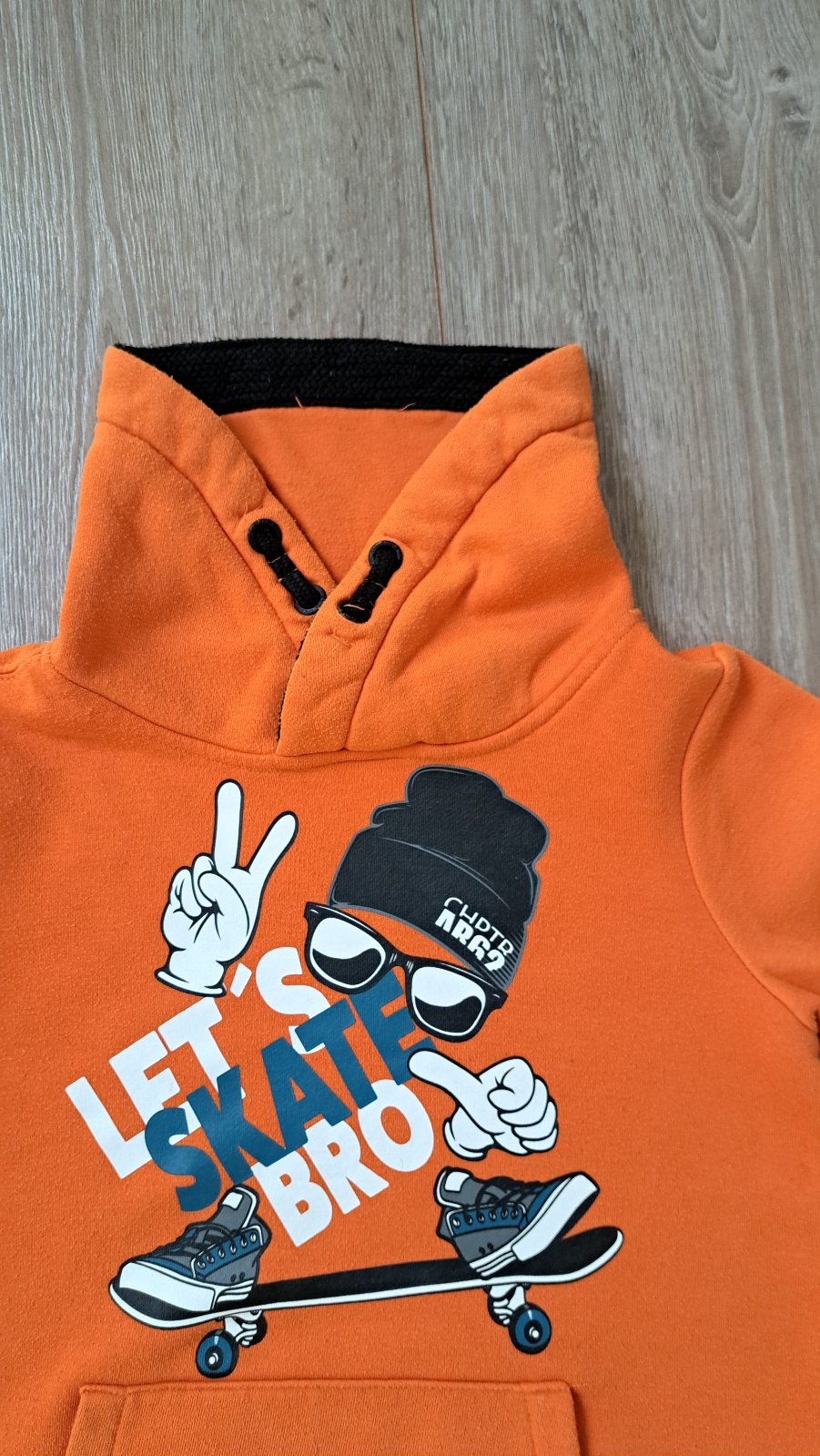 Oranžová mikina s potlačou s vysokým stojačikom. Veľkosť som dala 128 odhadom, nemáme už visačku.