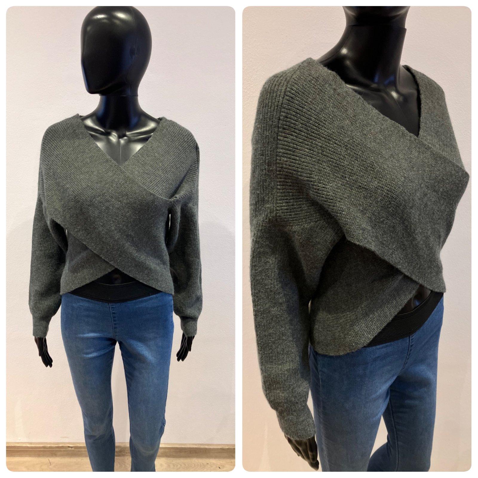 Dámsky hrubý sveter, huňatý, s prekríženým strihom, krátky, elastický, materiál 45%akryl 28%polyamid 27%polyester.