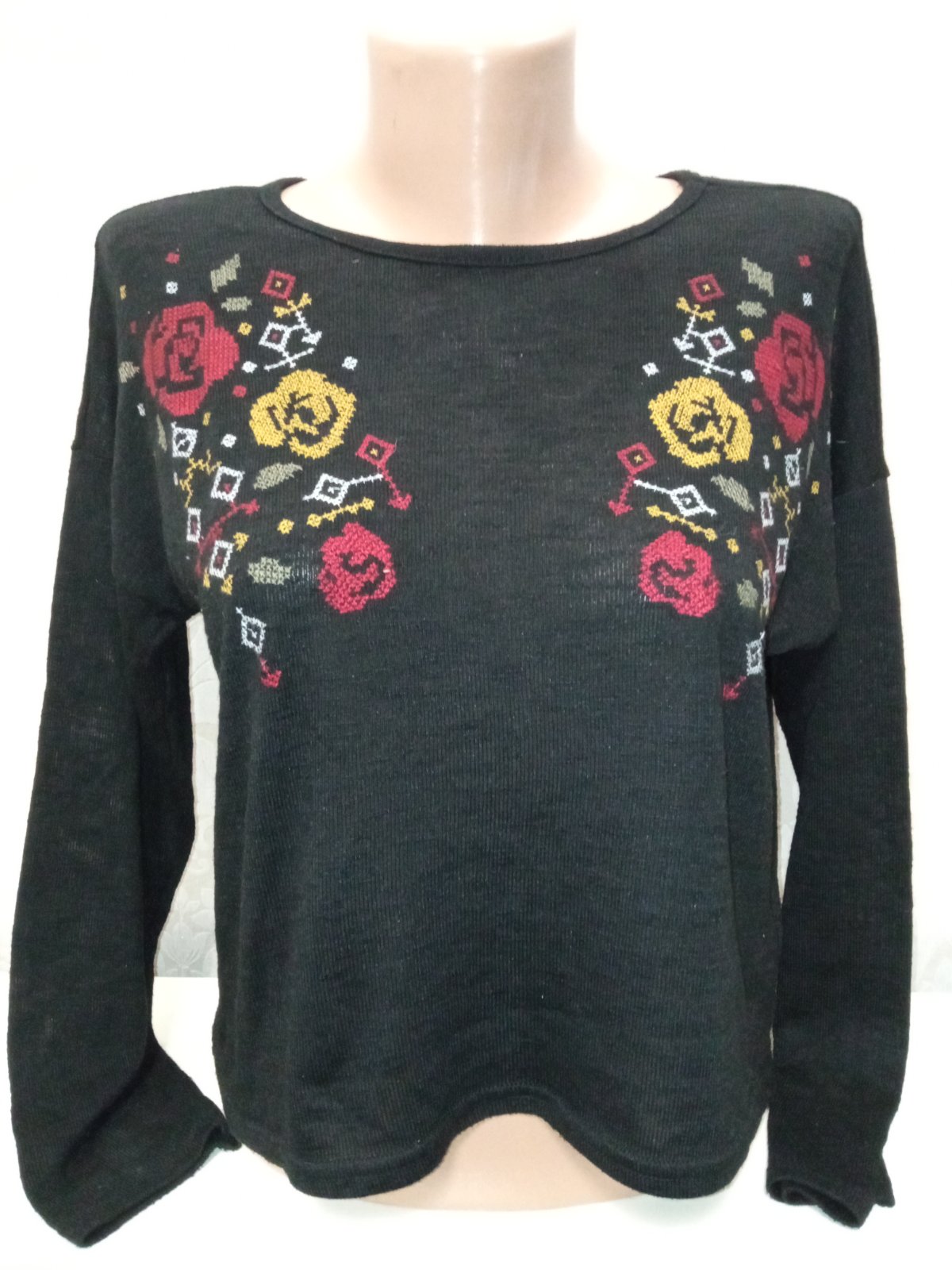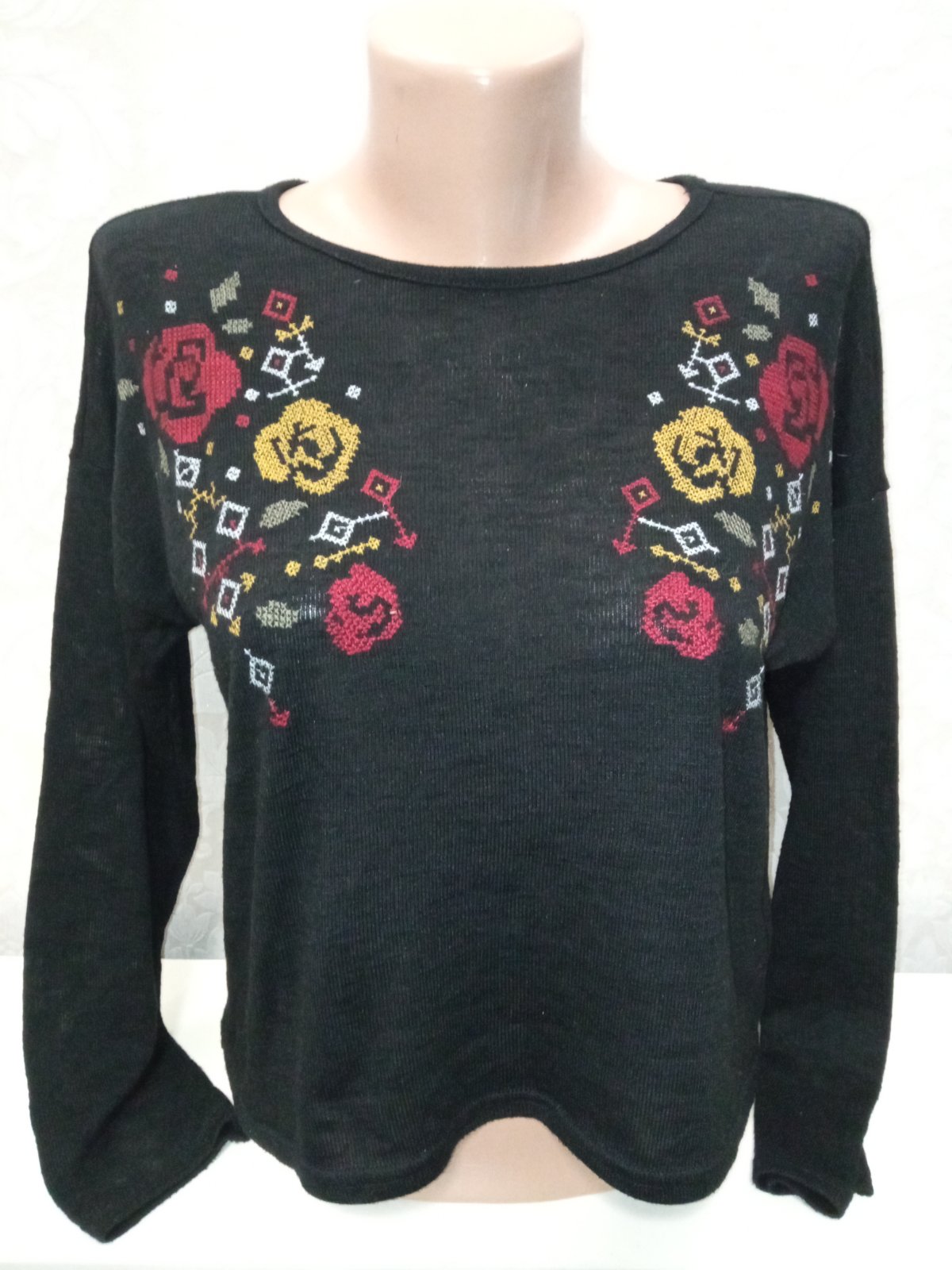 Dievčenský krátky svetrík s vyšívaným vzorom, tenký, elastický, okrúhly výstrih, farba čierna.