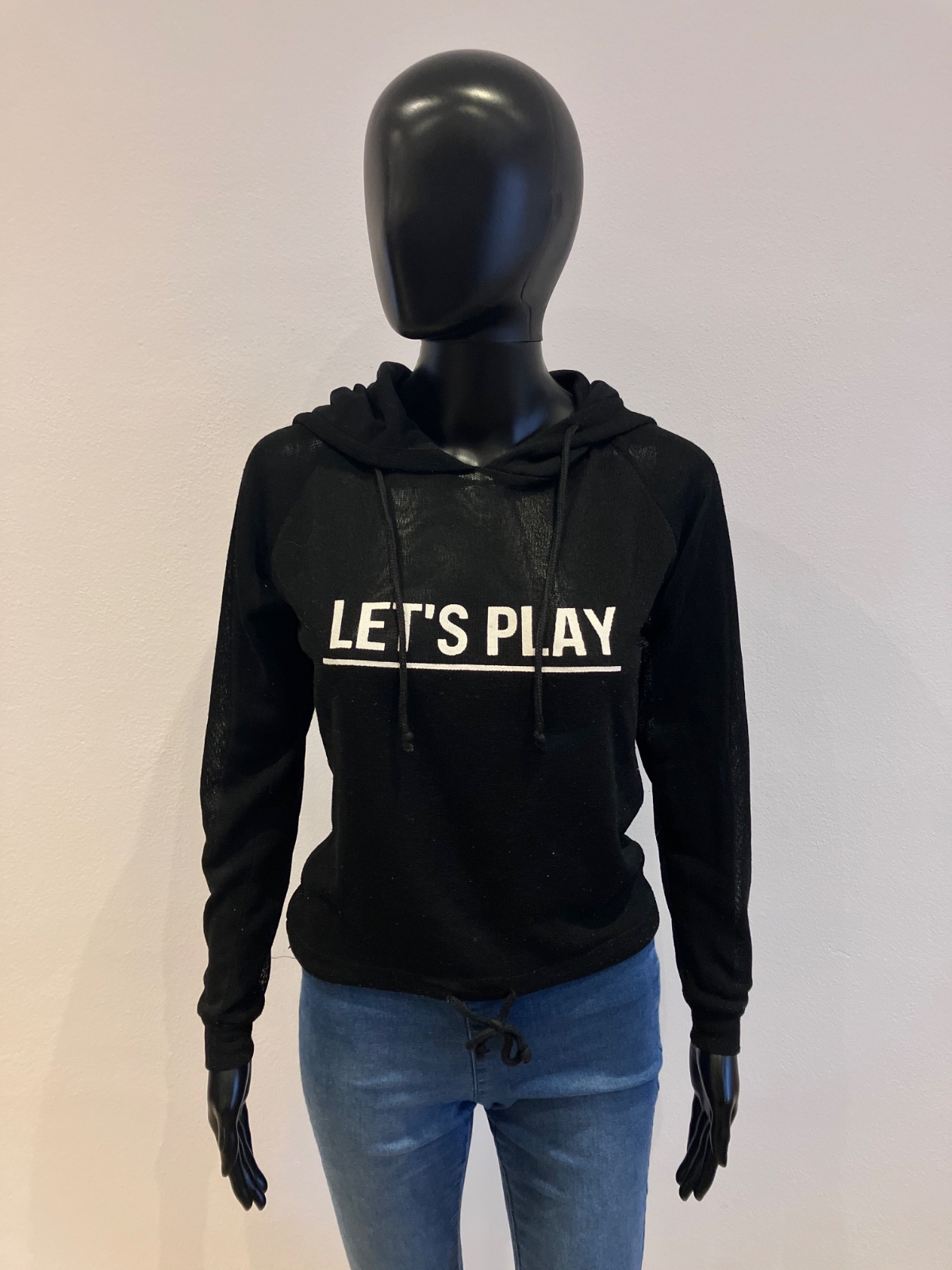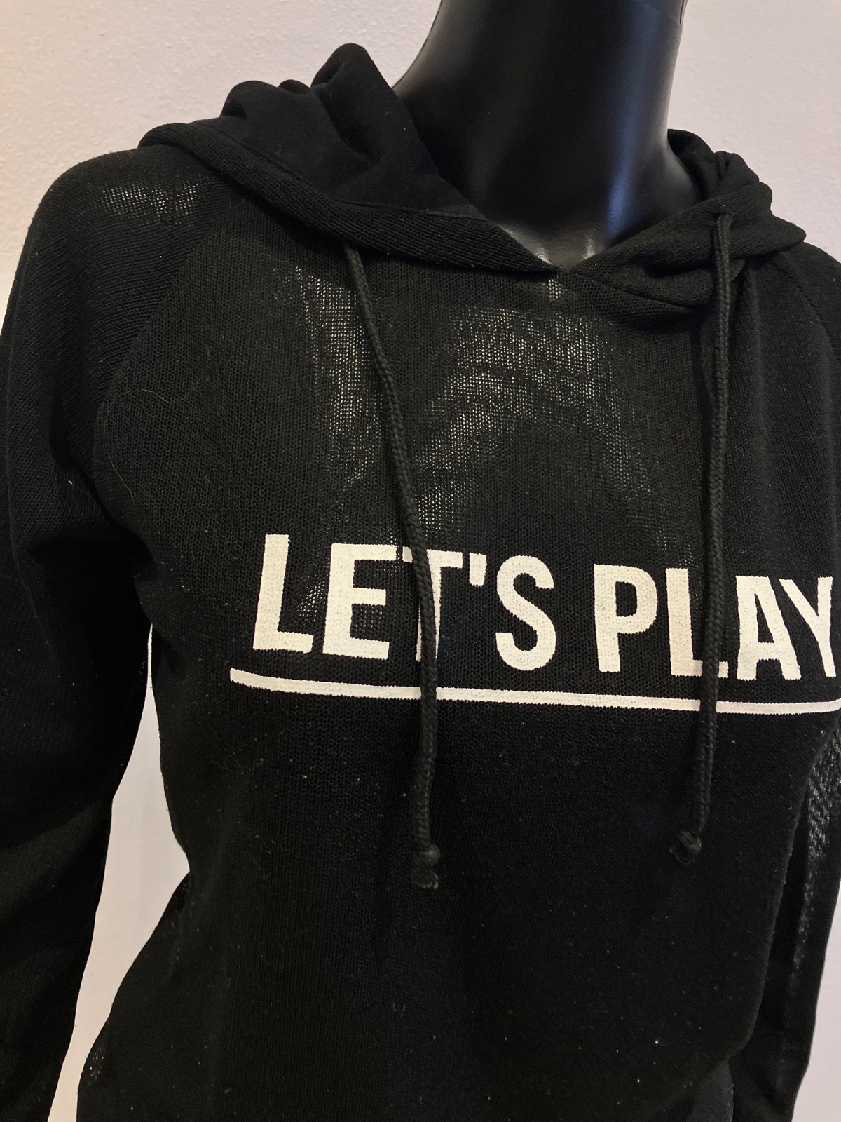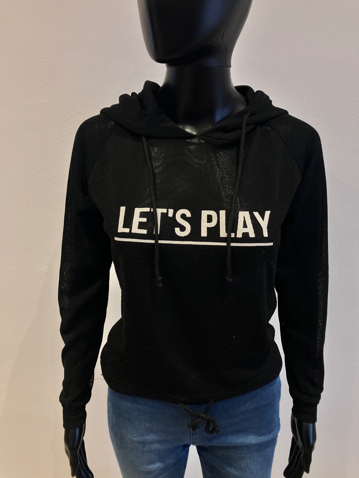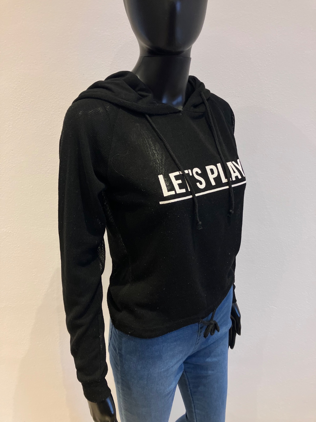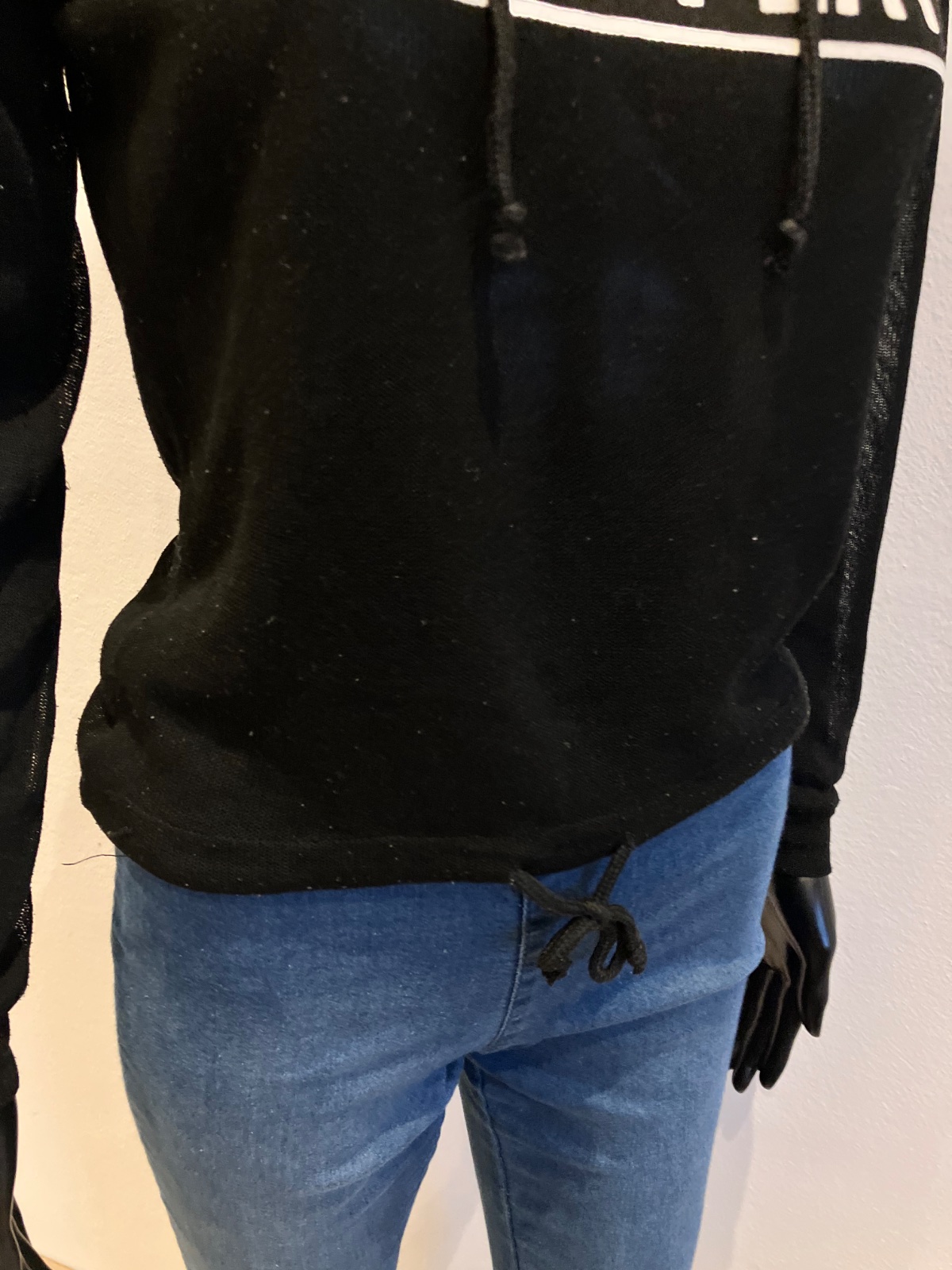 Tenký priesvitný sveter s kapucňou, dlhý rukáv, nápis, kapucňa a spodok so zaväzovaním, elastický.