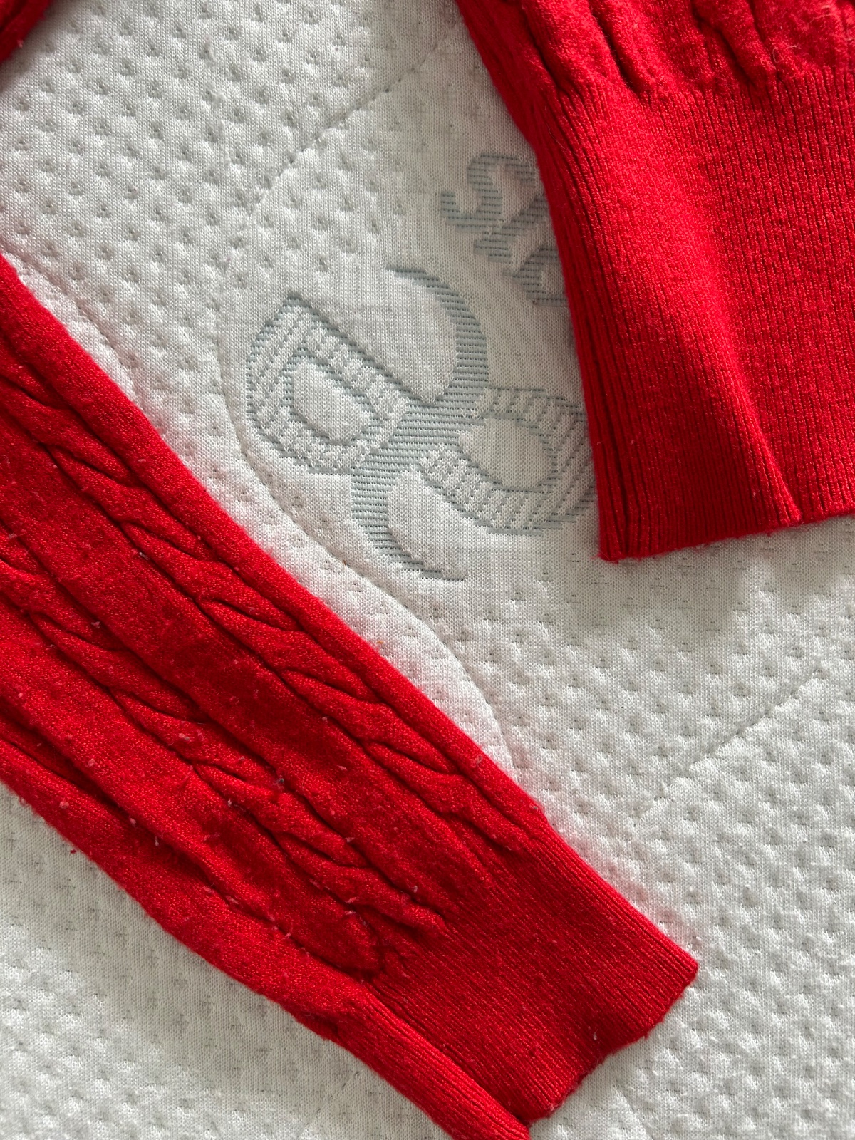 syta cervena, eladticky, zmolky na rukavoch z vnutornej strany hlavne ale idu dole