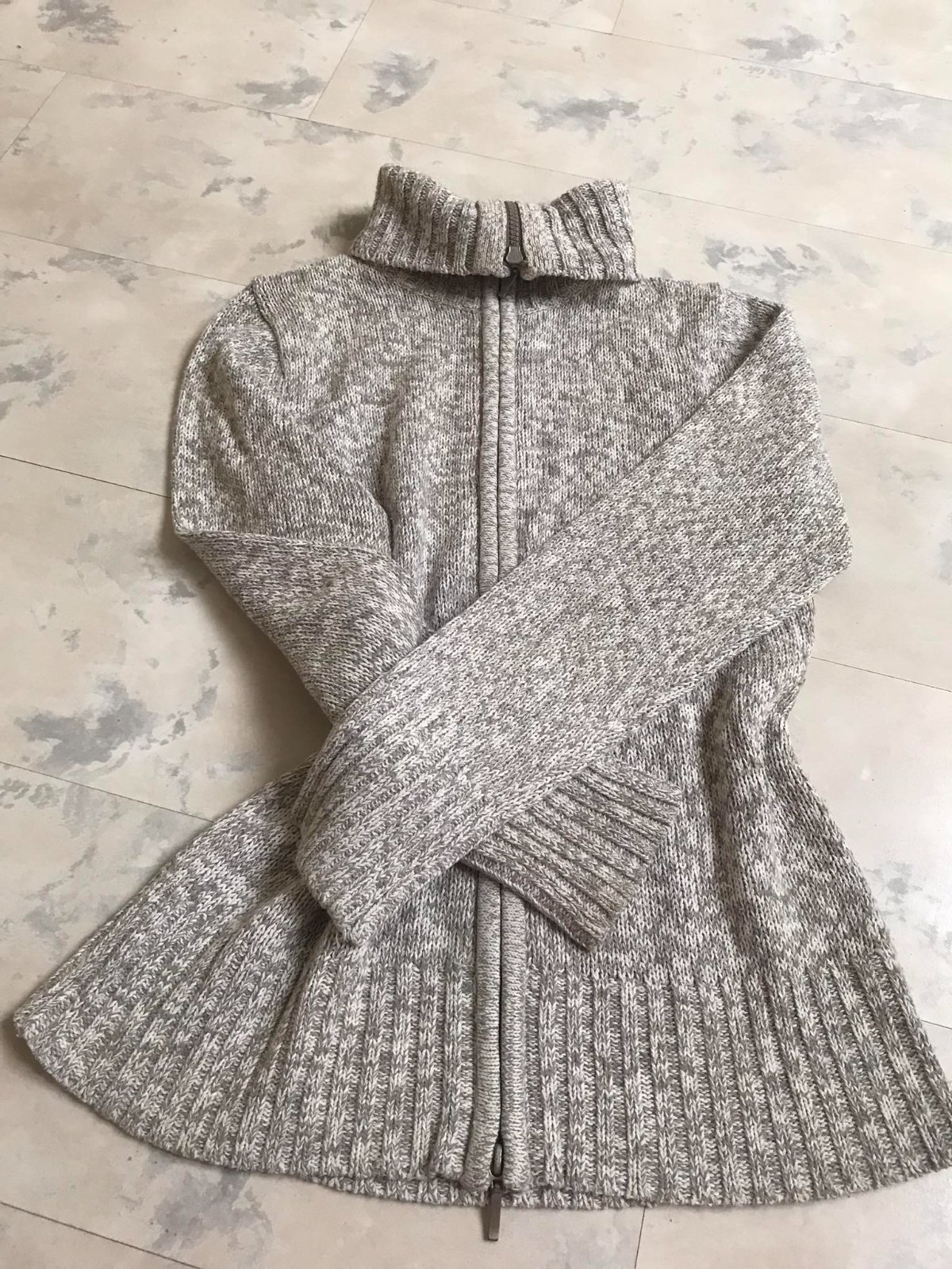 moderný taliansky svetrík,top stav a kvalita,neznosený,obojstranný zips,kvalitný úplet - nehryzie,krásny moderný melír striekanýs bielou,uvedená veľkosť S,ale vhodné aj na M,dlžka = 65 cm,dlžka od pazuchy dole = 42 cm,šírka = 46 x 2 cm, ramená = 9 cm, rukáv = 62 cm,materiál 100% polyacryl