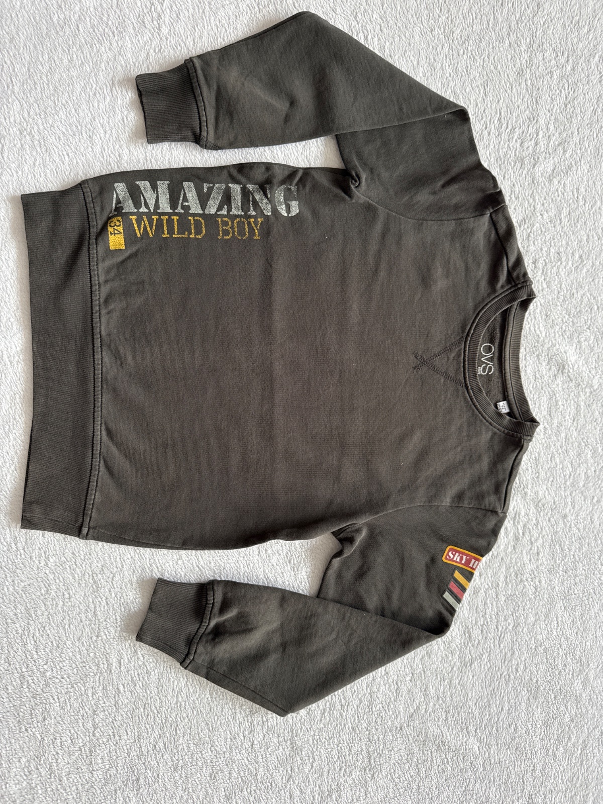 OVS mikina,velkost pisana 134 ale sedi na 122/128. Oteplena jemnym chlpkom. Nosena malo, bez poskodeni. Dlzka od ramena 47cm, sirka 40cm, rukav od krku 53 cm.