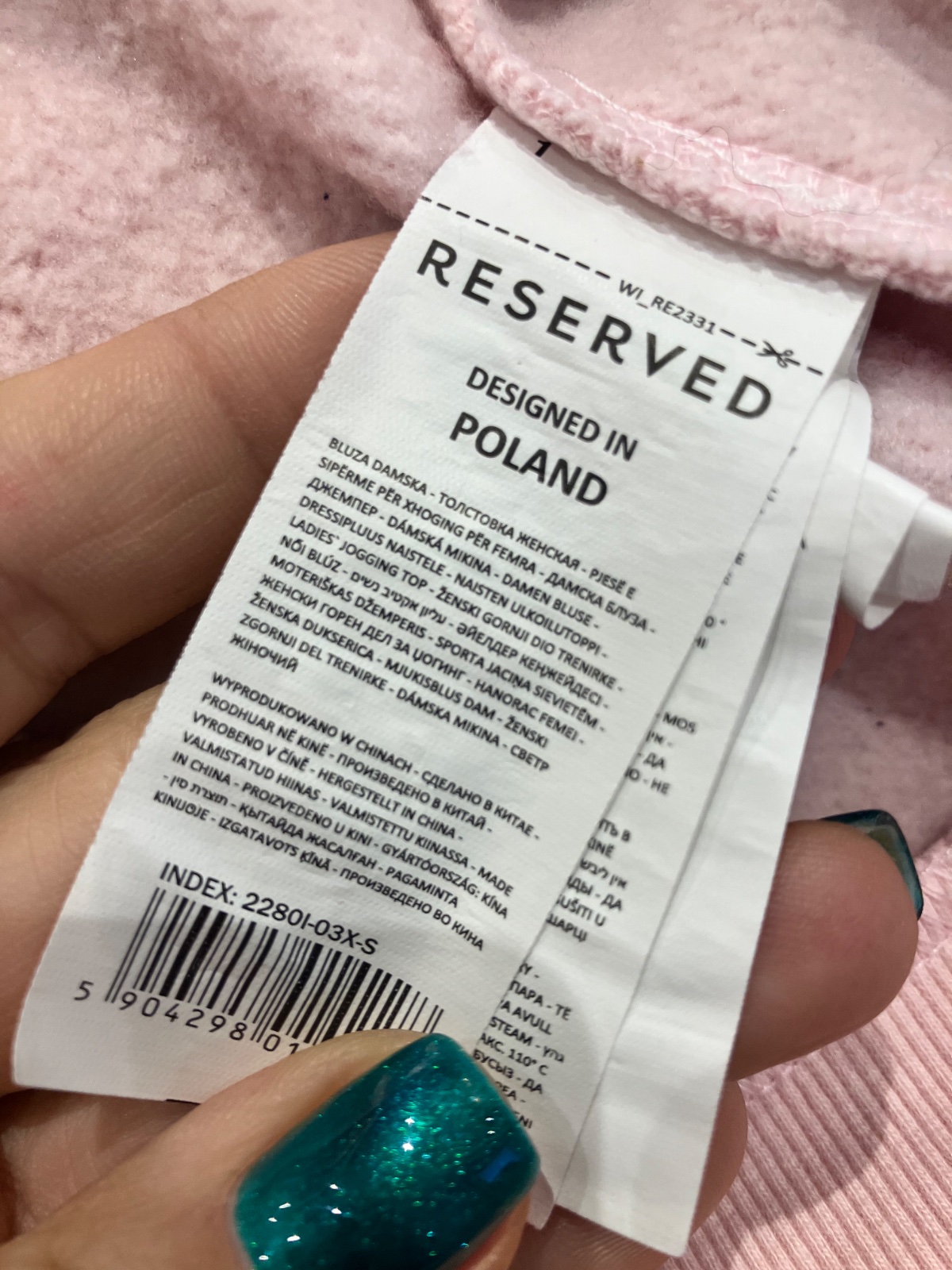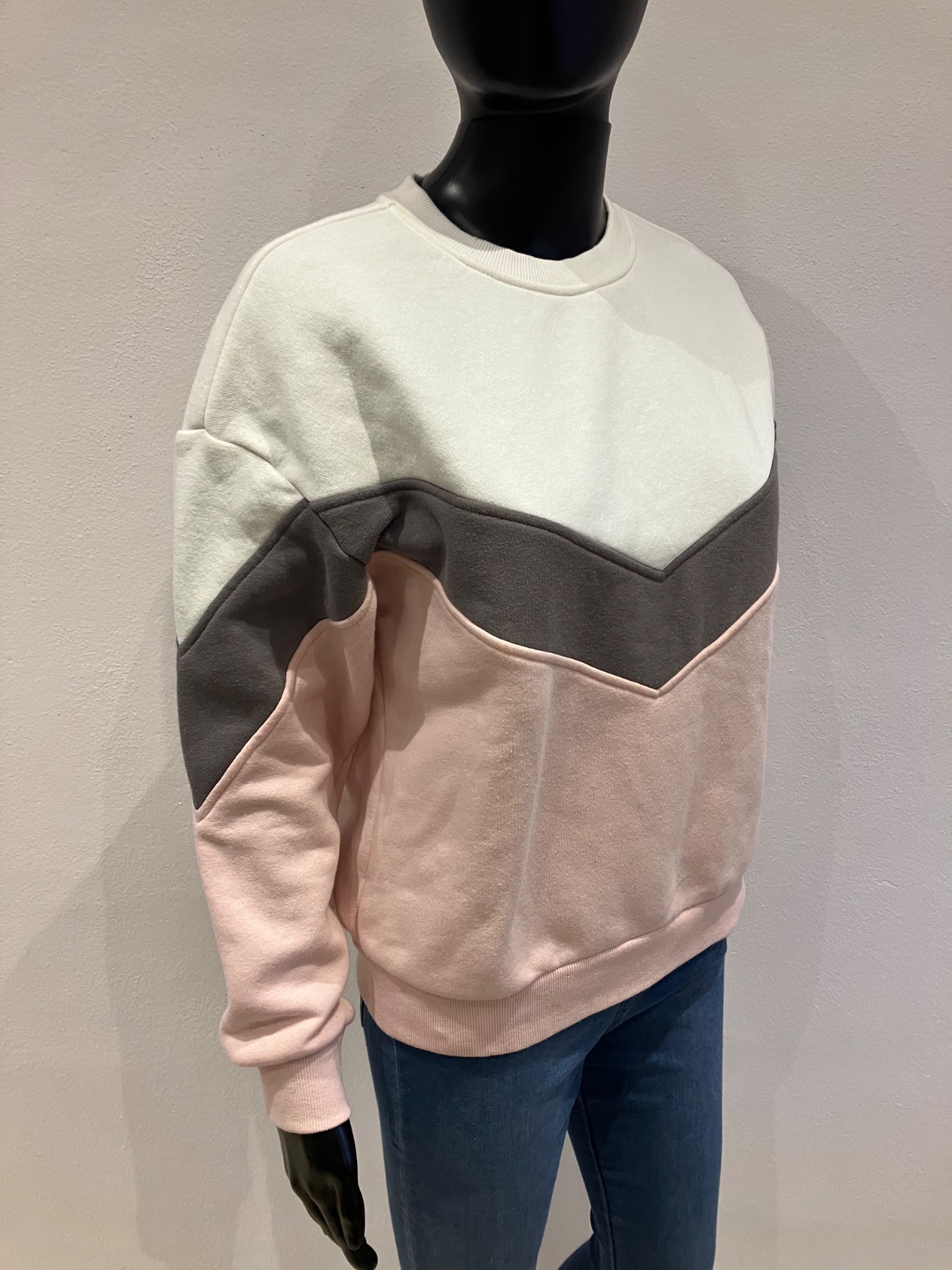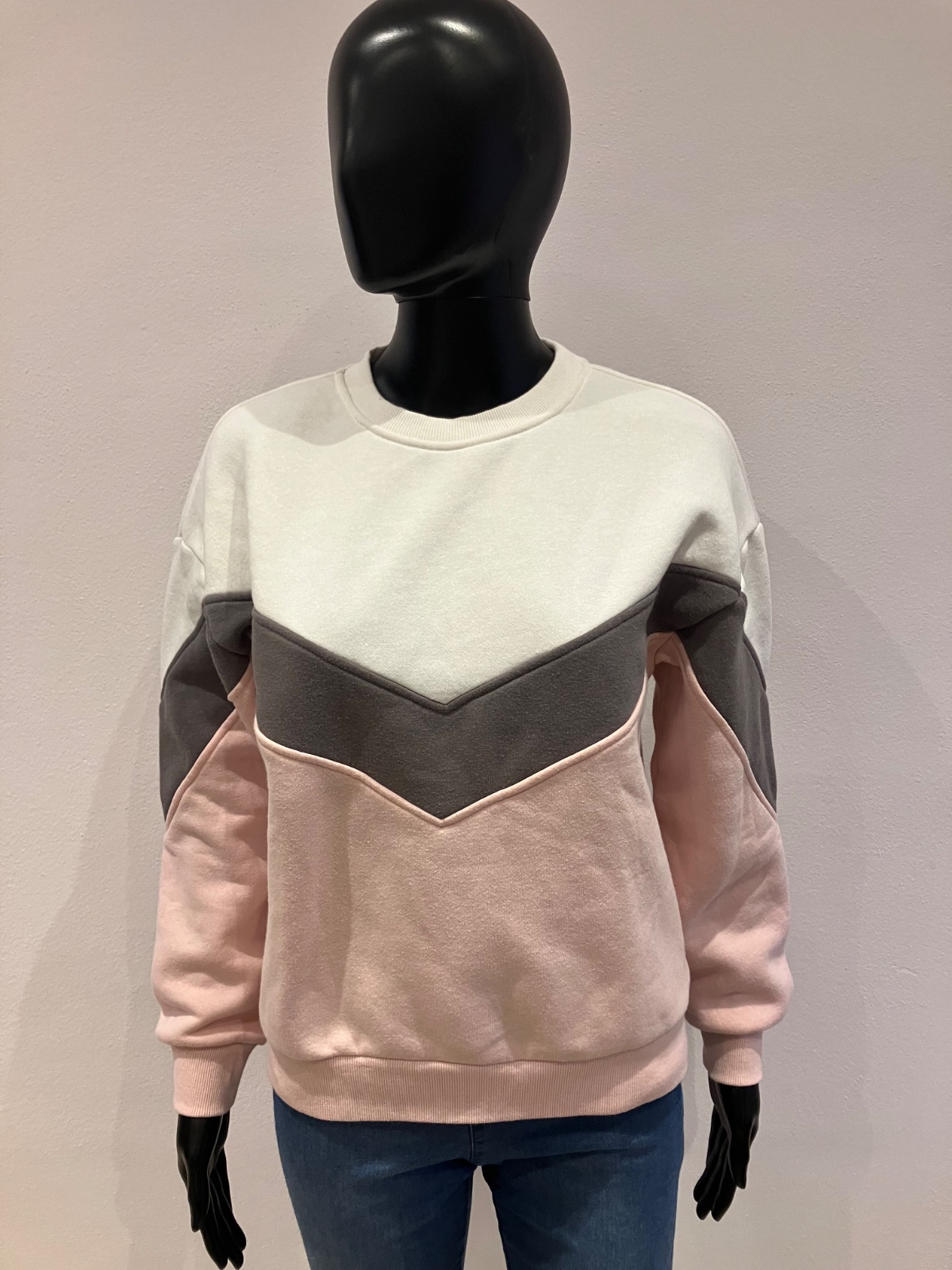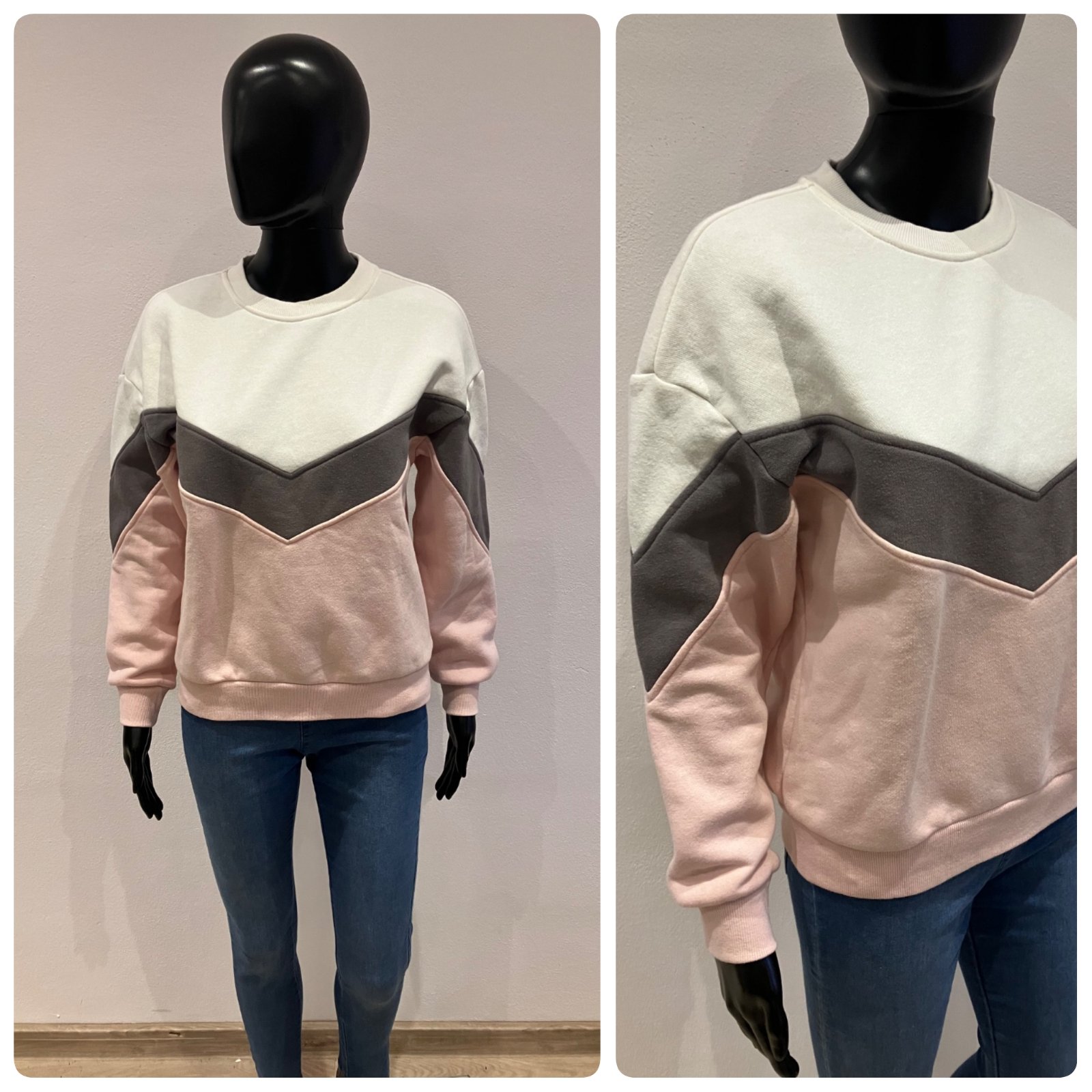 Dámska mikina, okrúhly výstrih, vo vnútri jemný flís, jemne elastická, farba bielo-ružovo-sivá.