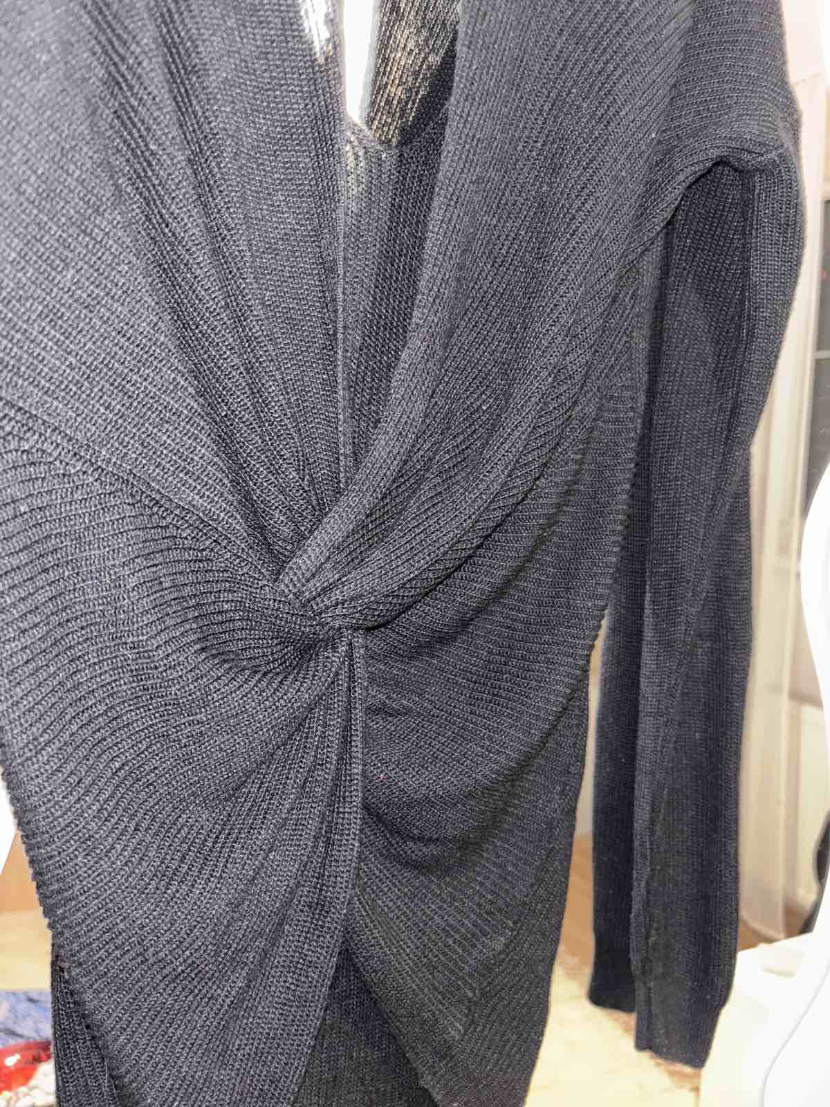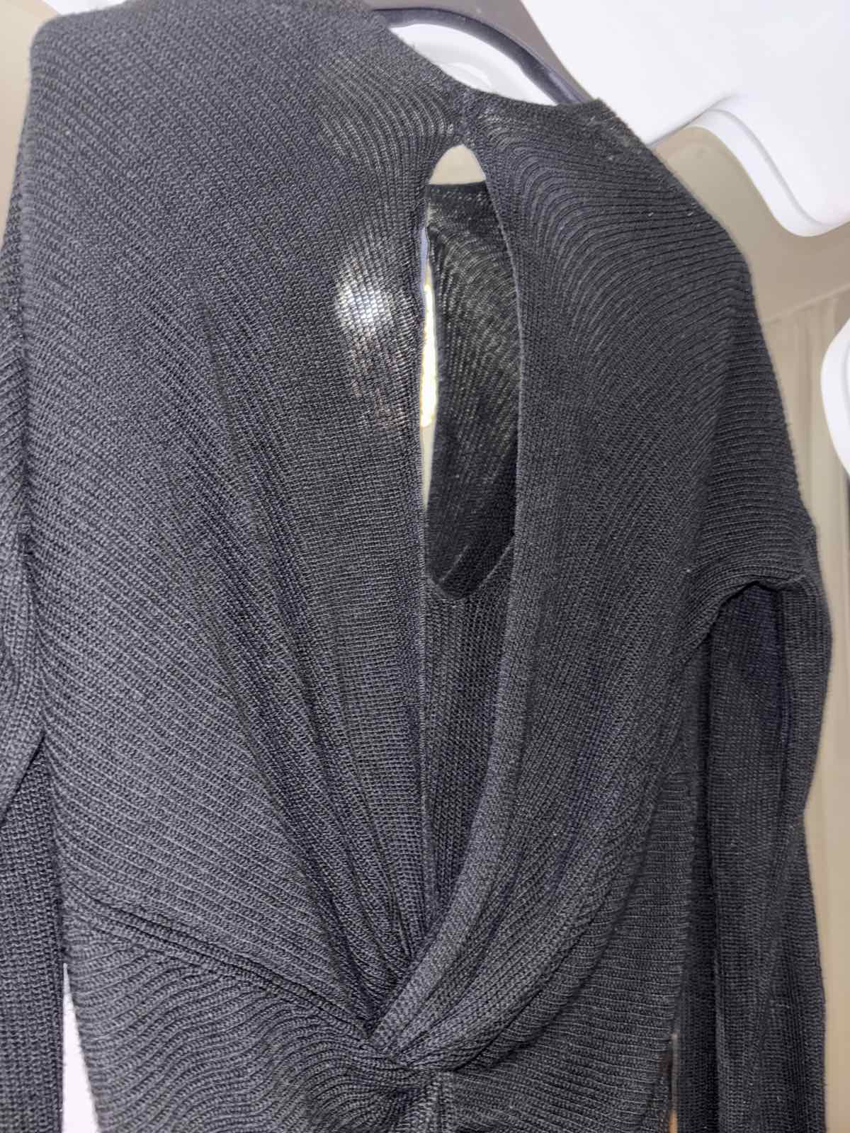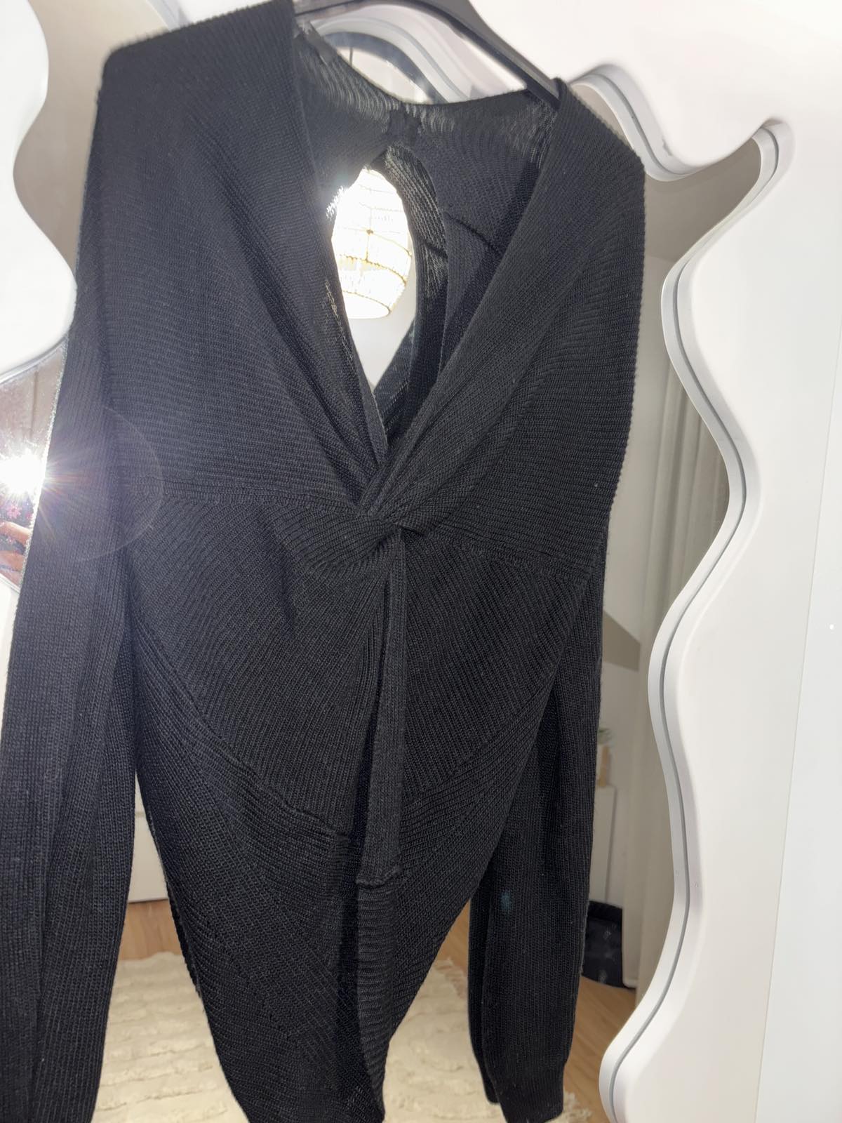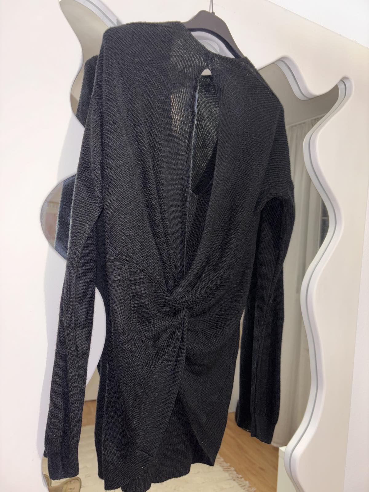 Výborný stav, čierny, pružný, výstrih vpredu aj vzadu, uzol vzadu, veľkosť XS, skôr S, s.pod pazuchami cca 50 cm, d. 73 cm